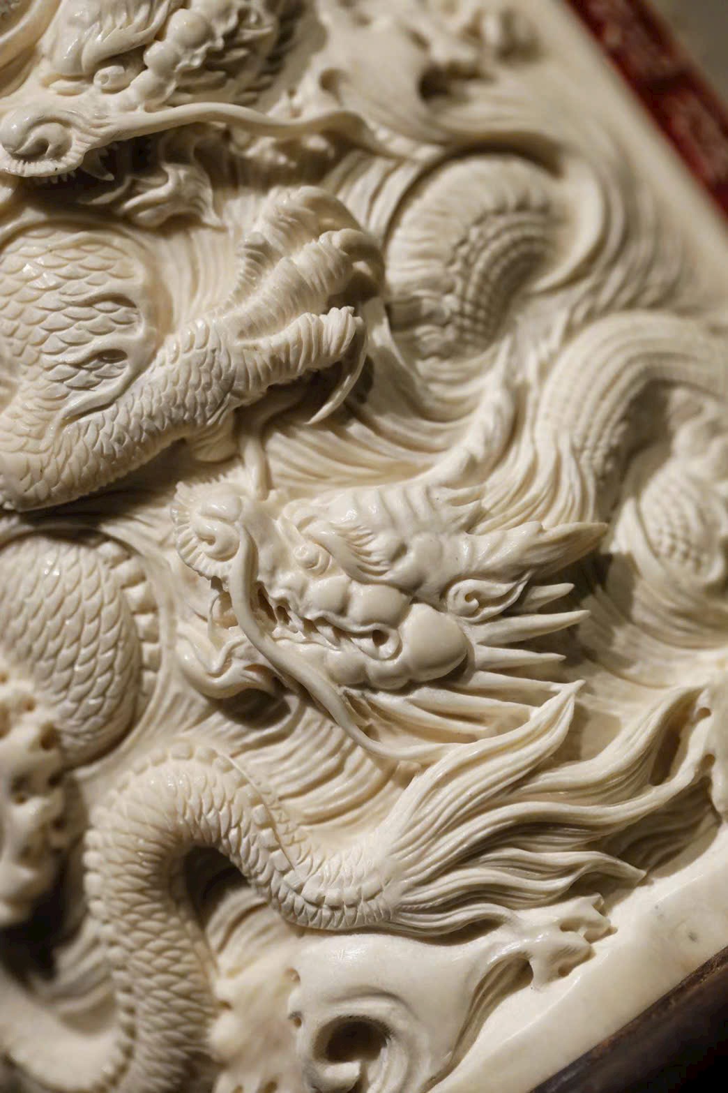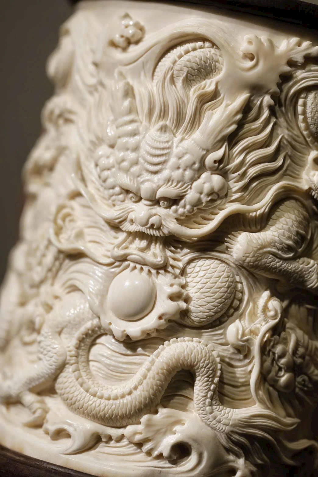 Chất liệu ấm mịn, tinh tế. Toàn thân chạm phù điêu kín với hình tượng chín rồng, thân rồng khỏe khoắn uốn lượn, vảy và móng hiện rõ từng chi tiết. Họa tiết mây biển chồng lớp bao quanh, khí thế hùng tráng.