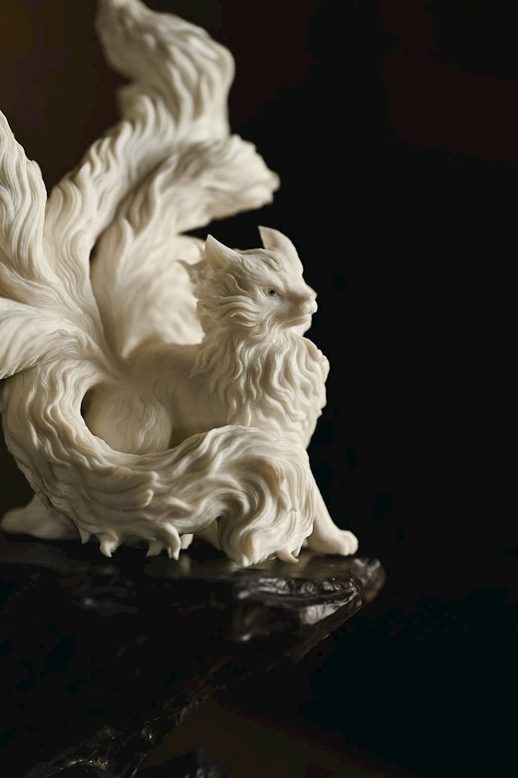 Chế tác từ khối nguyên liệu lớn, chạm khắc thủ công tinh tế. Cửu Vĩ Hồ trong tư thế ngồi chồm, đầu hơi ngẩng, ánh mắt linh động sắc như lửa. Chín chiếc đuôi dài xòe mềm mại như dải lụa, đường nét uyển chuyển, thanh thoát.