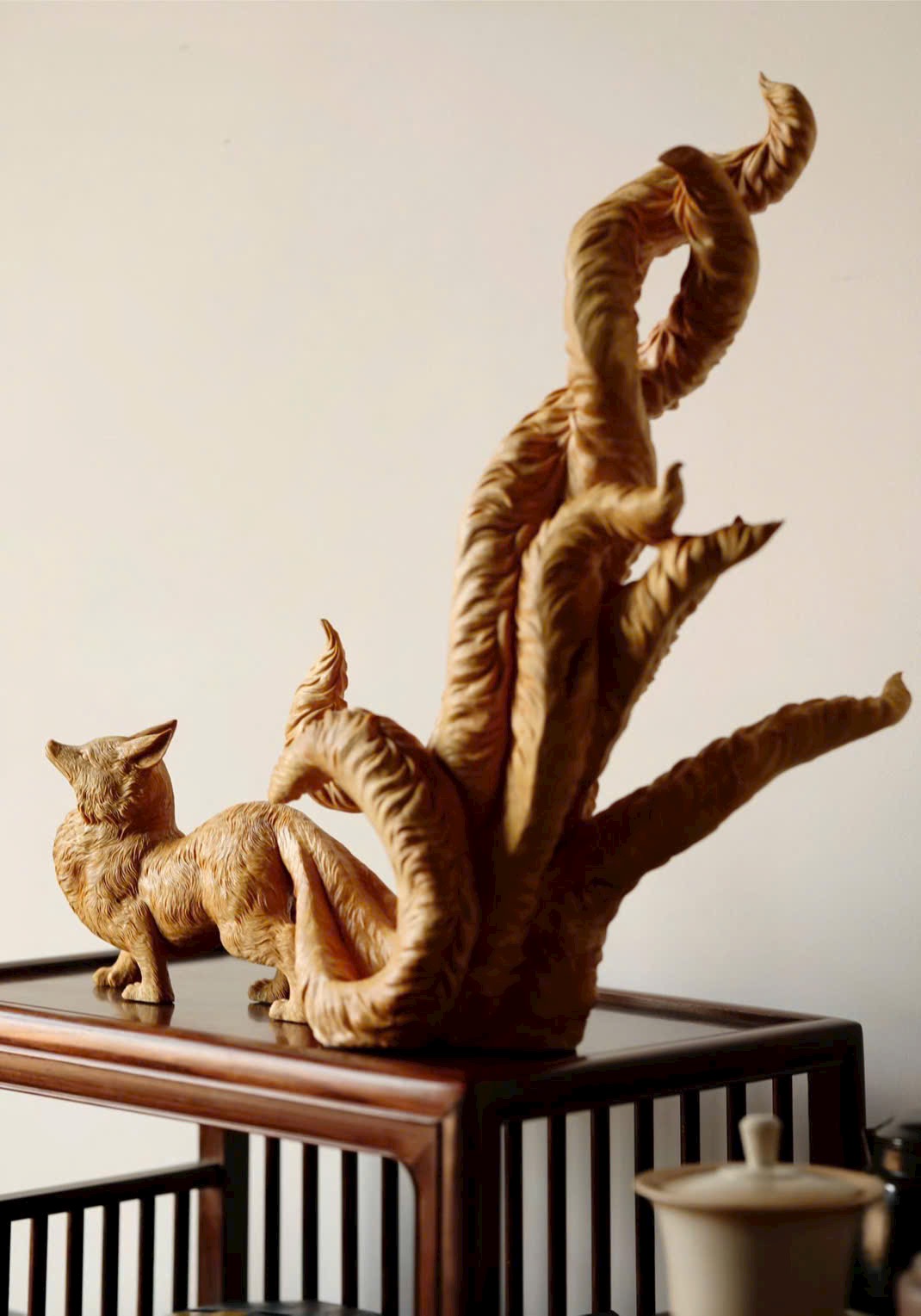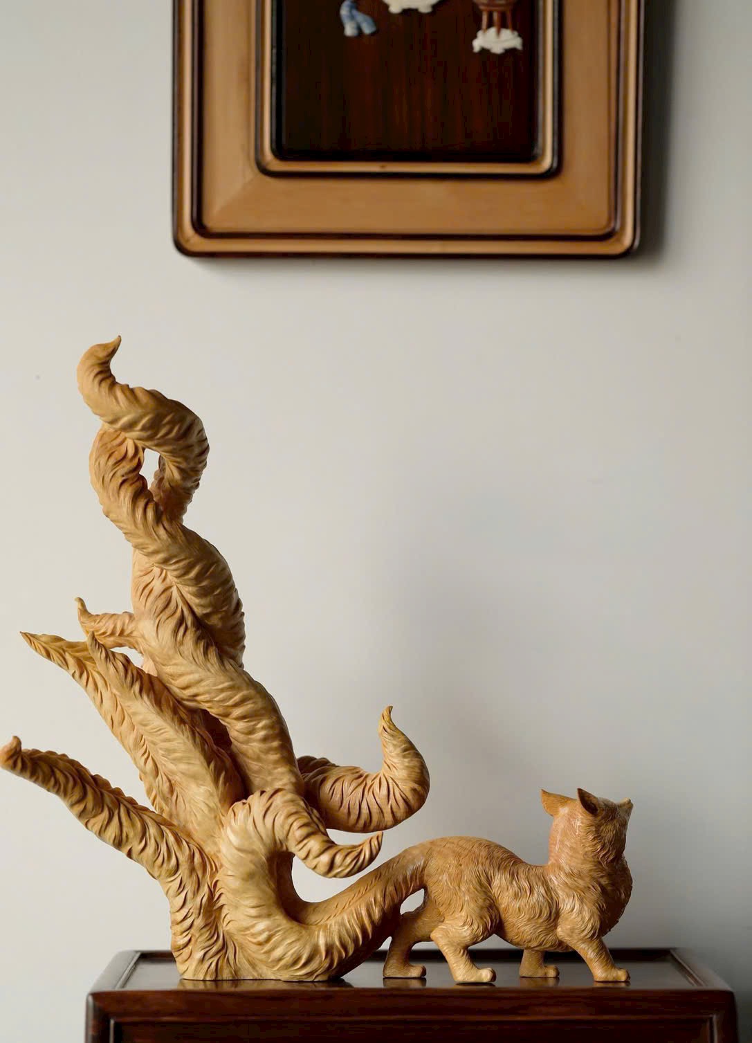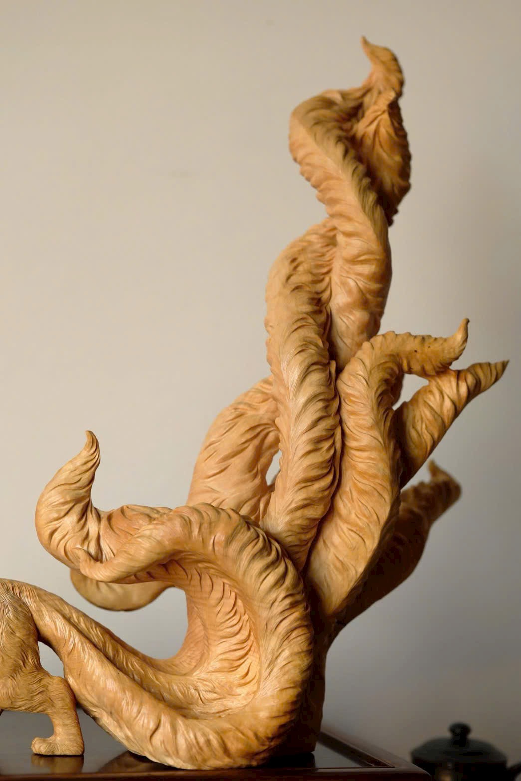 Tác phẩm sử dụng khối gỗ hoàng dương lá nhỏ nguyên khối, không vết đen, vô cùng quý hiếm, do danh sư thủ công chế tác. Bằng kỹ nghệ điêu khắc tinh xảo, nghệ nhân khắc họa dáng hồ linh hoạt sinh động: thân thể uyển chuyển, kết cấu cơ bắp và lớp lông được thể hiện tinh tế, từng sợi đều rõ ràng như có thể chạm thấy.