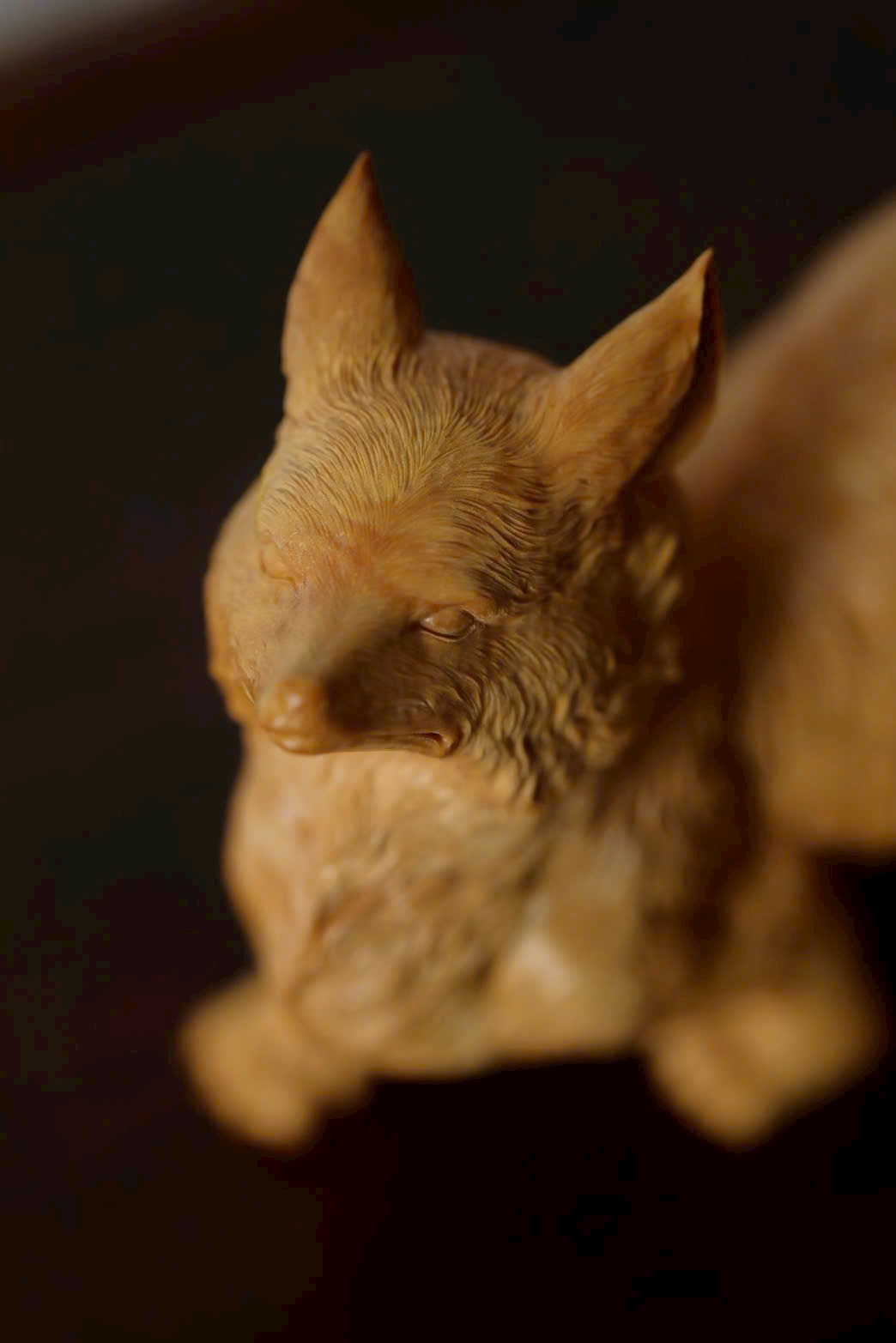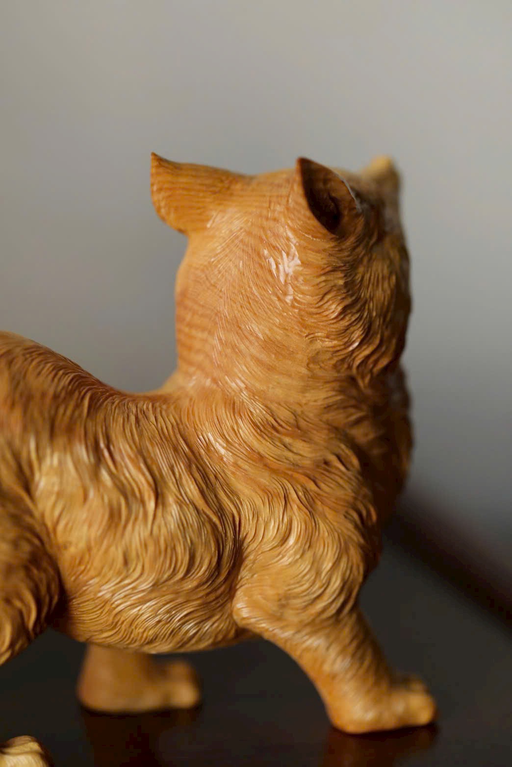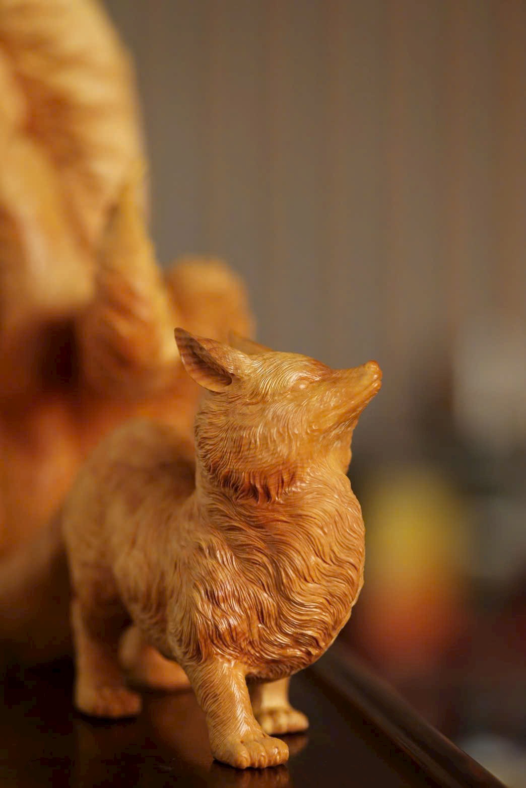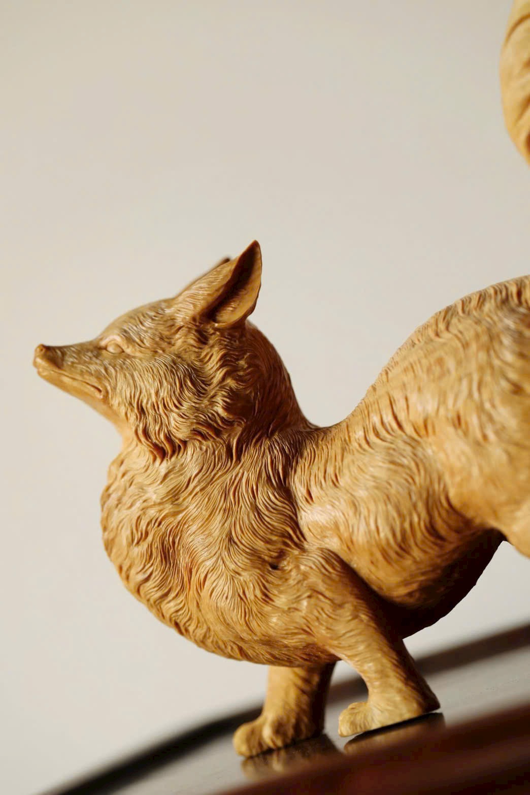 Tác phẩm sử dụng khối gỗ hoàng dương lá nhỏ nguyên khối, không vết đen, vô cùng quý hiếm, do danh sư thủ công chế tác. Bằng kỹ nghệ điêu khắc tinh xảo, nghệ nhân khắc họa dáng hồ linh hoạt sinh động: thân thể uyển chuyển, kết cấu cơ bắp và lớp lông được thể hiện tinh tế, từng sợi đều rõ ràng như có thể chạm thấy.
