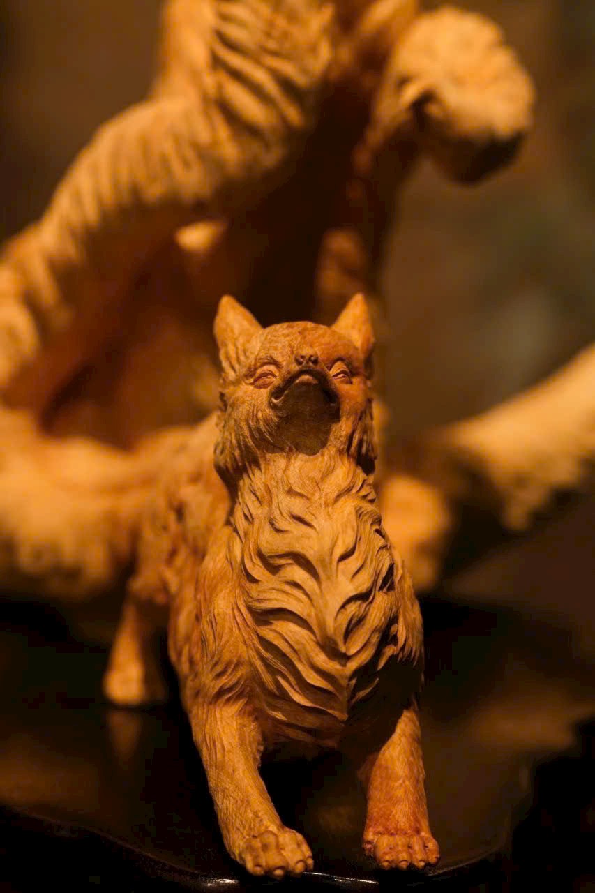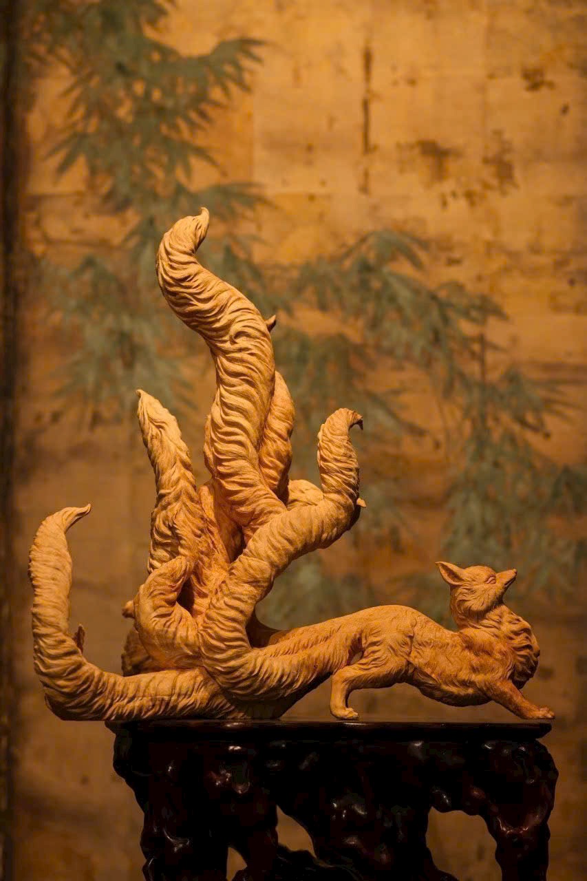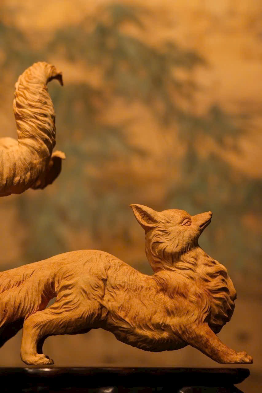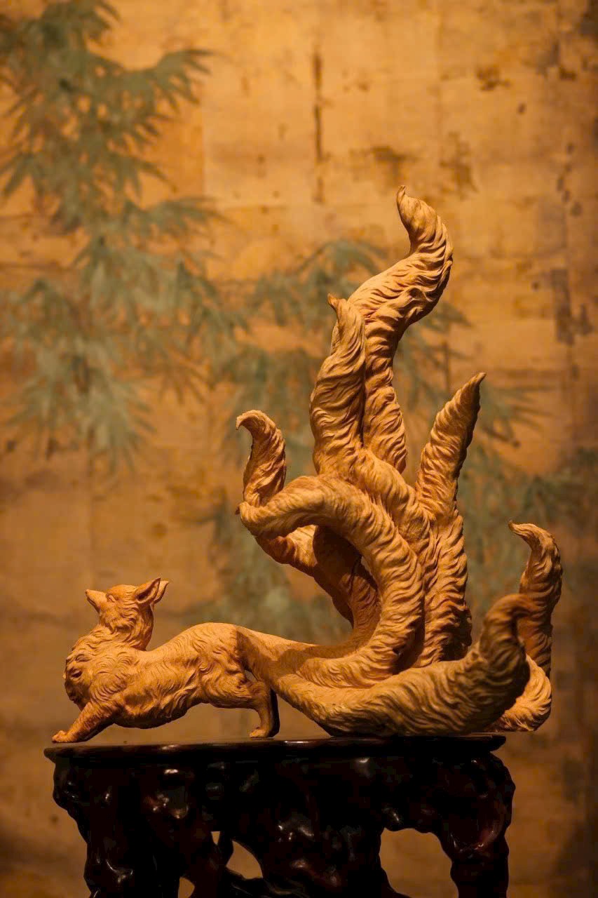 Hồ ly chín đuôi chạm khắc tinh xảo, lông mịn như thật, đuôi uốn mềm mại như mây. Tượng trưng trí tuệ, may mắn, mang ý nghĩa phúc lành – bình an quanh năm.