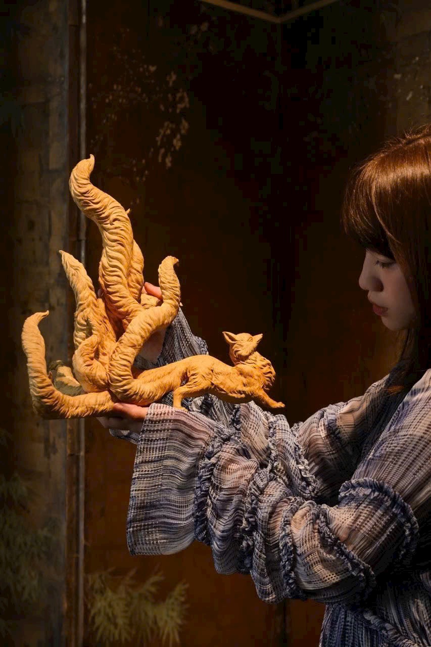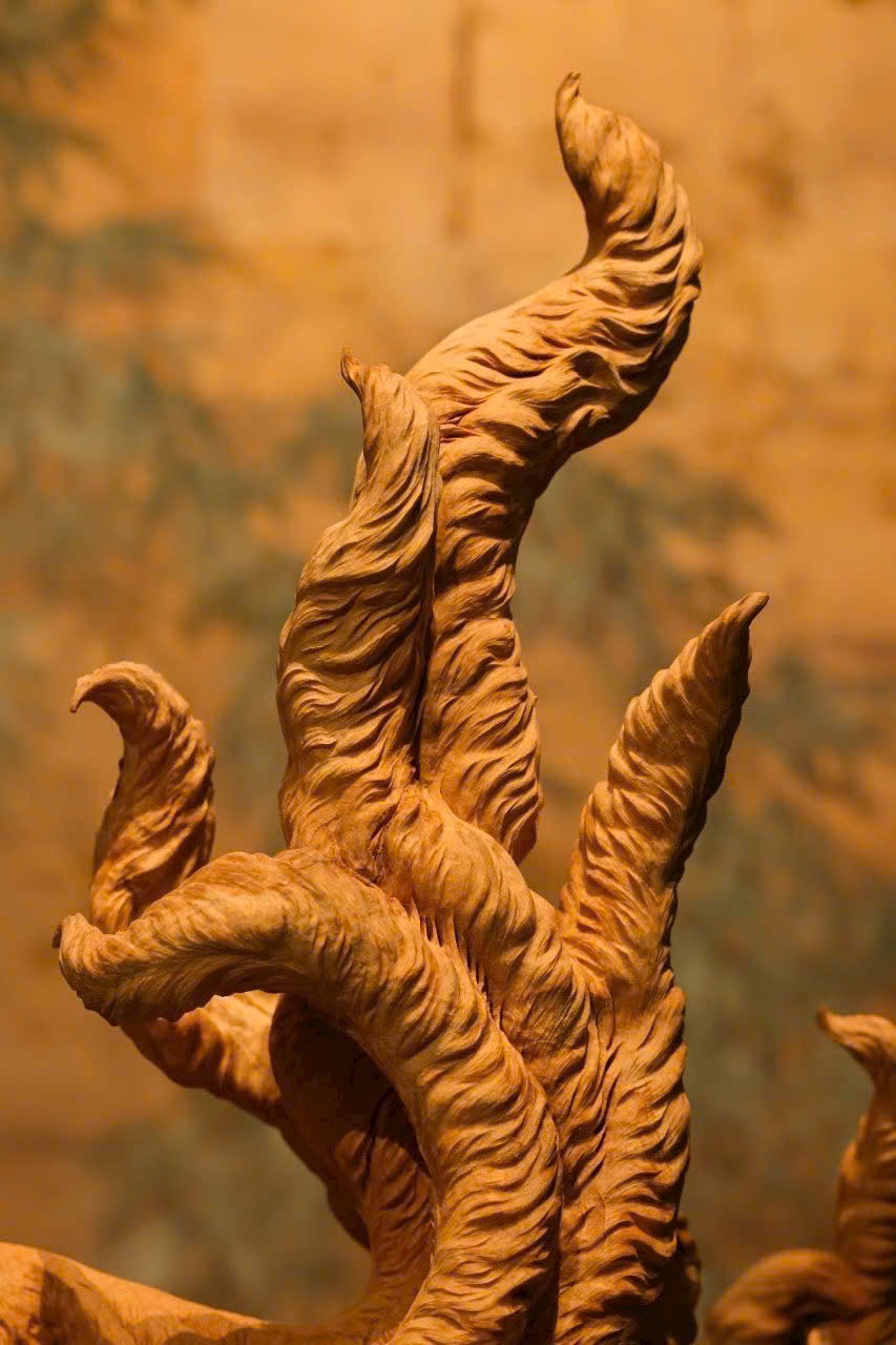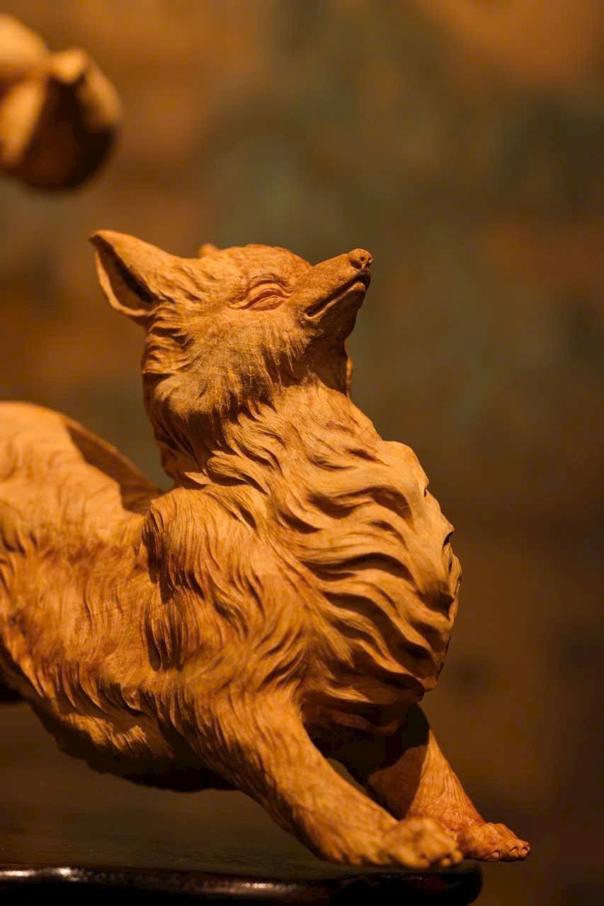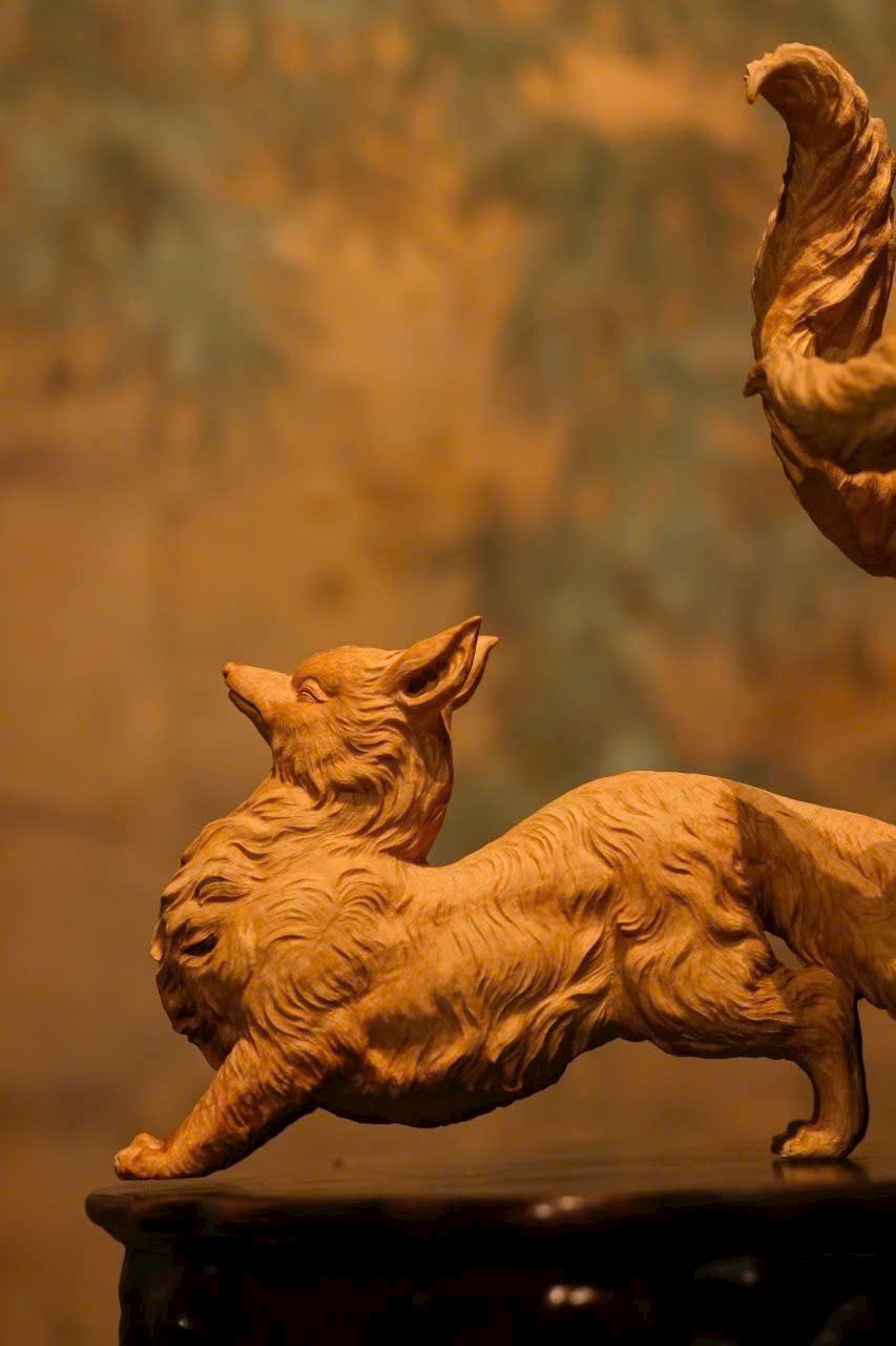 Hồ ly chín đuôi chạm khắc tinh xảo, lông mịn như thật, đuôi uốn mềm mại như mây. Tượng trưng trí tuệ, may mắn, mang ý nghĩa phúc lành – bình an quanh năm.
