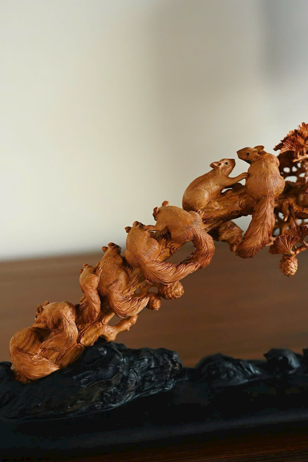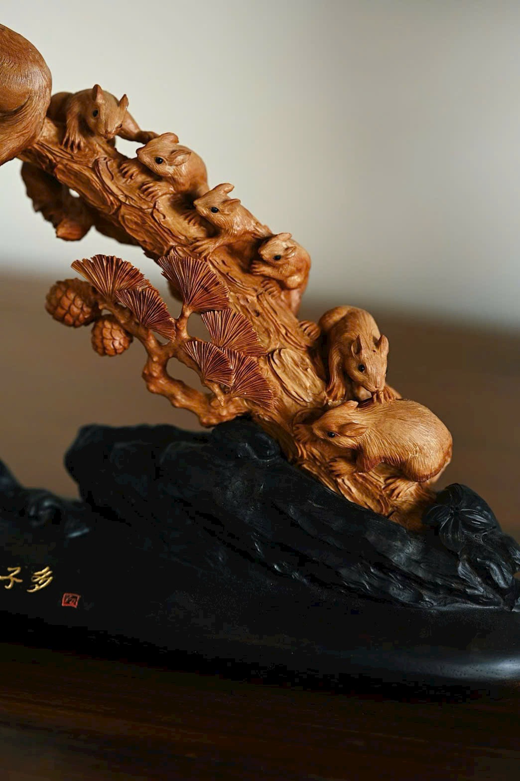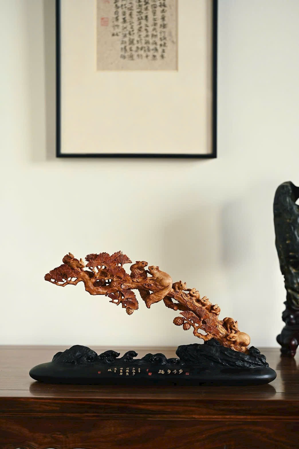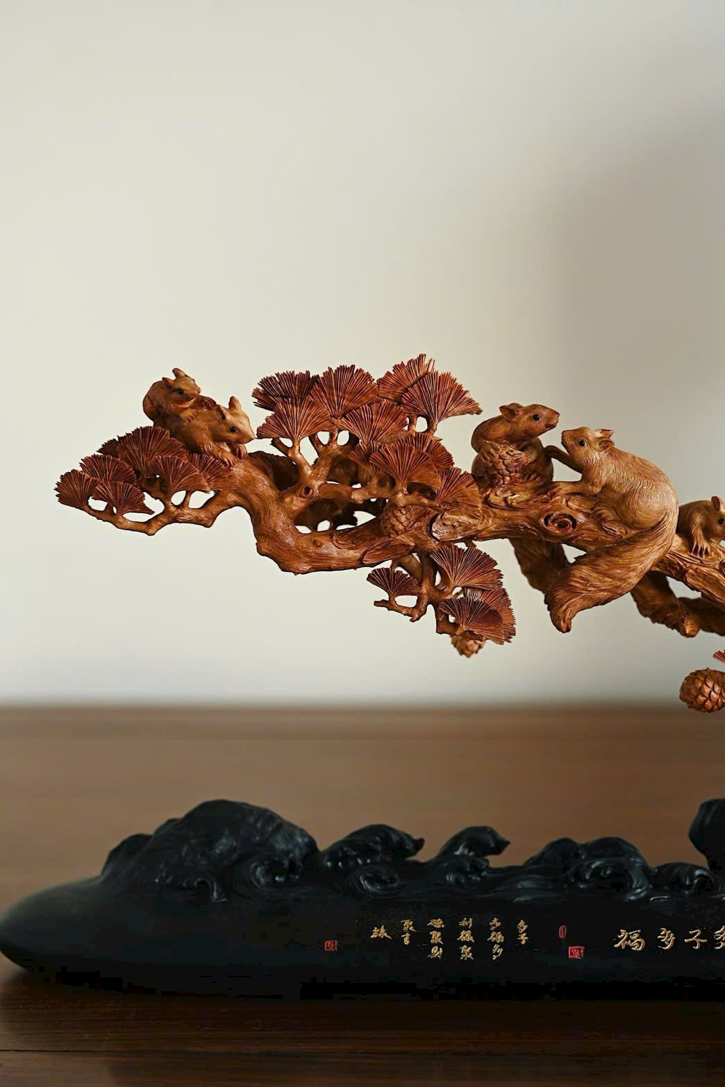 Nguyên khối chạm khắc tinh xảo, bầy sóc sinh động như thật, cành tùng bên sườn vững chắc, tượng trưng tùng xanh bền bỉ. Hàm ý con đàn cháu đống, phúc lộc viên mãn. Bày nơi án thư, đem lại sự hòa hợp và hạnh phúc cho gia đình.