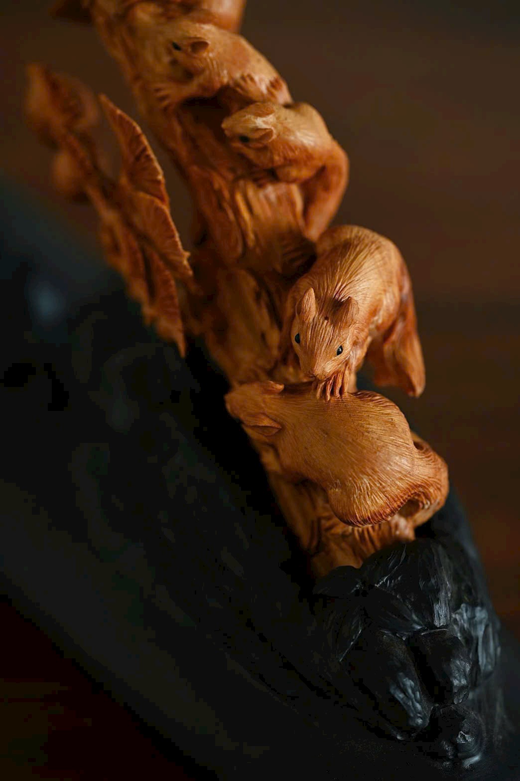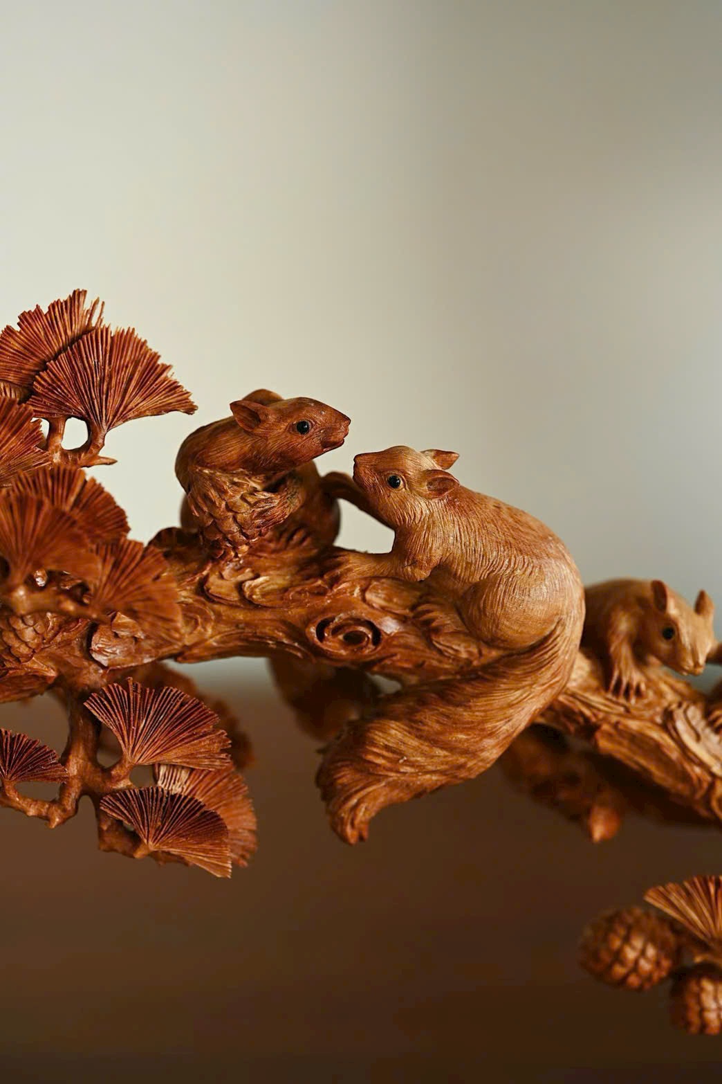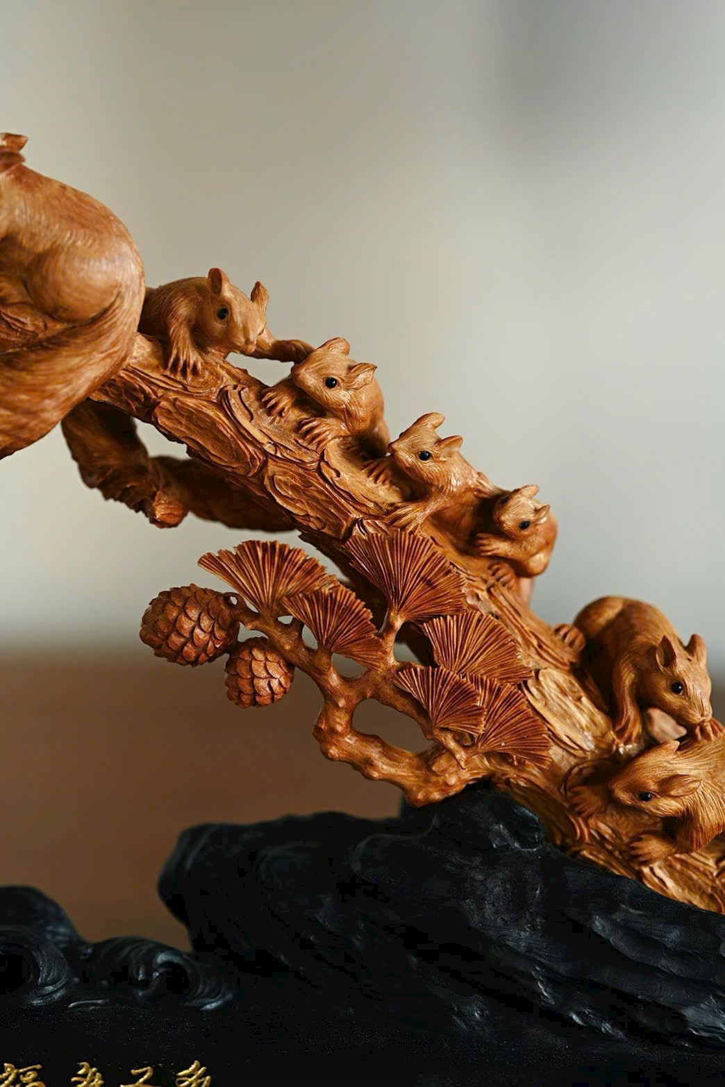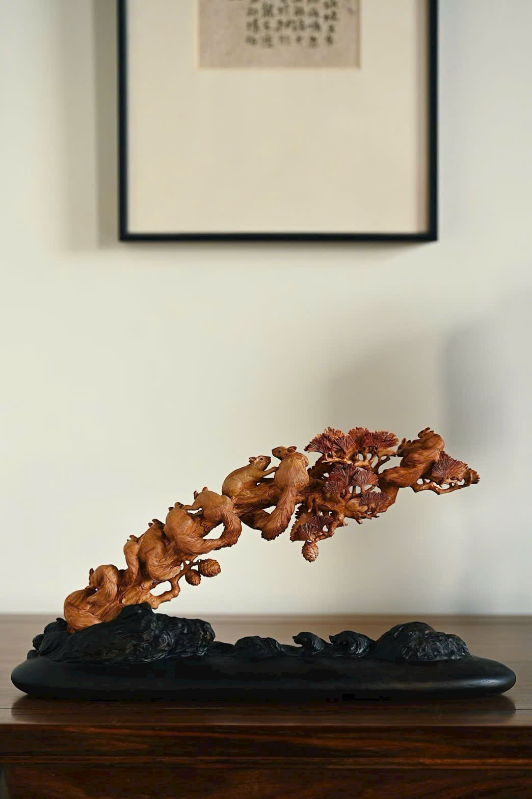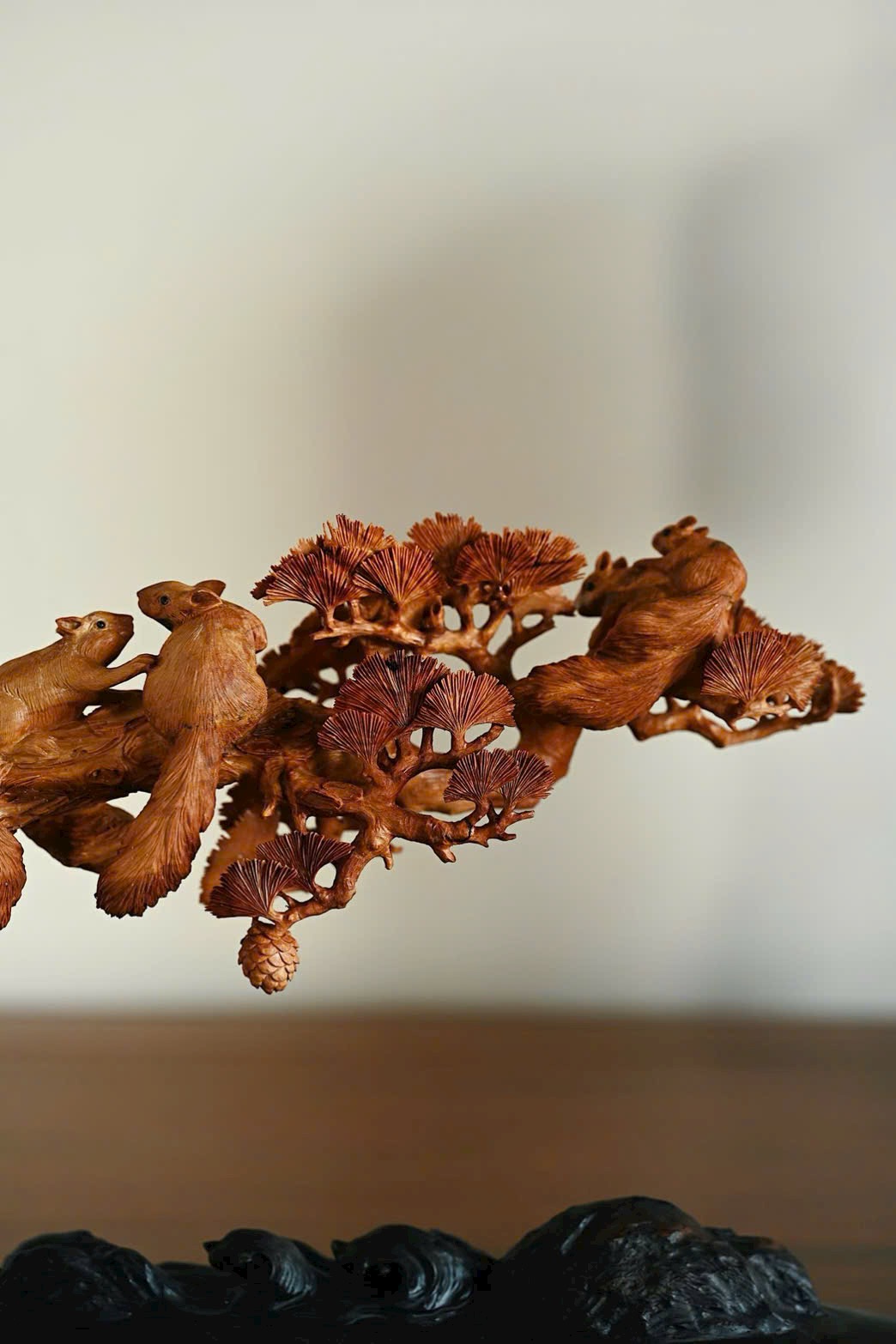 Nguyên khối chạm khắc tinh xảo, bầy sóc sinh động như thật, cành tùng bên sườn vững chắc, tượng trưng tùng xanh bền bỉ. Hàm ý con đàn cháu đống, phúc lộc viên mãn. Bày nơi án thư, đem lại sự hòa hợp và hạnh phúc cho gia đình.
