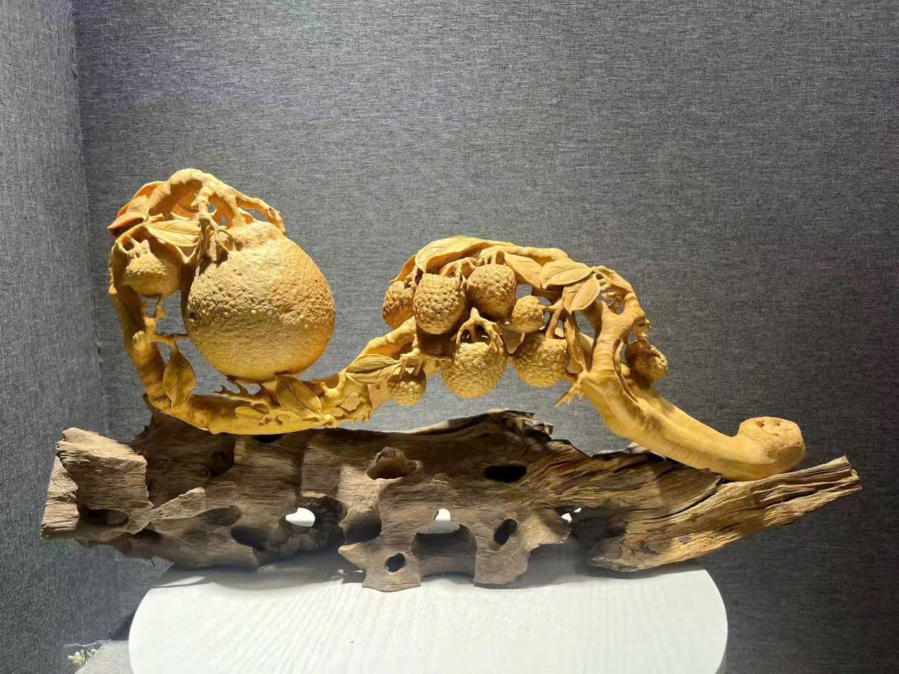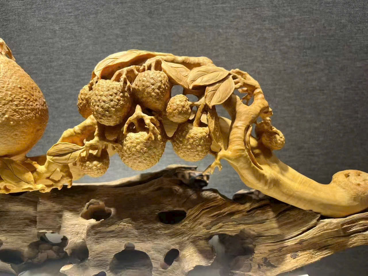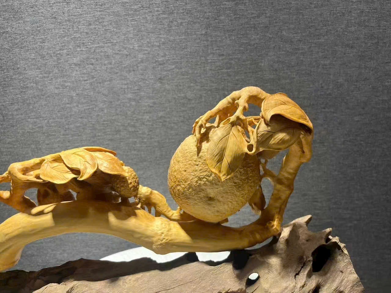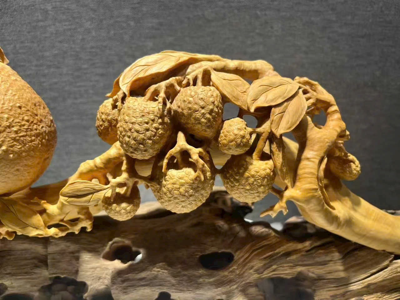 Tác phẩm hoàng dương mộc điêu khắc thủ công, chùm vải sai quả, quýt tươi căng mọng, tượng trưng cát tường như ý, phú quý viên mãn. Toàn thể tạo hình đầy đặn, bố cục tầng lớp rõ ràng, chi tiết chạm khắc tinh tế, hàm chứa nét tự nhiên sinh động. Chất gỗ mịn màng, sắc gỗ hài hòa ấm áp.