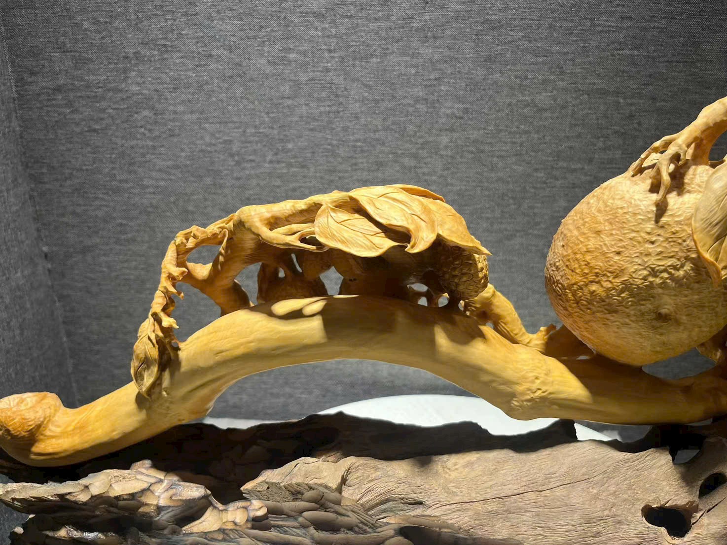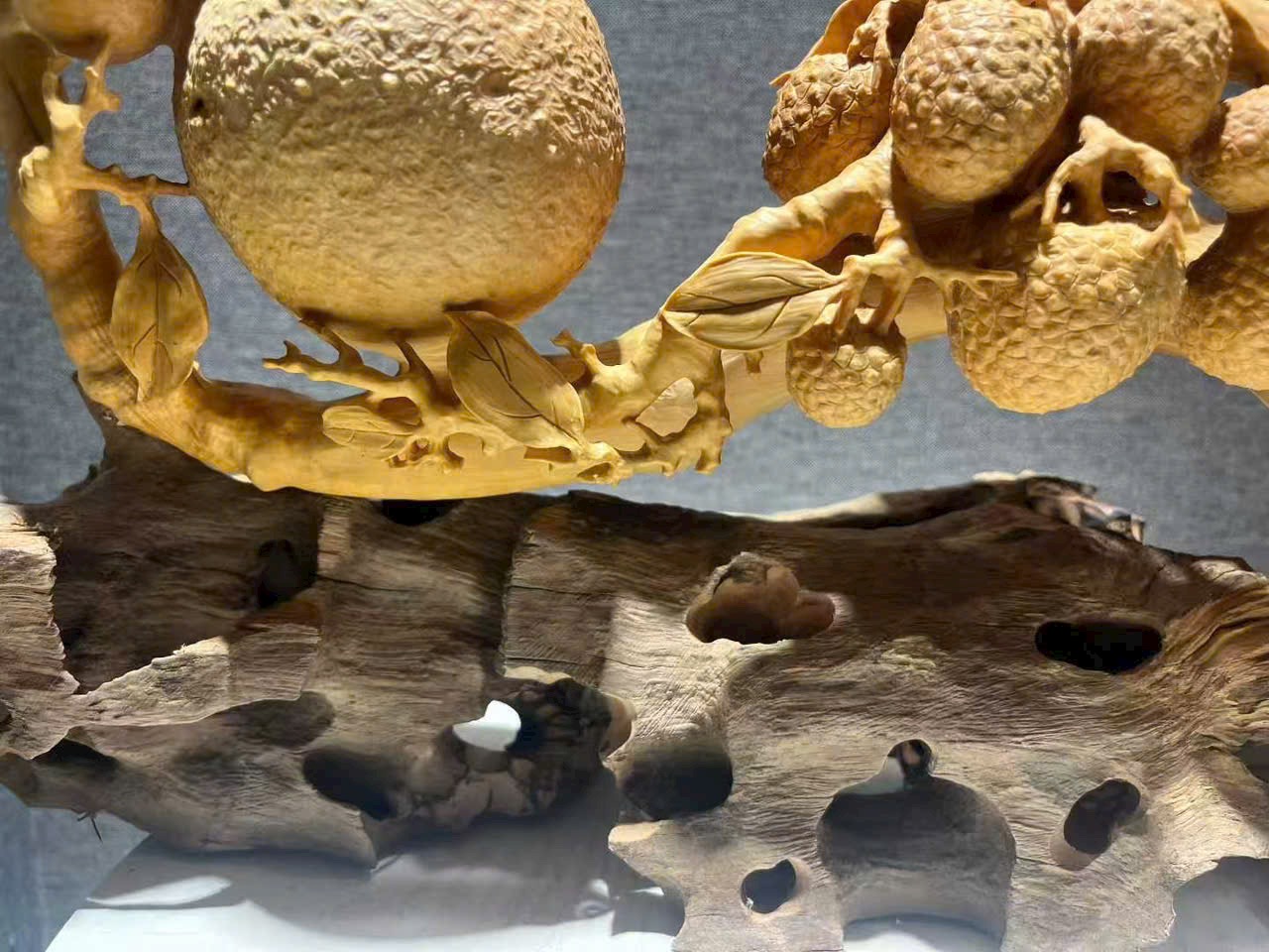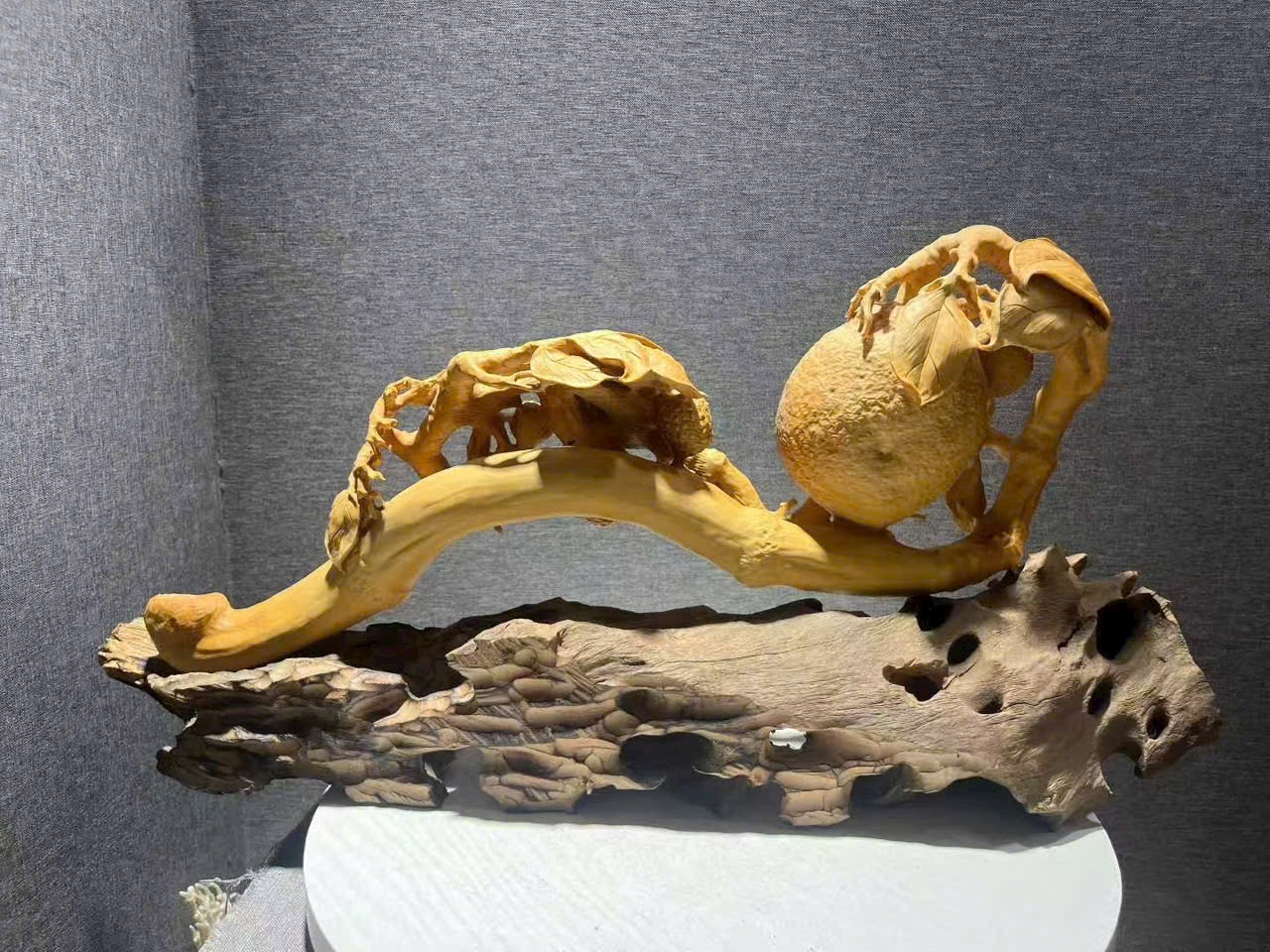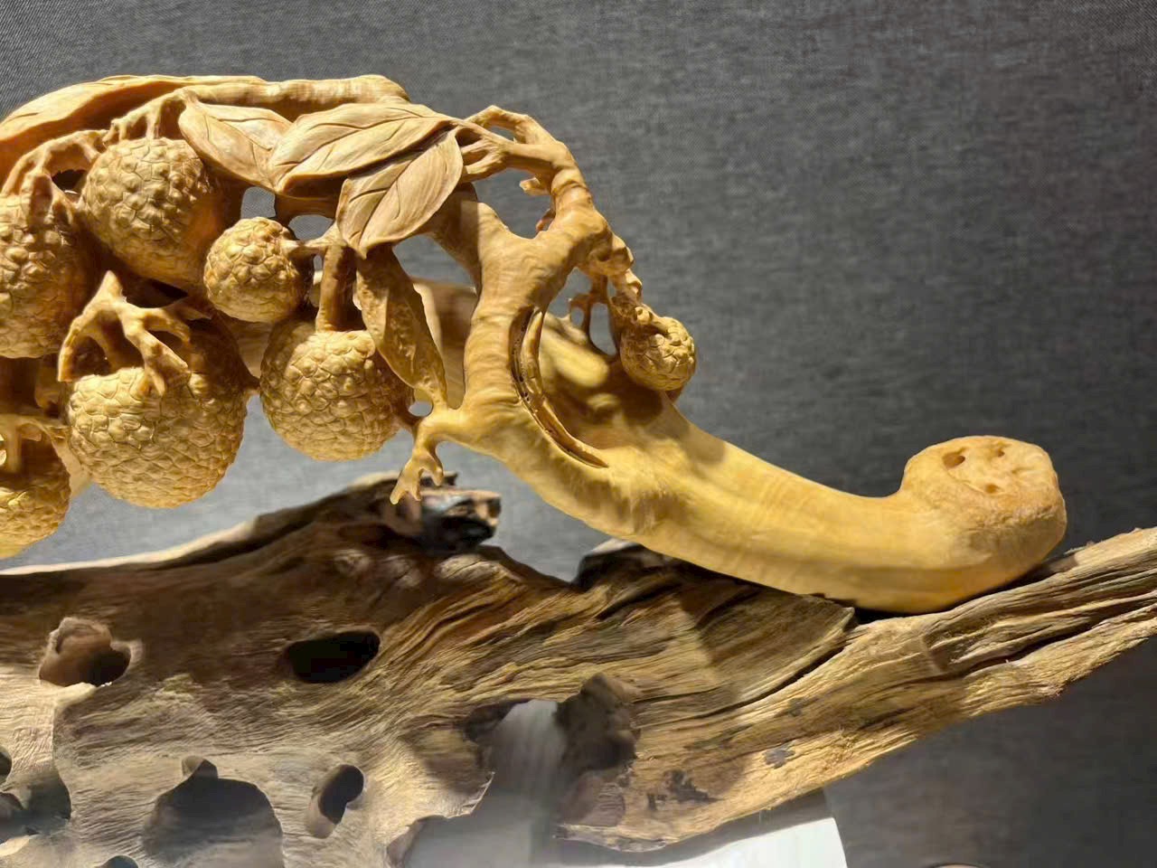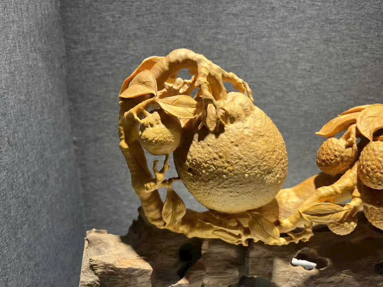 Tác phẩm hoàng dương mộc điêu khắc thủ công, chùm vải sai quả, quýt tươi căng mọng, tượng trưng cát tường như ý, phú quý viên mãn. Toàn thể tạo hình đầy đặn, bố cục tầng lớp rõ ràng, chi tiết chạm khắc tinh tế, hàm chứa nét tự nhiên sinh động. Chất gỗ mịn màng, sắc gỗ hài hòa ấm áp.