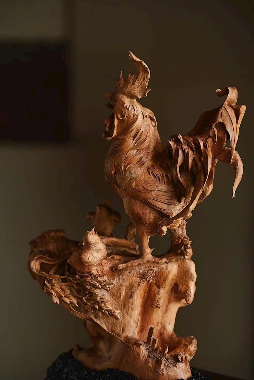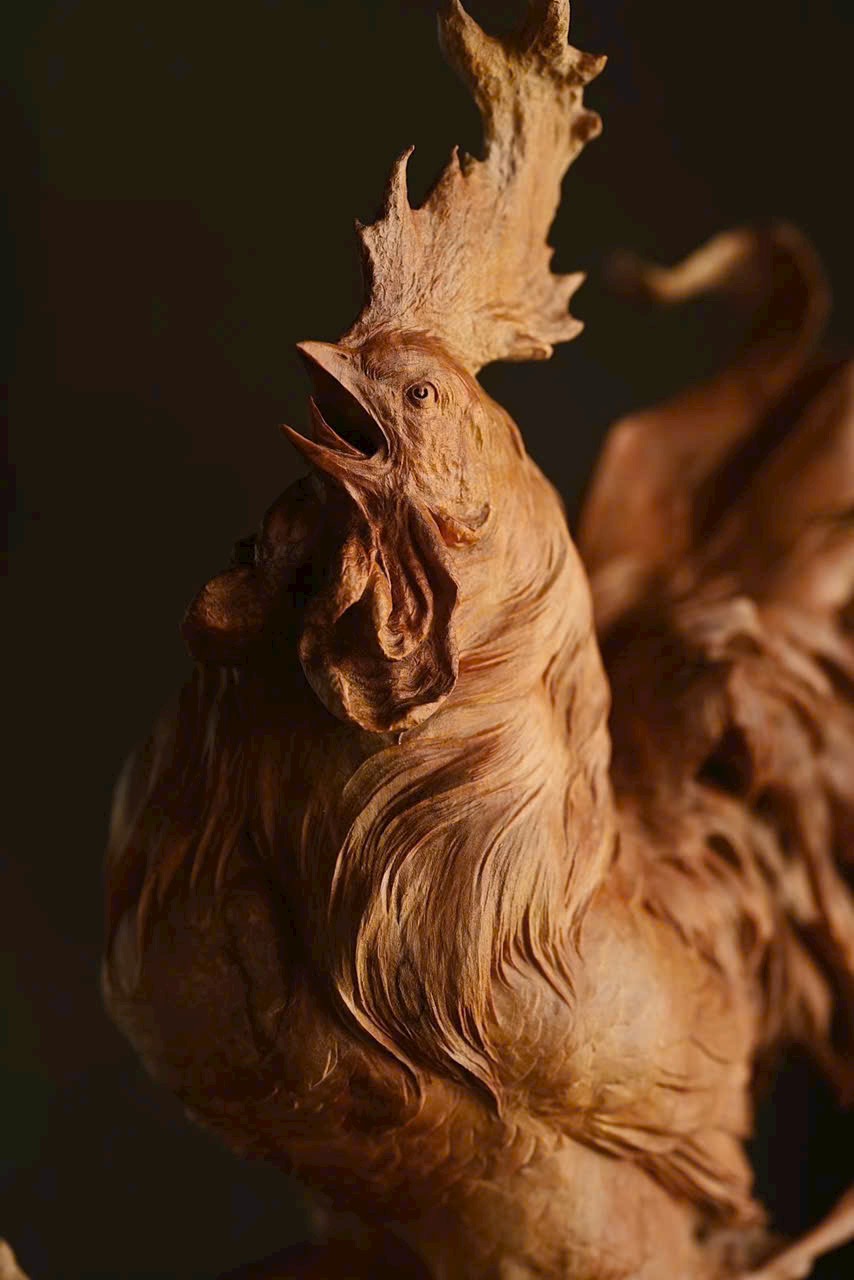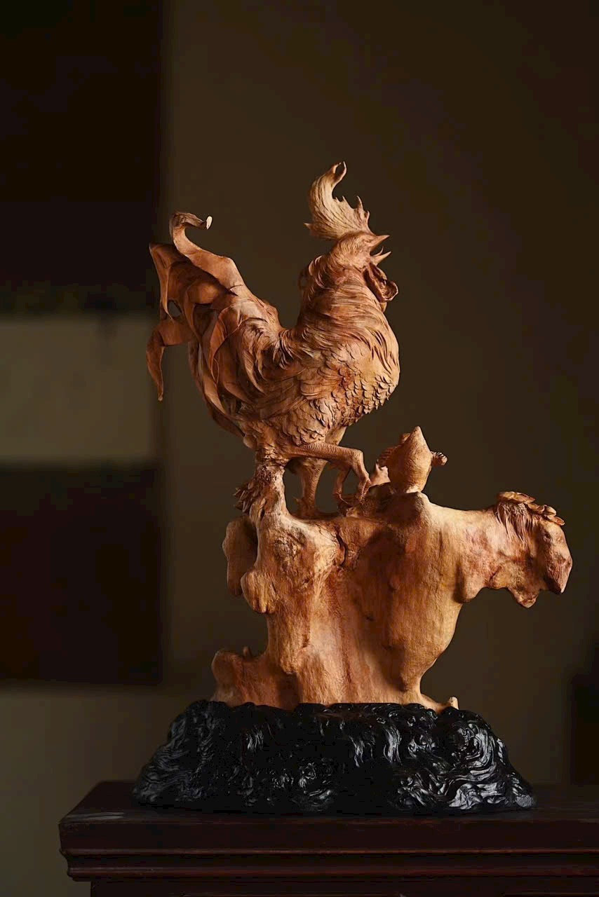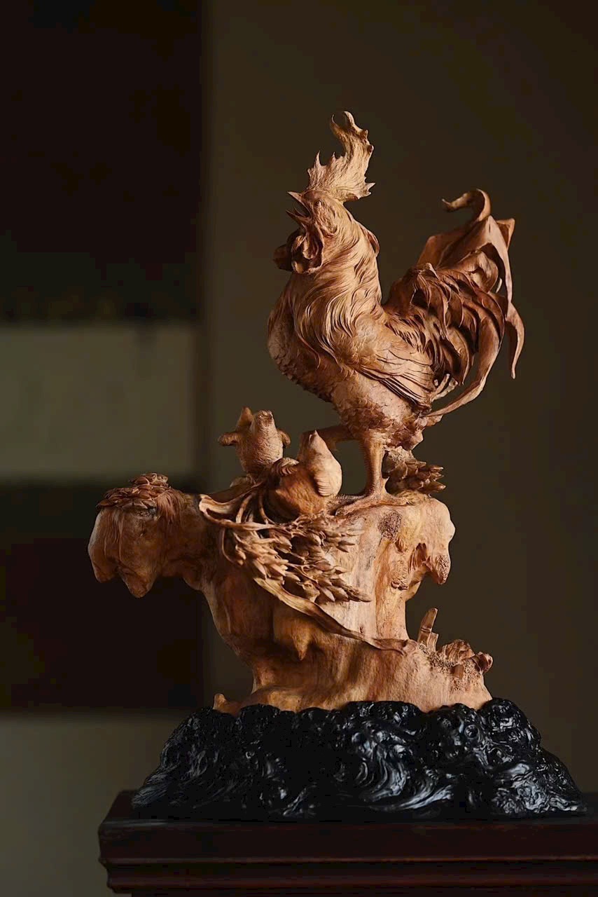 Chất liệu cao cấp quý hiếm từ gỗ Đàn Hương Ấn Độ, đường nét điêu khắc uyển chuyển mà mạnh mẽ. Gà trống ngẩng đầu ưỡn ngực, dáng sinh động. “Gà” (鸡) đồng âm với “Cát” (吉), mang ý nghĩa cát tường, phú quý. Trưng bày trên bàn càng thêm thú vị và may mắn.