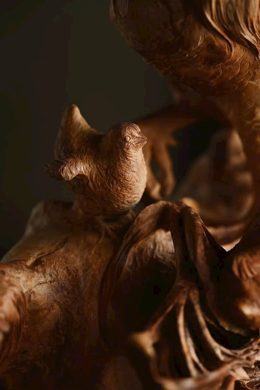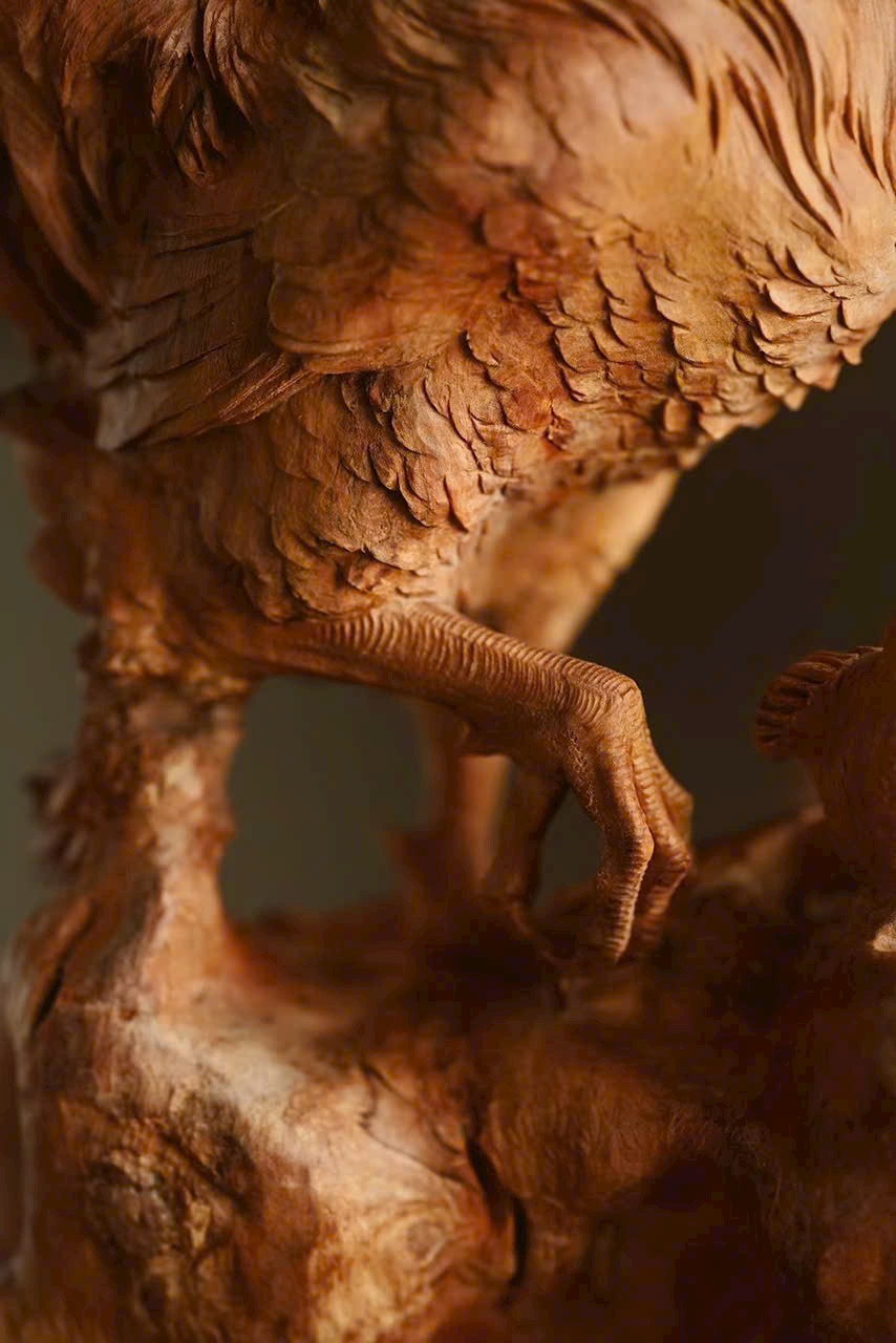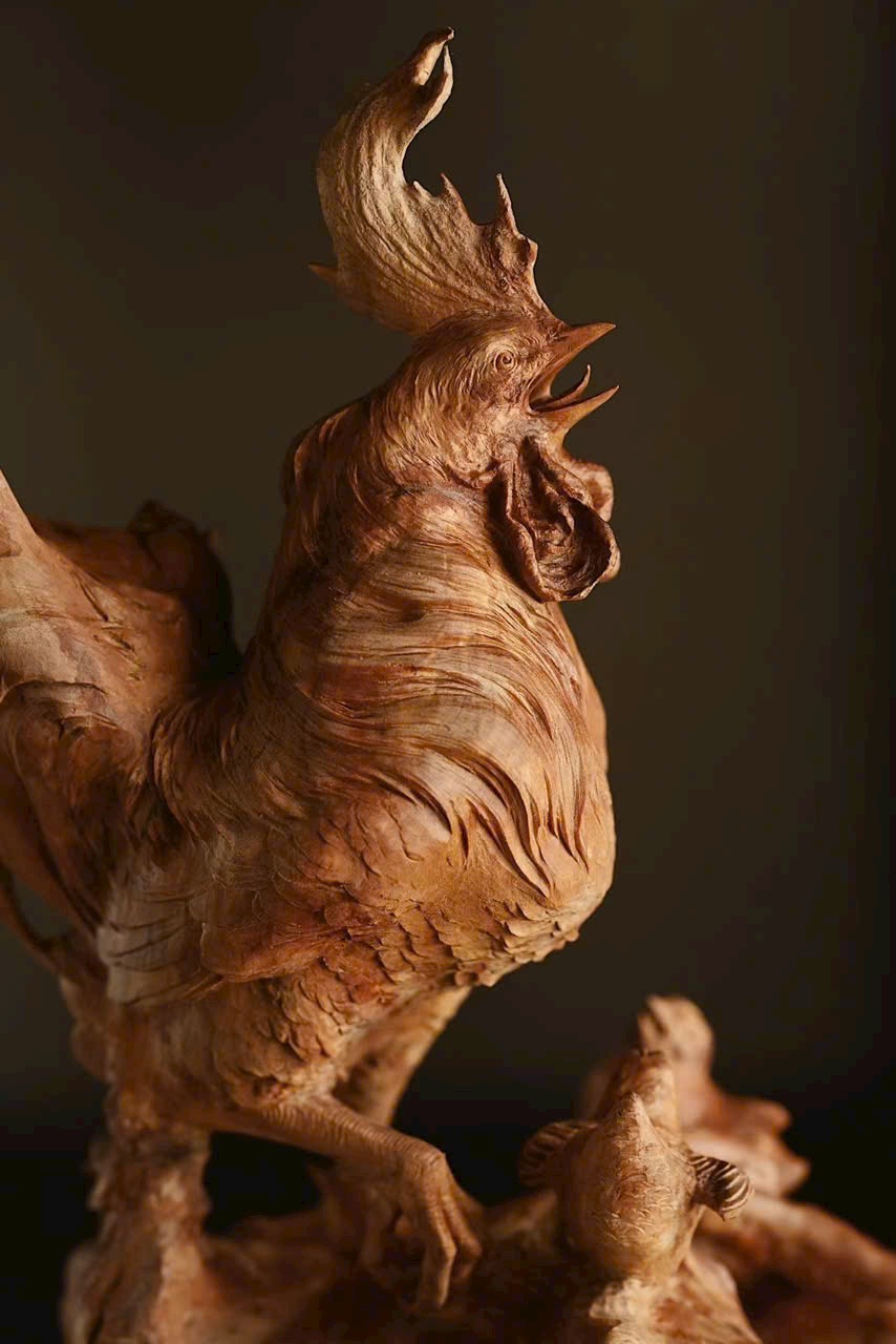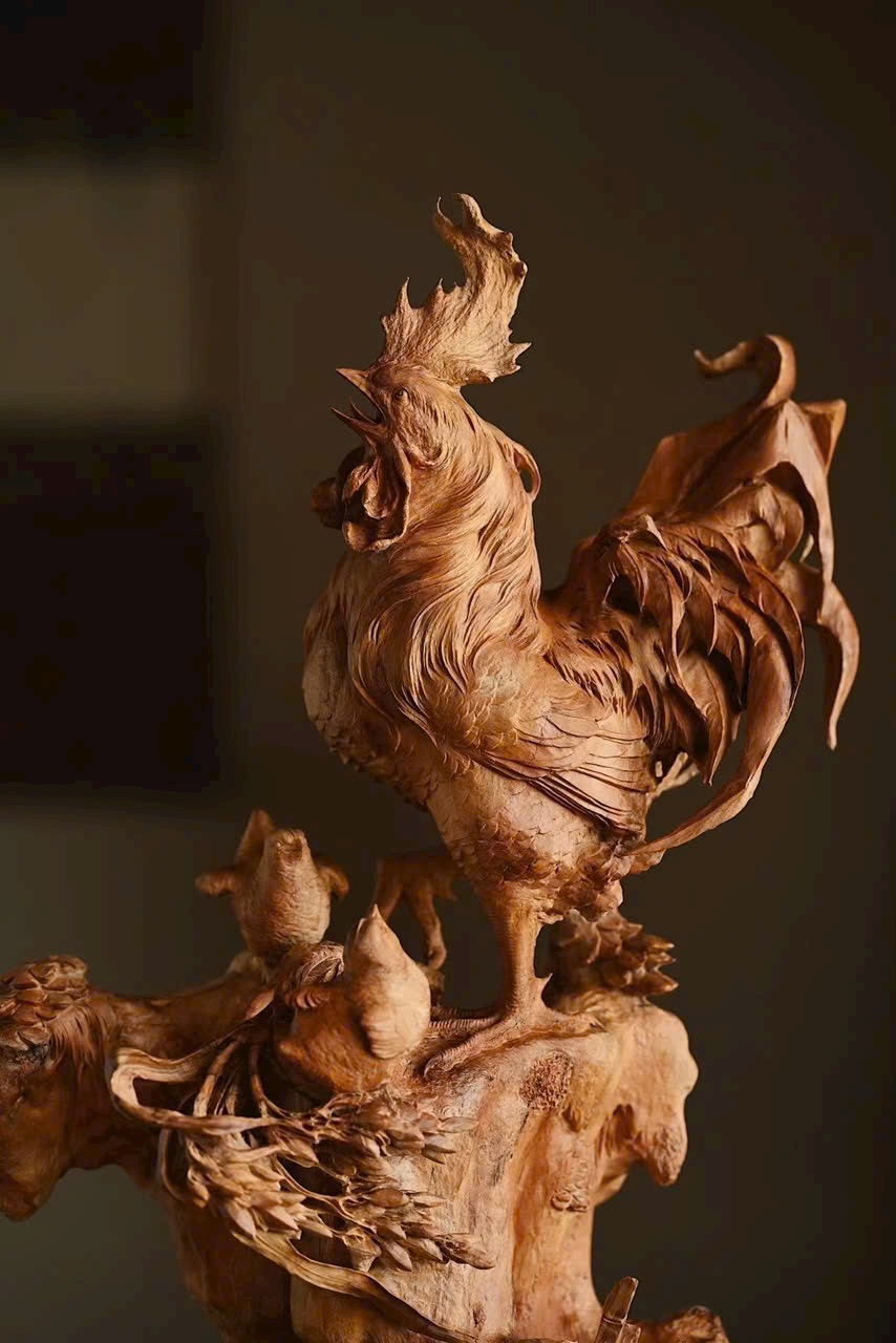 Chất liệu cao cấp quý hiếm từ gỗ Đàn Hương Ấn Độ, đường nét điêu khắc uyển chuyển mà mạnh mẽ. Gà trống ngẩng đầu ưỡn ngực, dáng sinh động. “Gà” (鸡) đồng âm với “Cát” (吉), mang ý nghĩa cát tường, phú quý. Trưng bày trên bàn càng thêm thú vị và may mắn.