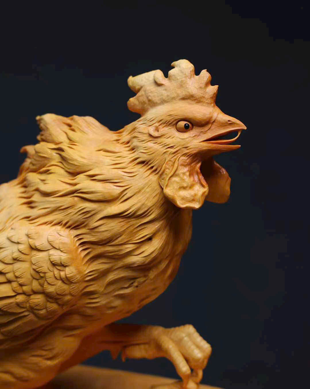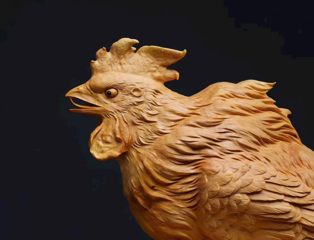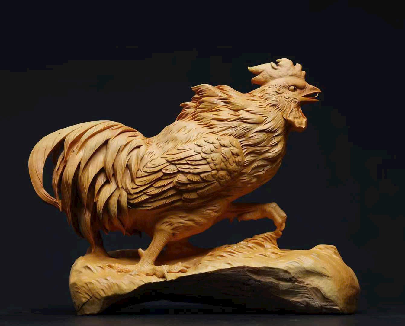 Tác phẩm được chạm khắc thủ công từ khối gỗ hoàng dương liền khối, đường nét tinh tế, thần thái sống động. Hình tượng gà trống tượng trưng cho điềm lành, cát tường và hanh thông, mang ý nghĩa đại cát đại lợi, mọi việc thuận hòa như ý.
