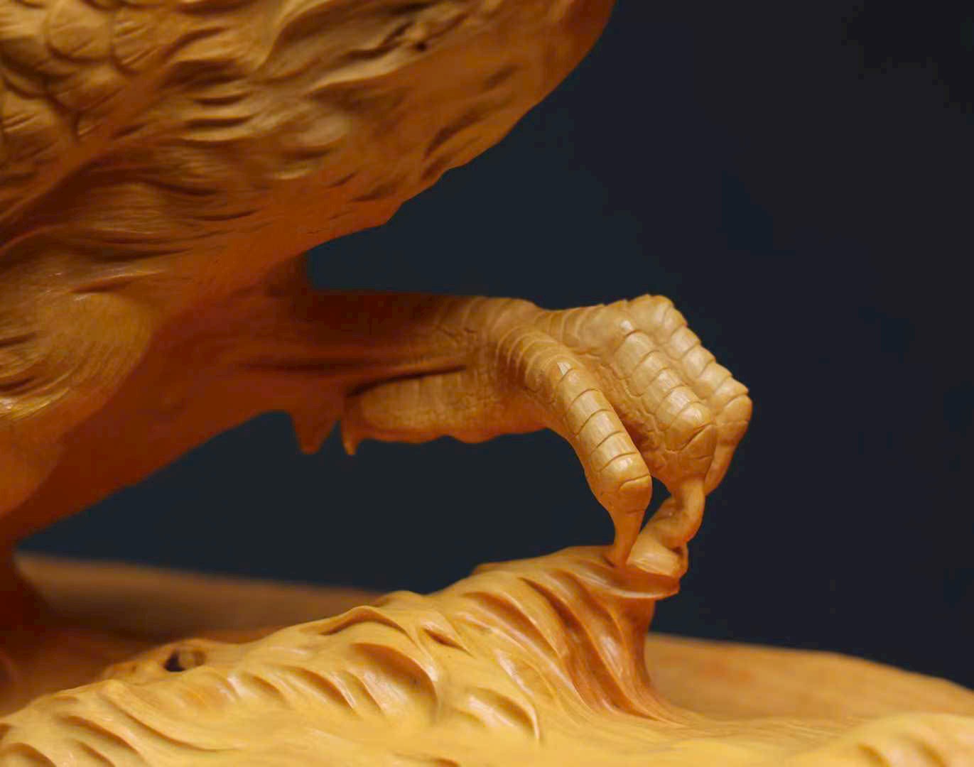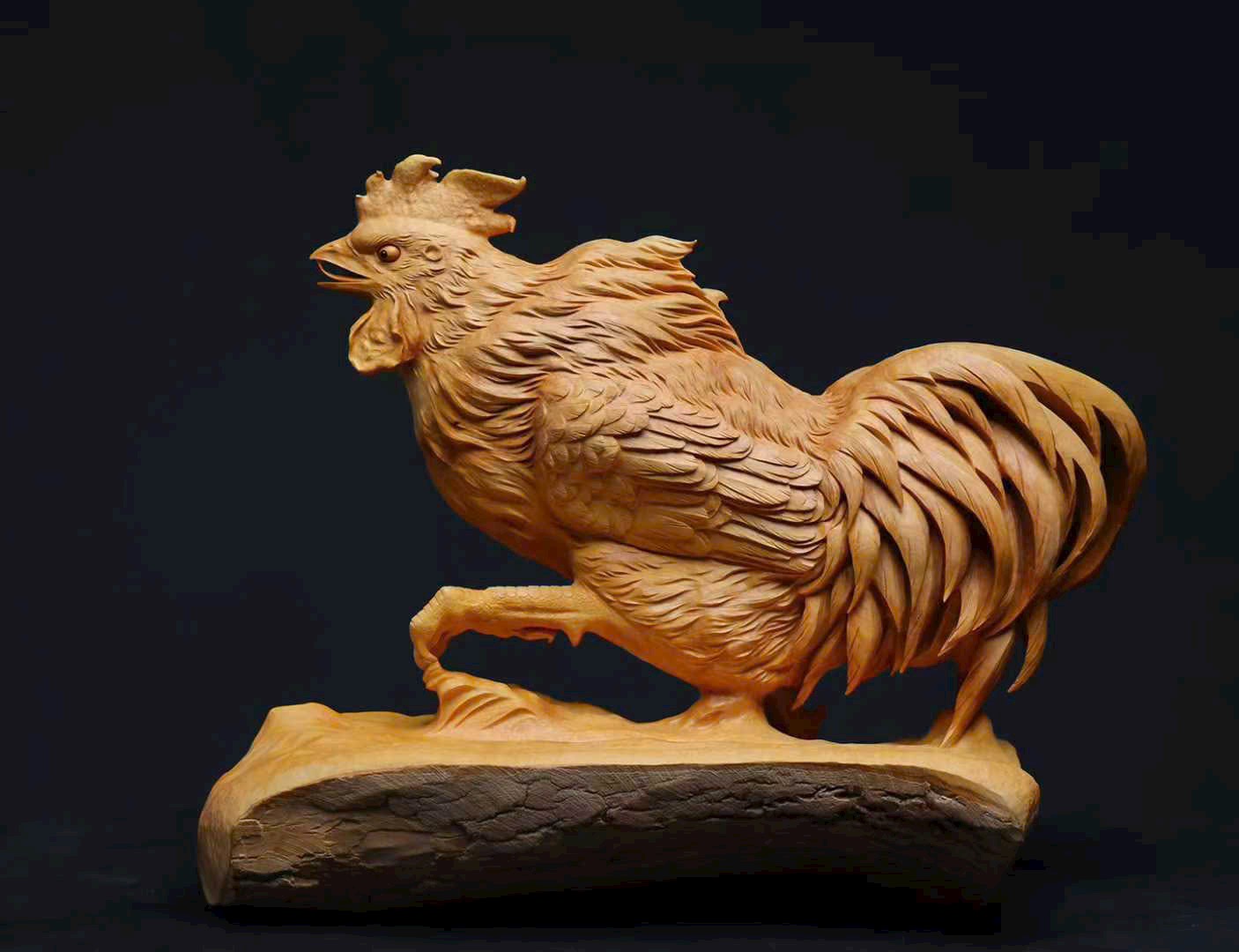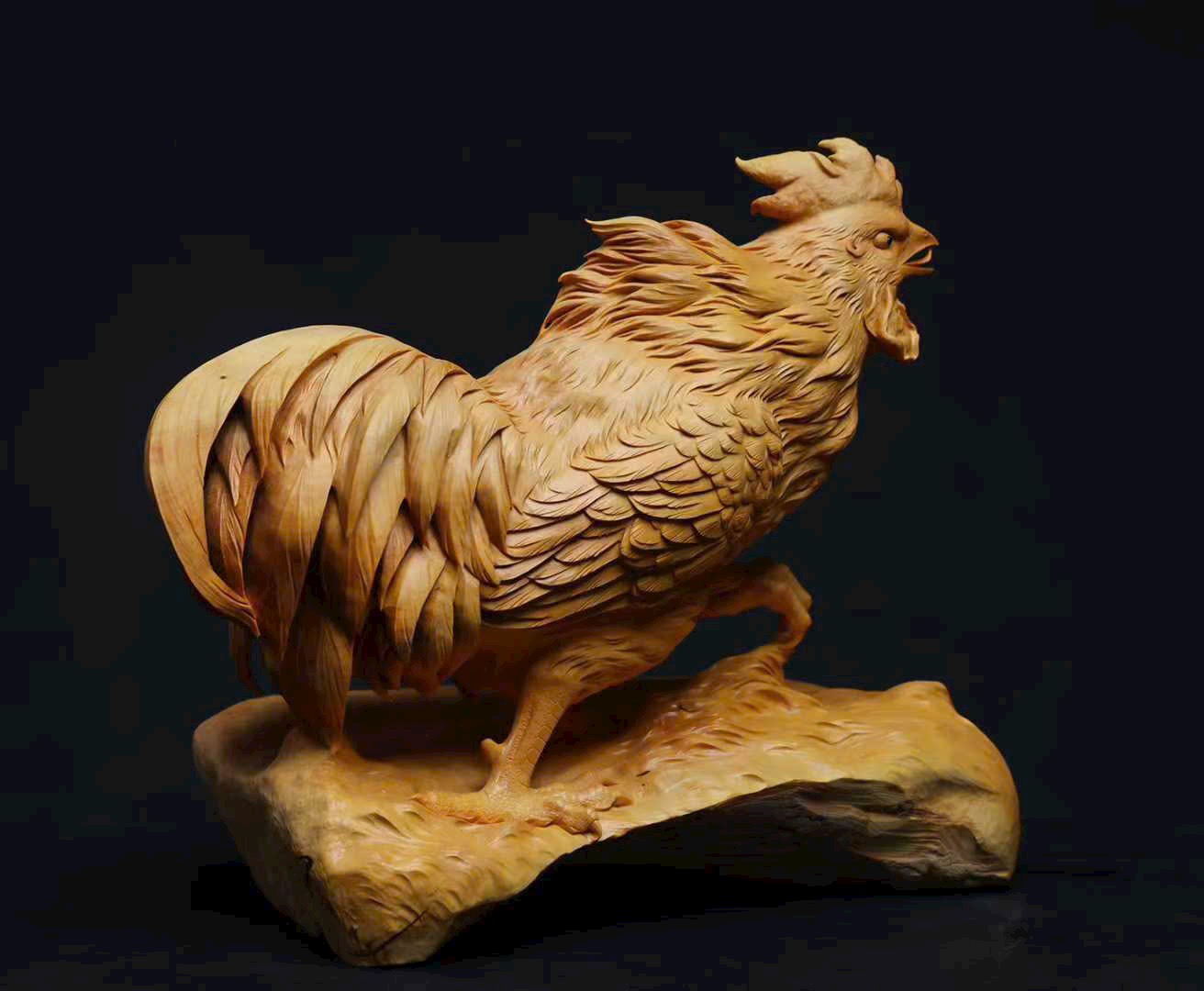 Tác phẩm được chạm khắc thủ công từ khối gỗ hoàng dương liền khối, đường nét tinh tế, thần thái sống động. Hình tượng gà trống tượng trưng cho điềm lành, cát tường và hanh thông, mang ý nghĩa đại cát đại lợi, mọi việc thuận hòa như ý.
