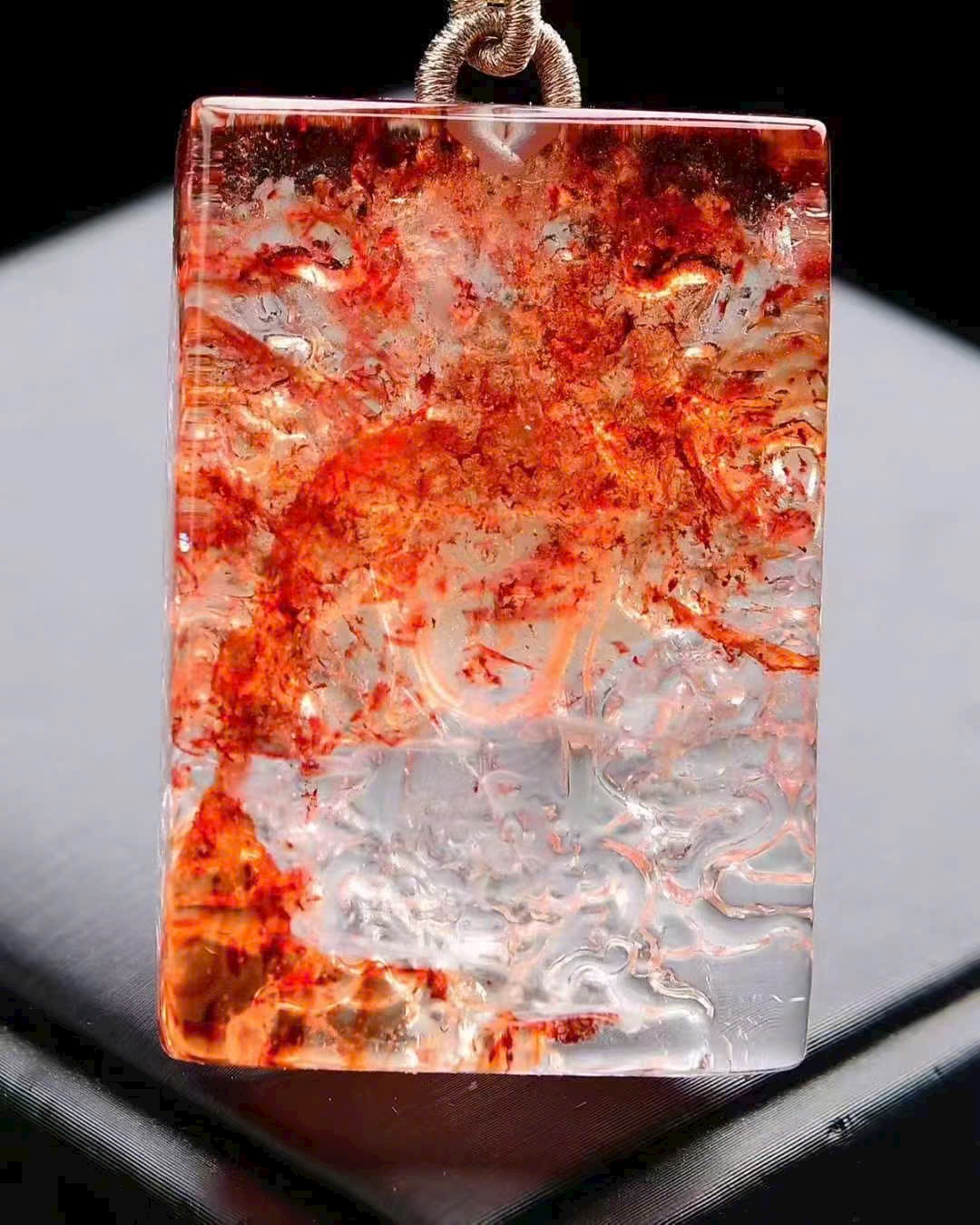 Mặt dây chuyền – Thạch anh Brazil đỏ “Ngũ Long Chí Tôn – Đại Nhật Như Lai” Tuyệt phẩm size lớn từ thạch anh đỏ keo hoa tự nhiên Brazil, phối màu độc đáo, sắc đỏ rực rỡ tượng trưng hồng vận và cát tường. Chất đá trong trẻo, ánh sắc sinh động, cảnh sắc tự nhiên đầy chiều sâu. Chủ đề Ngũ Long Chí Tôn – Đại Nhật Như Lai, chạm khắc tinh xảo, thần thái trang nghiêm, đường nét sống động. Hình tượng mang ý nghĩa bình an, hanh thông, như ý cát tường, phúc thọ dài lâu và gia đạo hưng thịnh. 📏 Kích thước: 49 × 33 × 13 mm ⚖️ Trọng lượng: 74.5 g