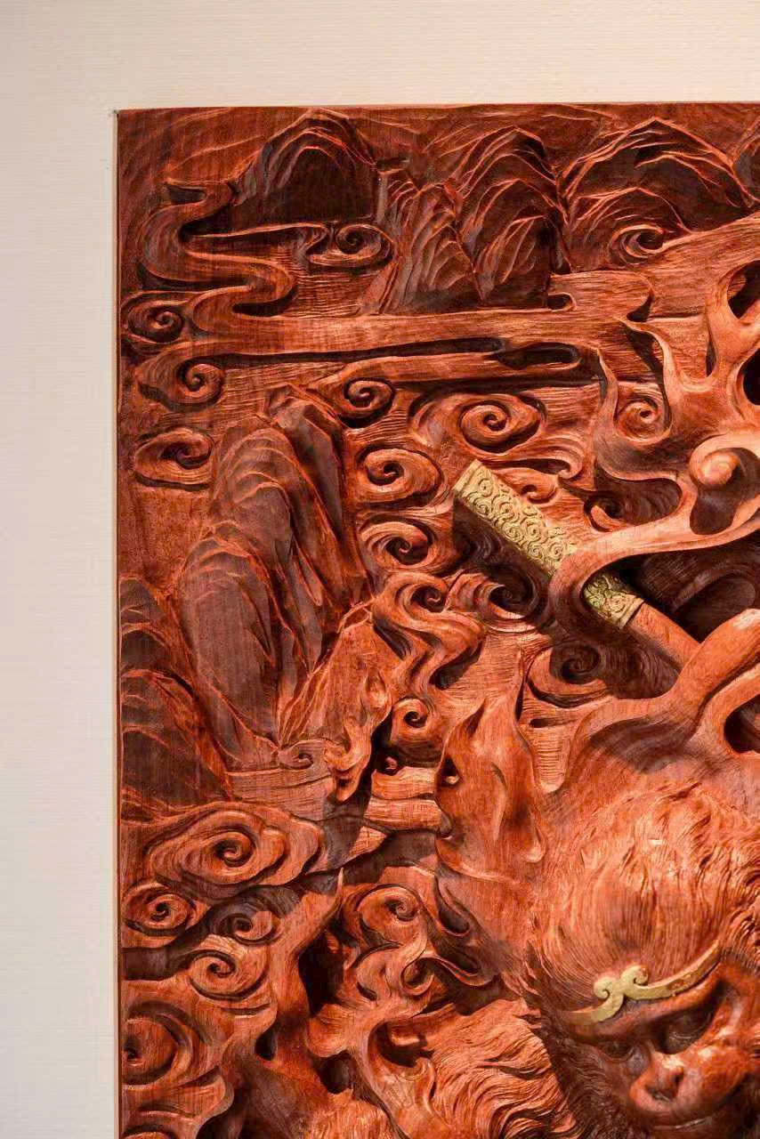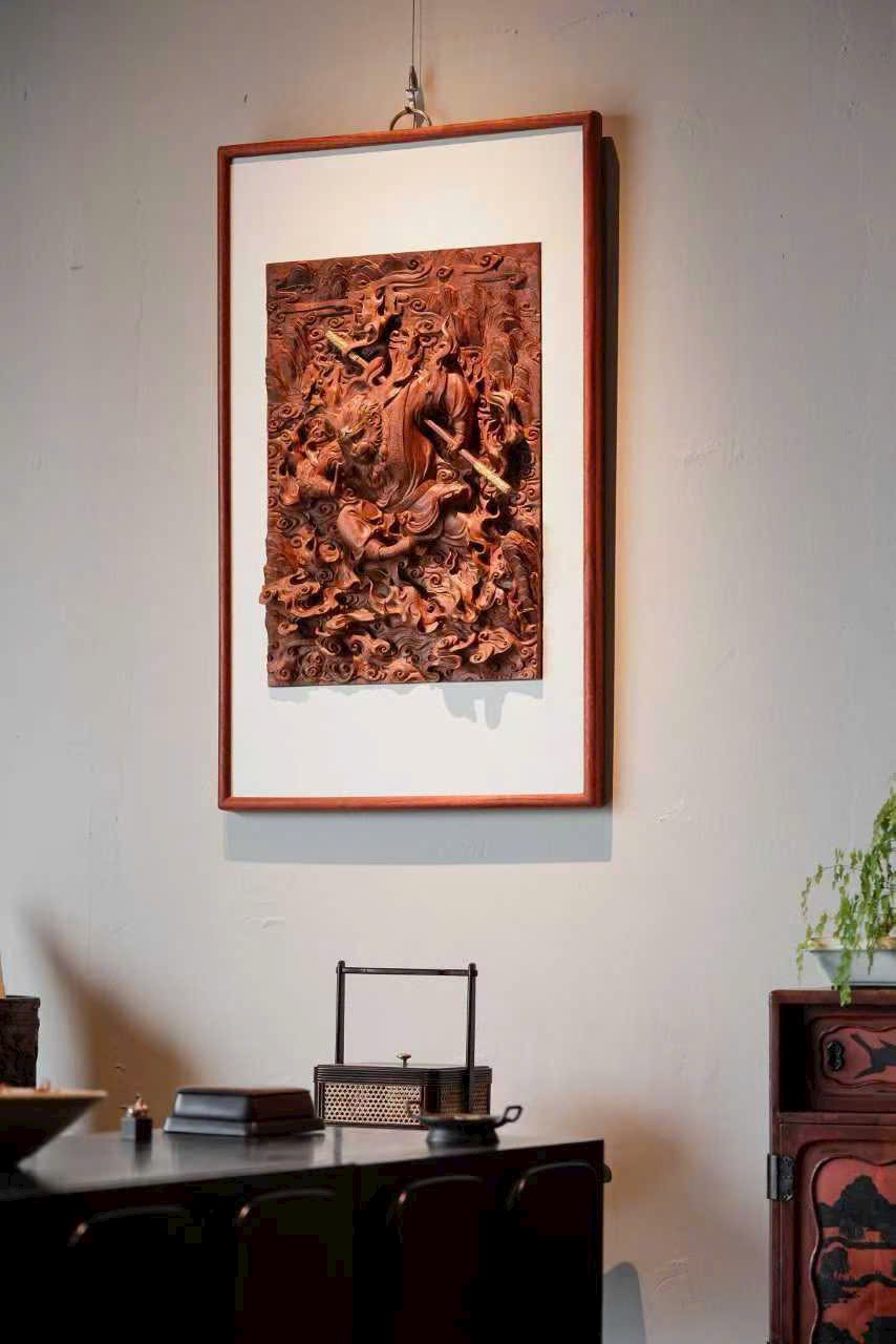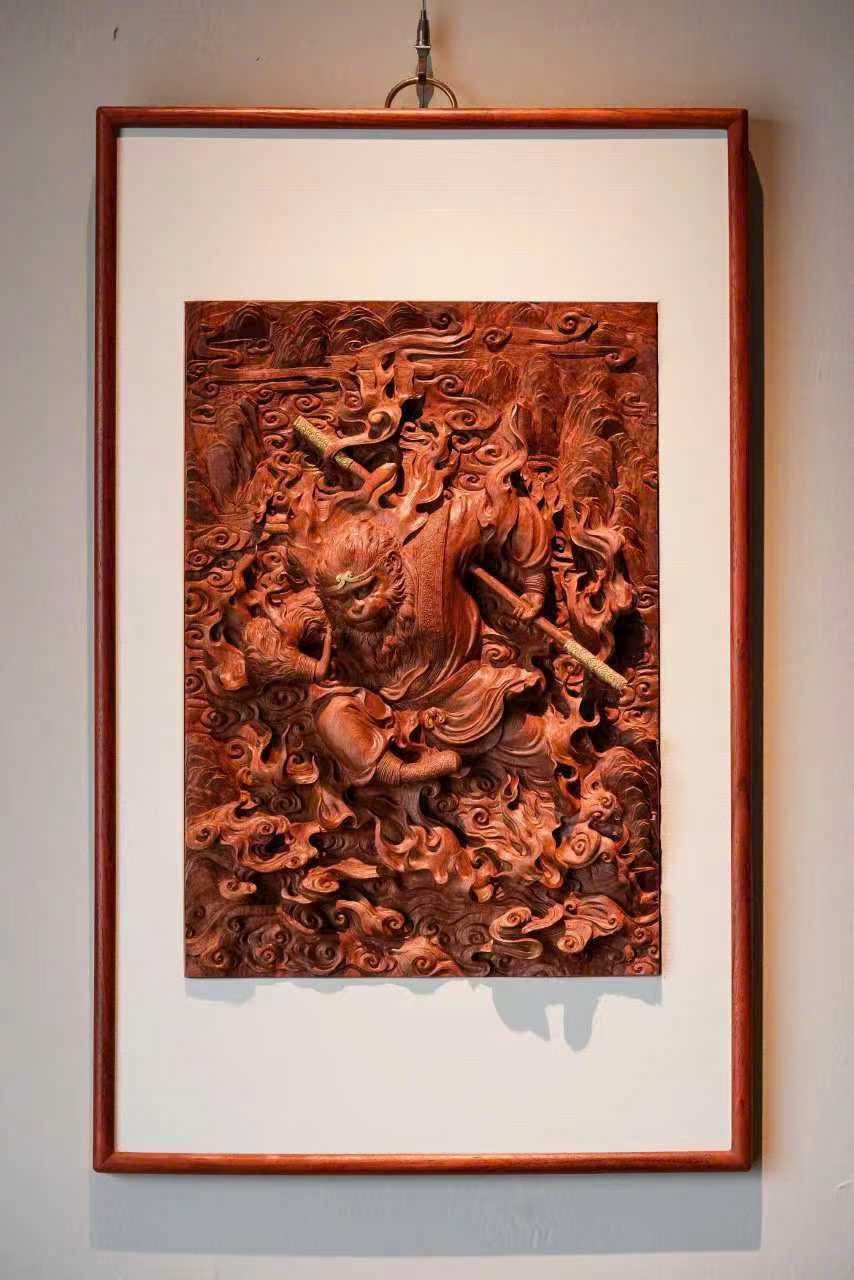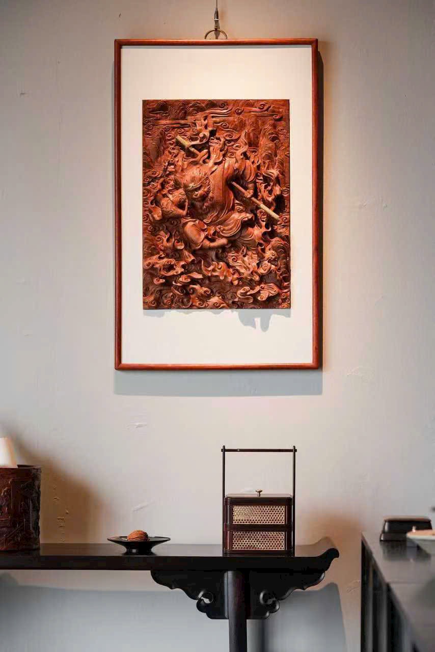 Vân gỗ như những đợt lửa cuộn trào, phù điêu khắc hình Đại Thánh đạp mây lửa. Vòng kim cô bổ tách núi lửa đỏ rực, áo choàng tung bay phá tầng mây cao. Treo nơi phòng khách, lấy ý nghĩa thiền “phá chướng trừ nạn”, khiến không gian tràn đầy khí phách anh hùng.
