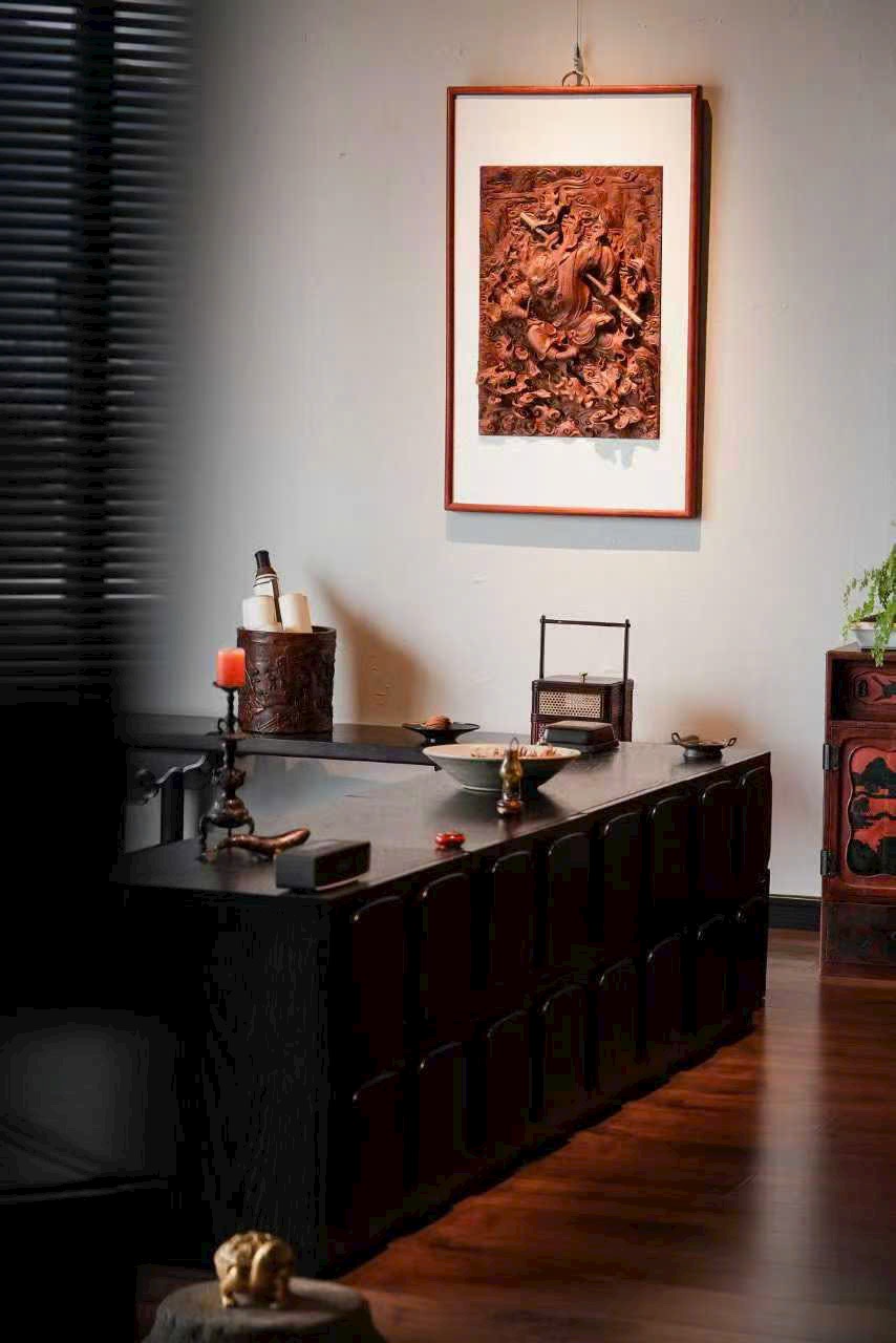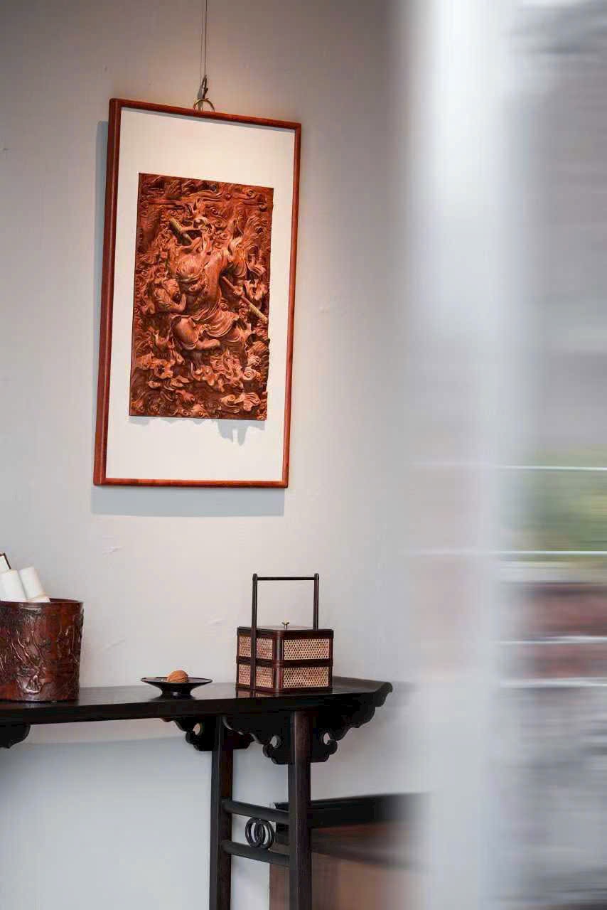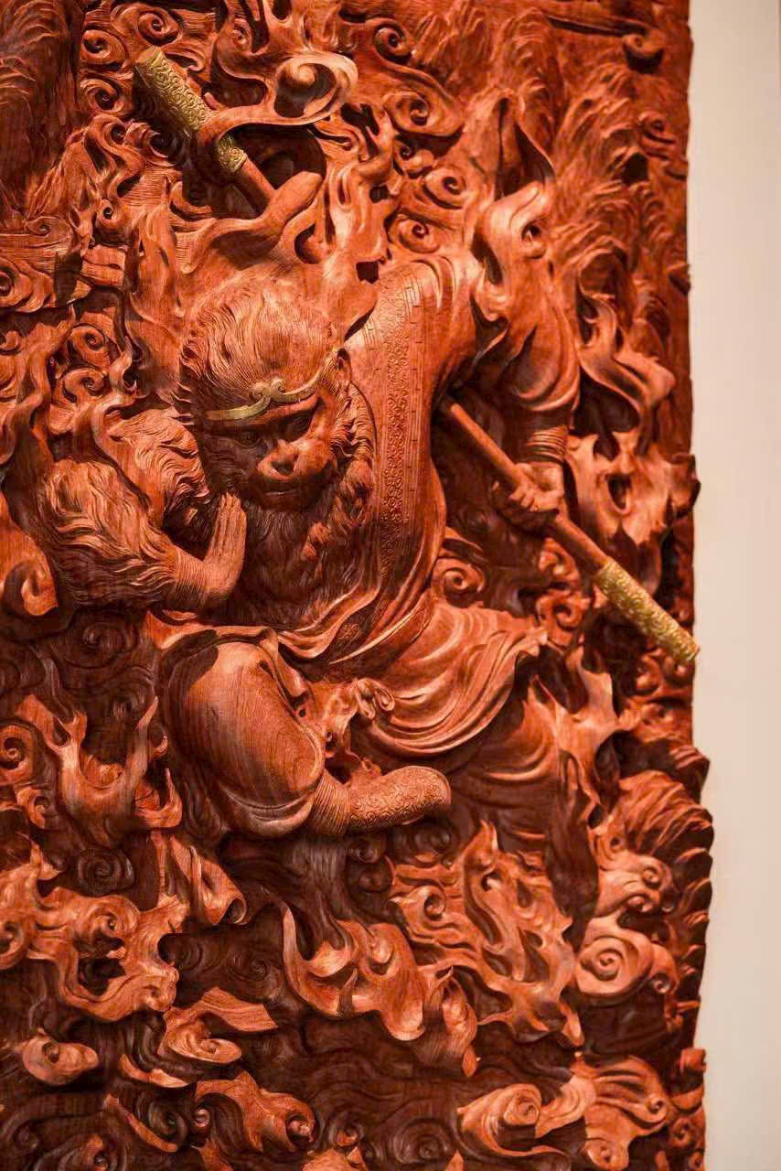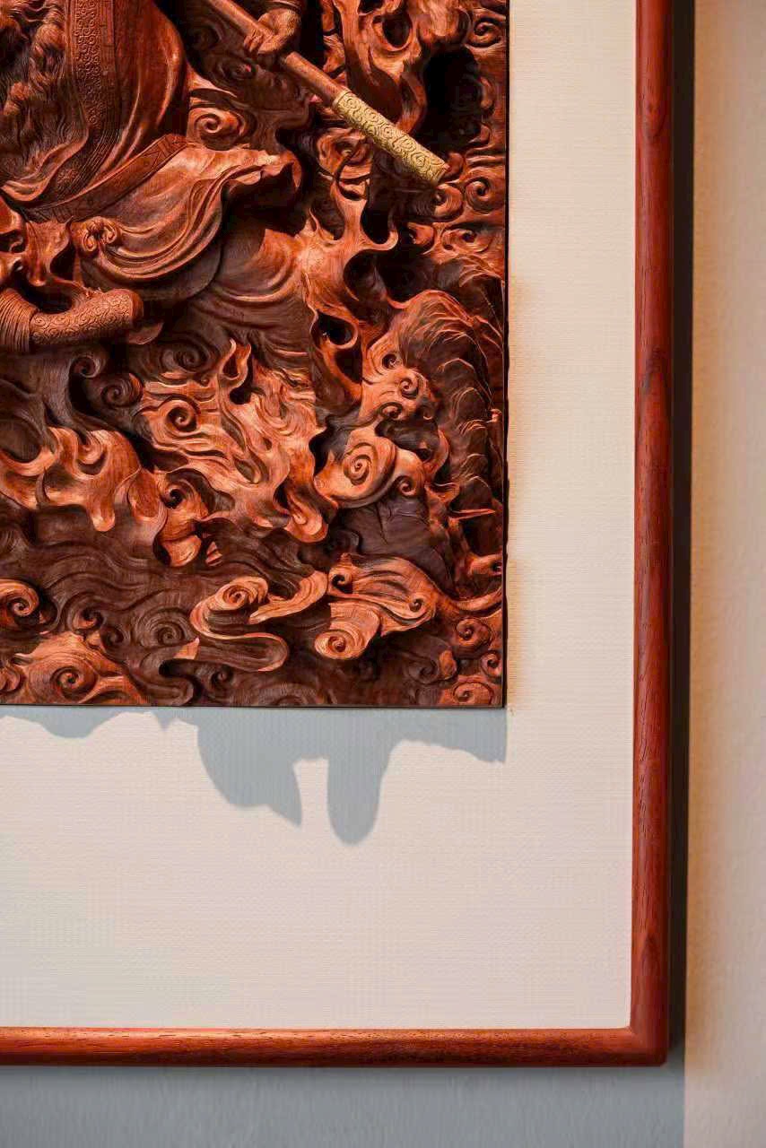 Vân gỗ như những đợt lửa cuộn trào, phù điêu khắc hình Đại Thánh đạp mây lửa. Vòng kim cô bổ tách núi lửa đỏ rực, áo choàng tung bay phá tầng mây cao. Treo nơi phòng khách, lấy ý nghĩa thiền “phá chướng trừ nạn”, khiến không gian tràn đầy khí phách anh hùng.