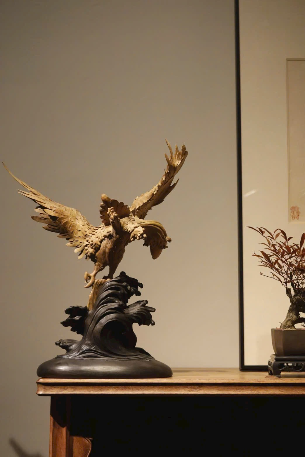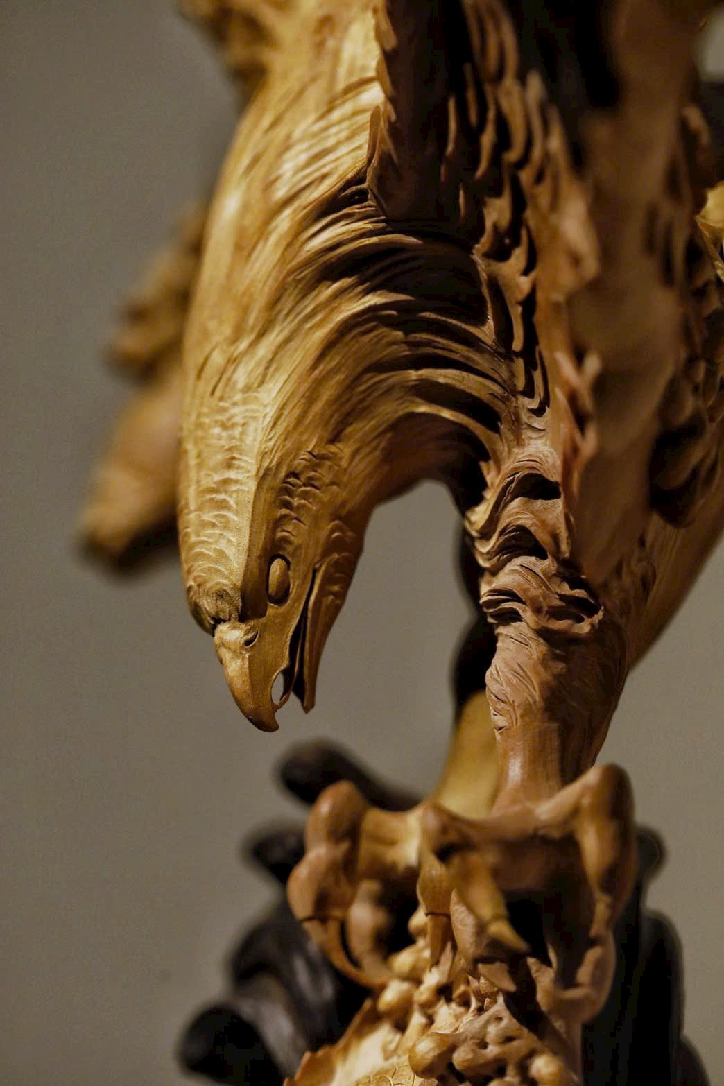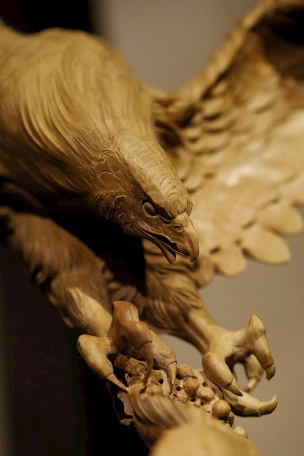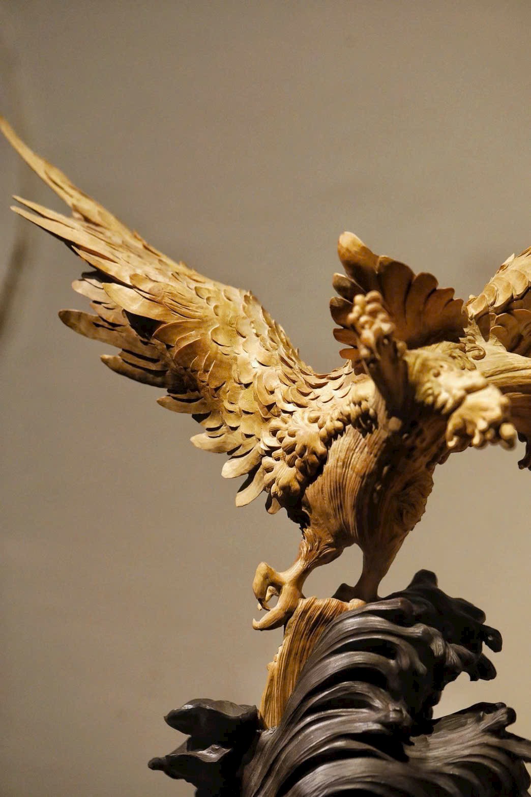 Tác phẩm chạm khắc liền khối từ gỗ nguyên khối, hình đại bàng thân hơi chúi về phía trước, ánh mắt sắc bén, nghiêm nghị nhìn thẳng xuống dưới, thần thái sinh động. Song trảo khỏe khoắn hữu lực, cánh lông xếp lớp rõ ràng; móng và mỏ sắc nhọn như câu, toát lên khí thế vút thẳng mây xanh. Đặt trên án thư, gợi chí lớn bay cao, hào khí xung thiên, khí thế như cầu vồng xuyên mây.