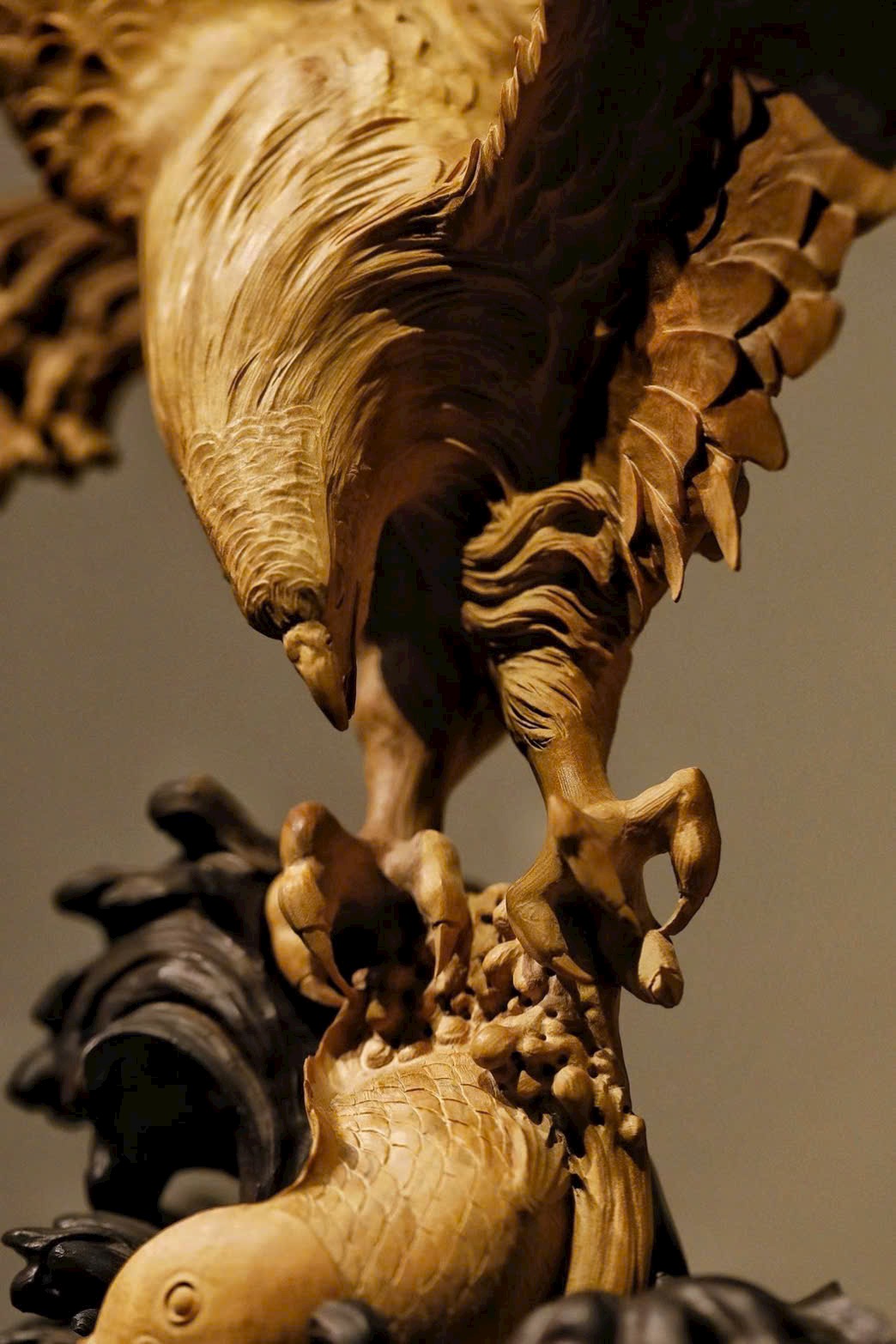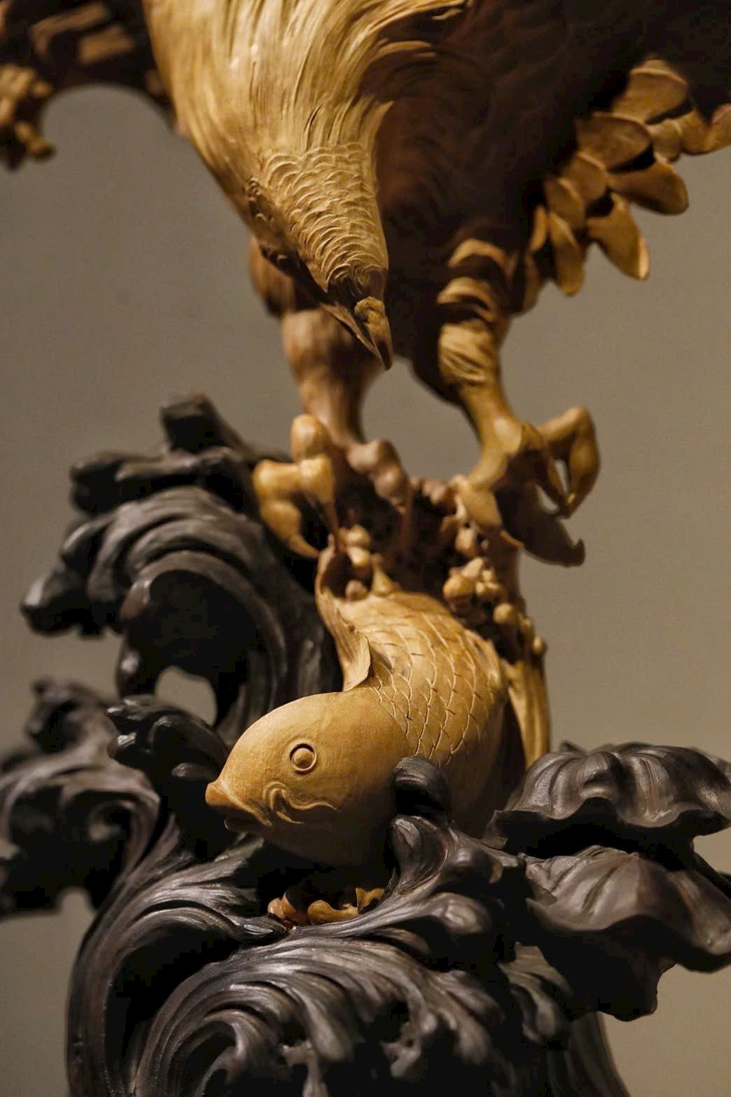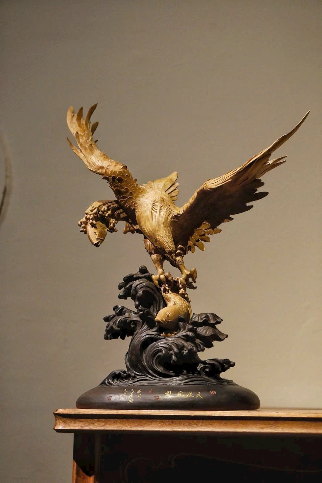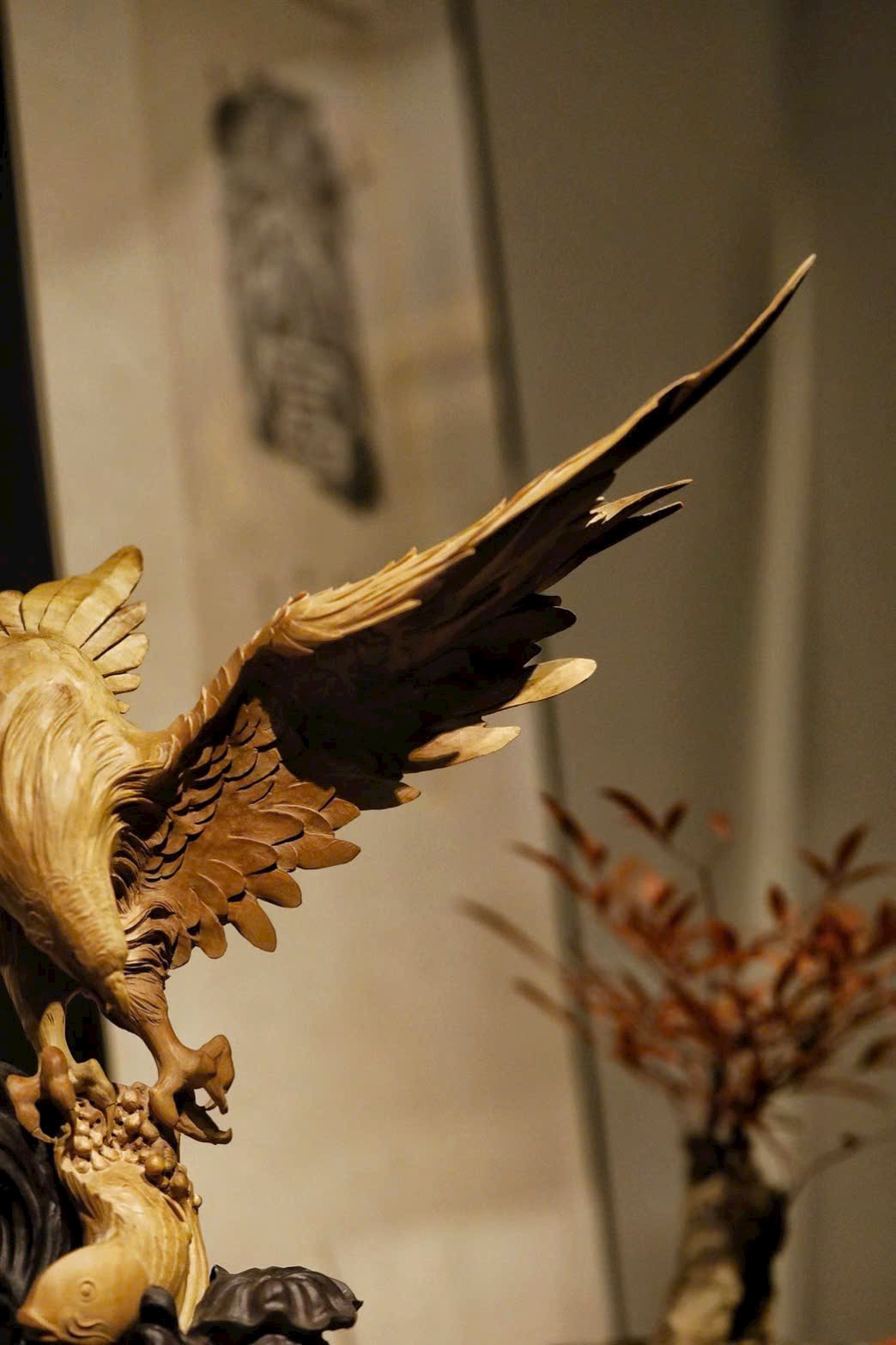 Tác phẩm chạm khắc liền khối từ gỗ nguyên khối, hình đại bàng thân hơi chúi về phía trước, ánh mắt sắc bén, nghiêm nghị nhìn thẳng xuống dưới, thần thái sinh động. Song trảo khỏe khoắn hữu lực, cánh lông xếp lớp rõ ràng; móng và mỏ sắc nhọn như câu, toát lên khí thế vút thẳng mây xanh. Đặt trên án thư, gợi chí lớn bay cao, hào khí xung thiên, khí thế như cầu vồng xuyên mây.