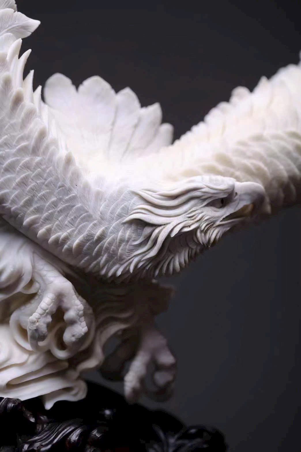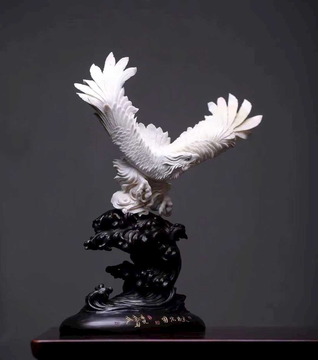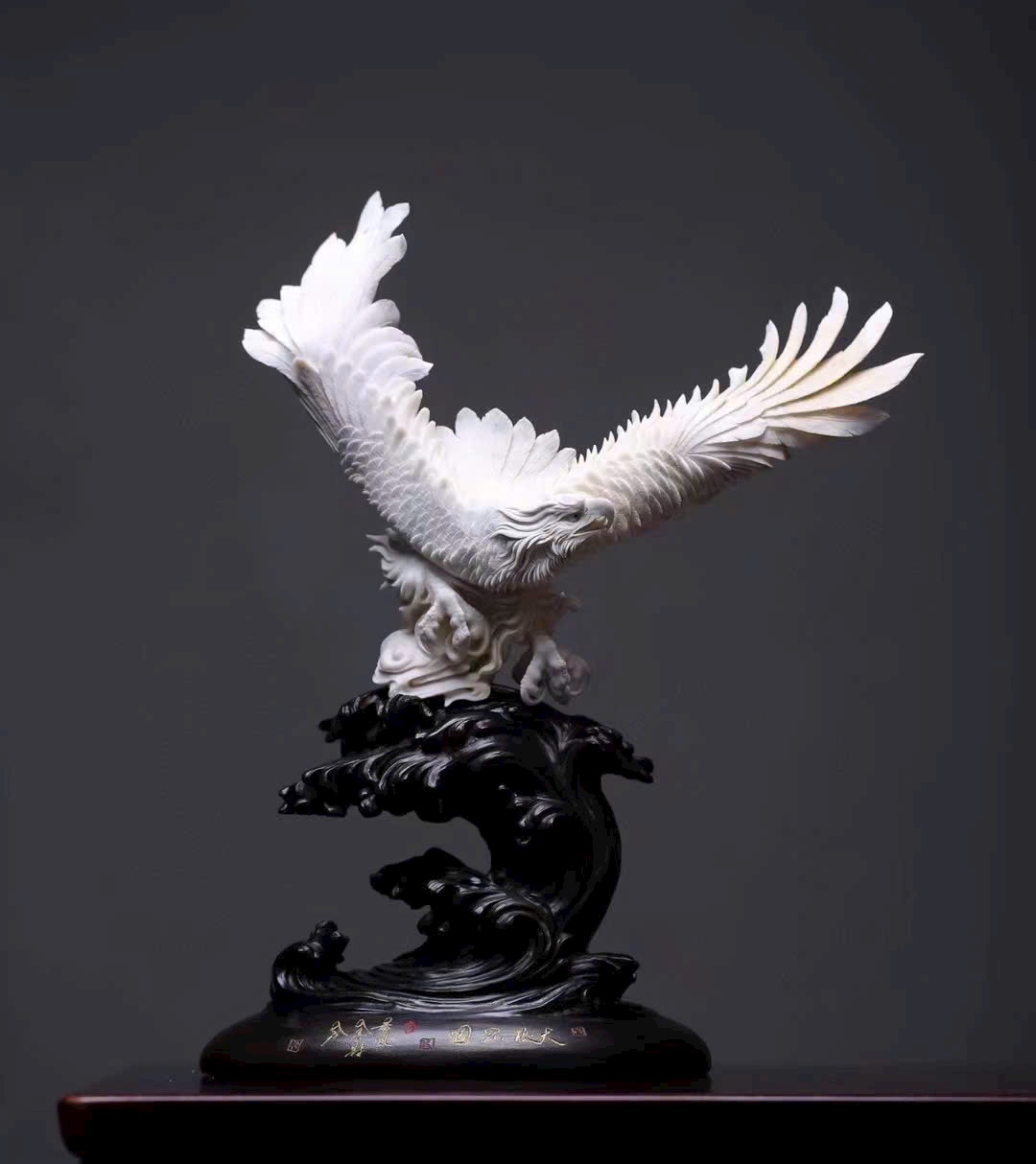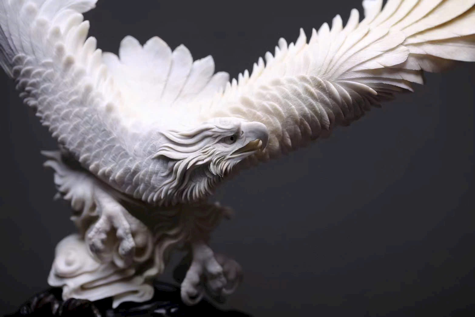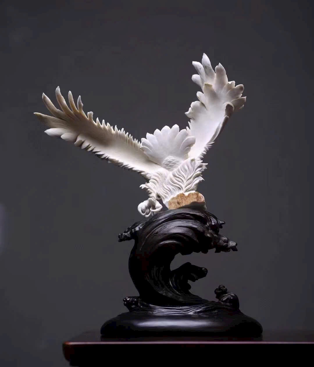Tuyển chọn phôi lộc giác quý hiếm, chế tác tinh xảo. Hình tượng chim ưng – biểu trưng cho sức mạnh, nghị lực và tinh thần dũng mãnh. Tác phẩm mang hàm ý vươn mình tiến bước, dám đối mặt thử thách để chinh phục hoài bão lớn, mở ra tiền đồ rộng mở.