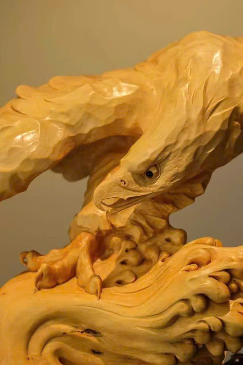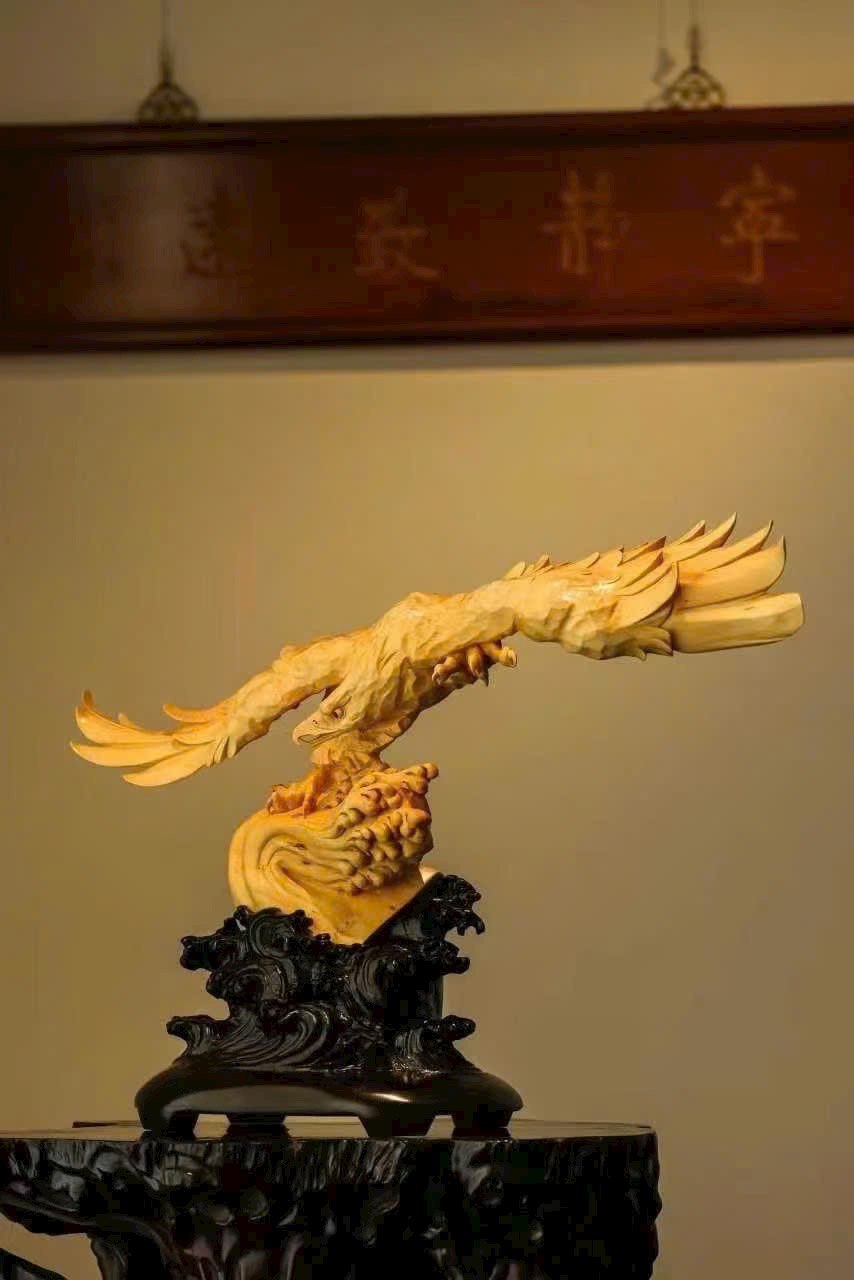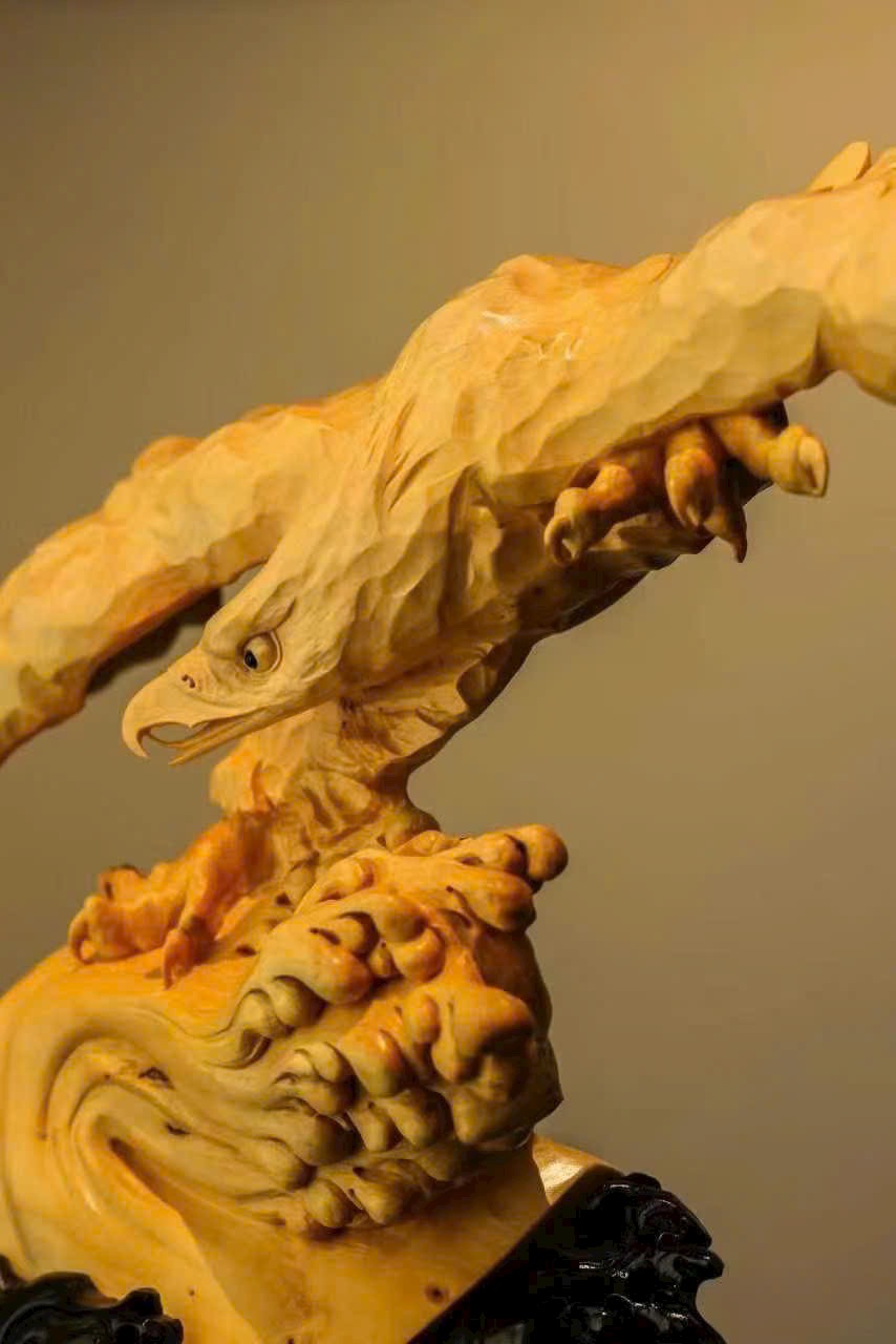 Chọn lọc hoàng dương nguyên khối chạm khắc liền thể, đao pháp kết hợp giữa tả thực và phóng bút. Lông vũ khắc họa tinh vi, đại bàng sải cánh như đứng trên đỉnh núi, đôi cánh rắn rỏi, mạnh mẽ, sẵn sàng lao xuống giữa trường không. Thần thái sống động, khí thế hùng tráng, gửi gắm ý nghĩa đại triển hoành đồ – mở mang sự nghiệp lớn.