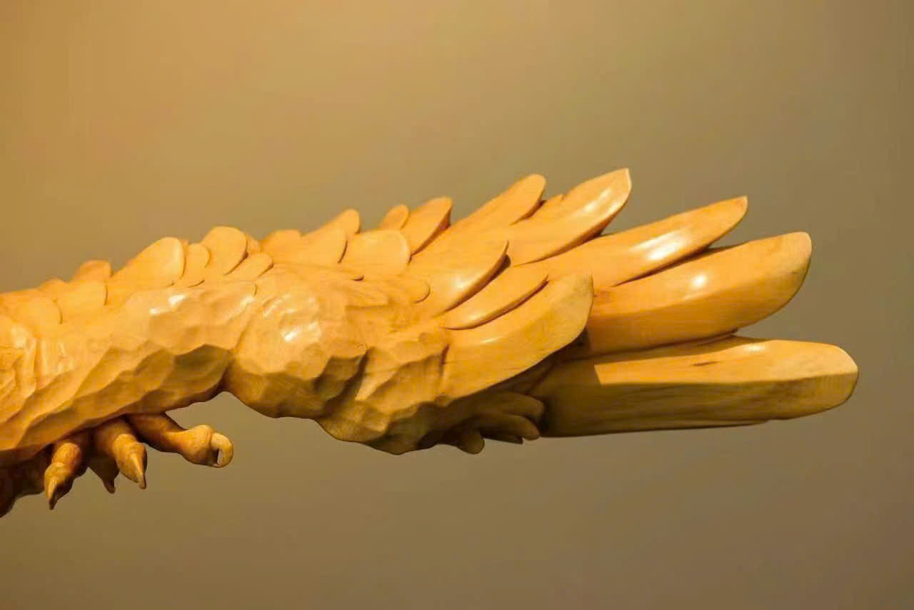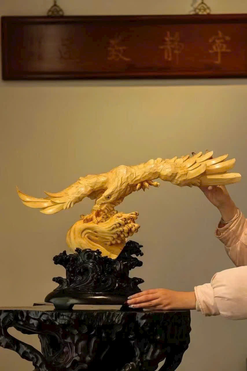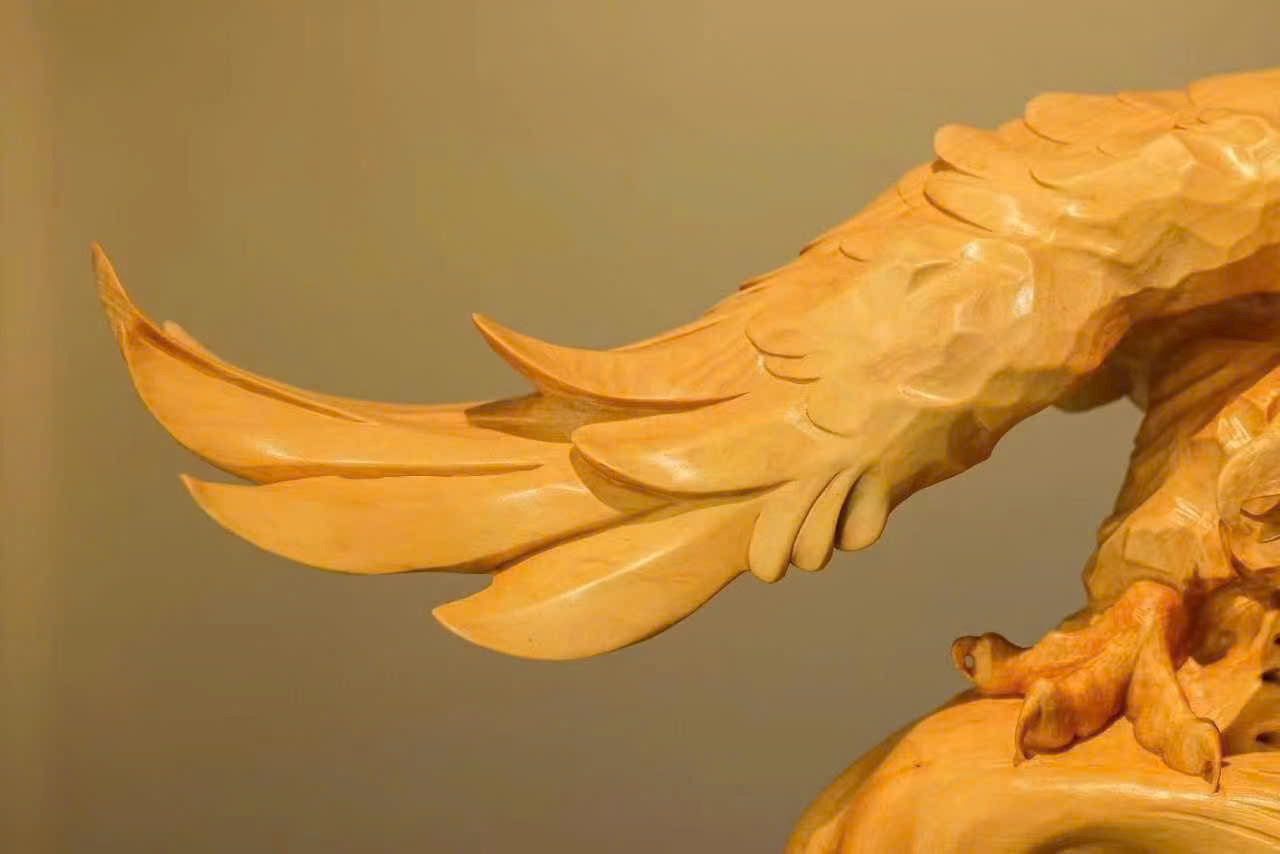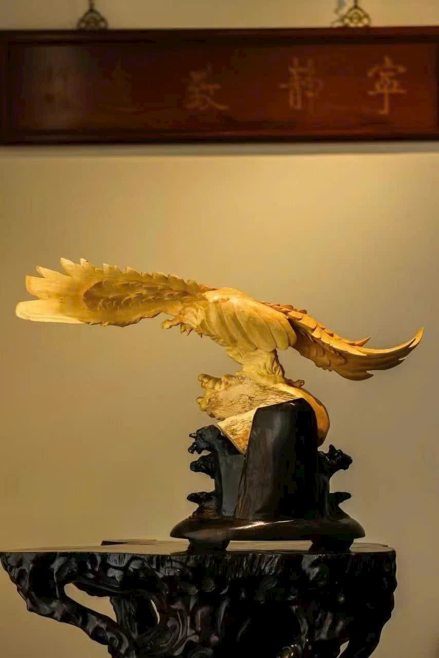 Chọn lọc hoàng dương nguyên khối chạm khắc liền thể, đao pháp kết hợp giữa tả thực và phóng bút. Lông vũ khắc họa tinh vi, đại bàng sải cánh như đứng trên đỉnh núi, đôi cánh rắn rỏi, mạnh mẽ, sẵn sàng lao xuống giữa trường không. Thần thái sống động, khí thế hùng tráng, gửi gắm ý nghĩa đại triển hoành đồ – mở mang sự nghiệp lớn.