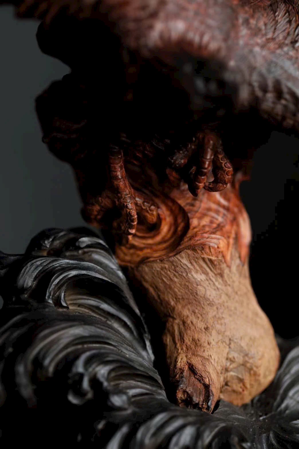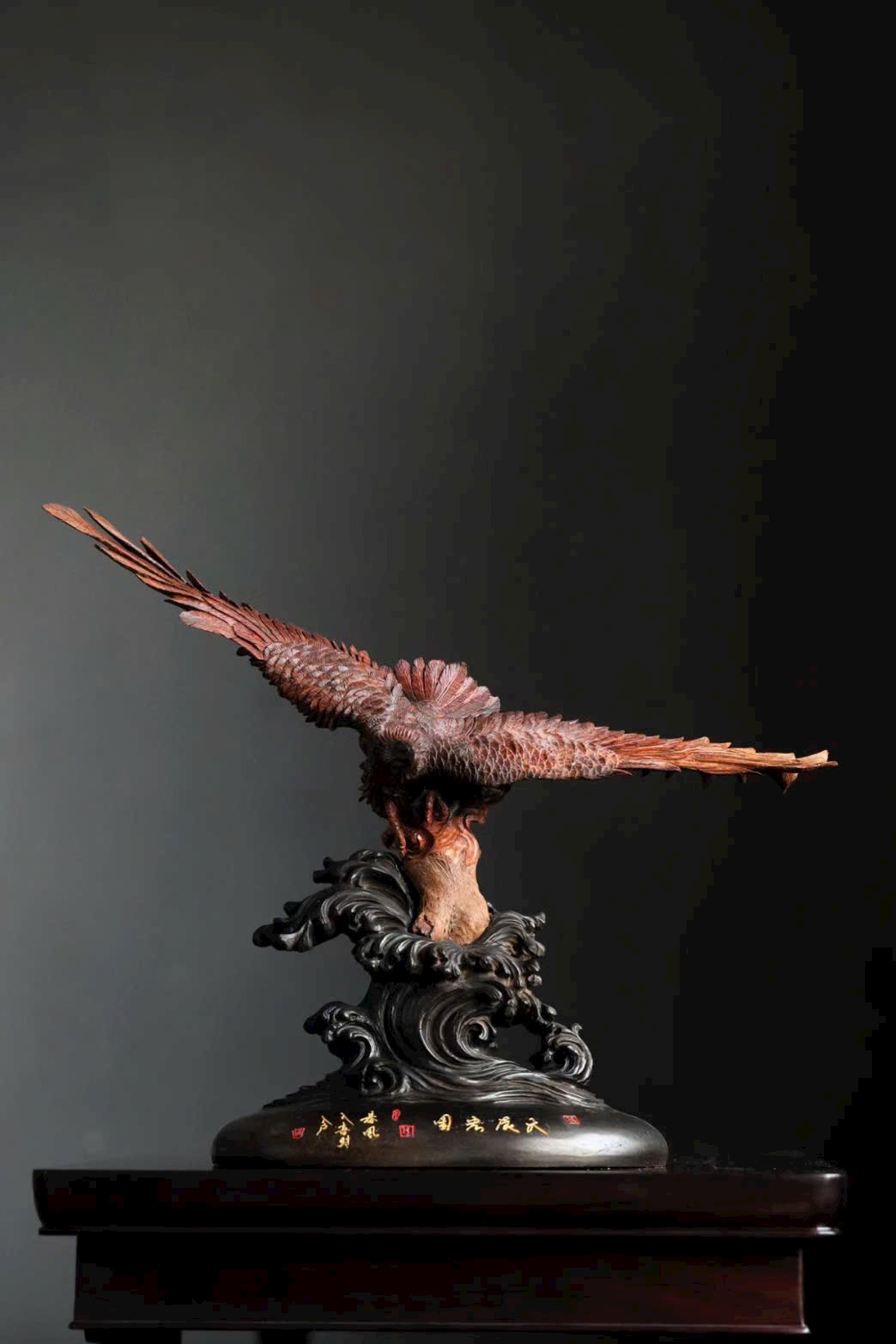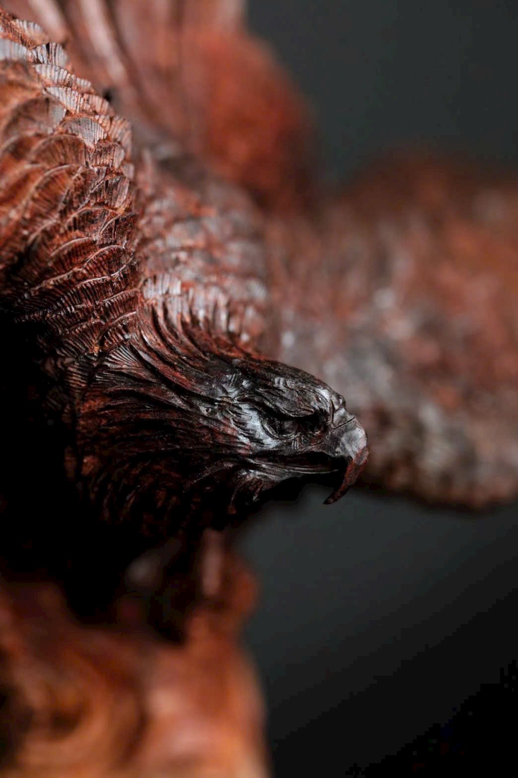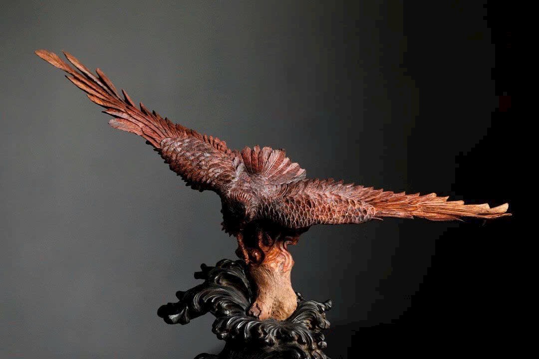 Tạc nguyên khối, chim ưng thân nghiêng về trước, ánh mắt sắc bén nhìn xuống, đôi vuốt mạnh mẽ, đôi cánh sẵn sàng tung bay – thể hiện khí thế vươn cao, bay xa, thành công rực rỡ.