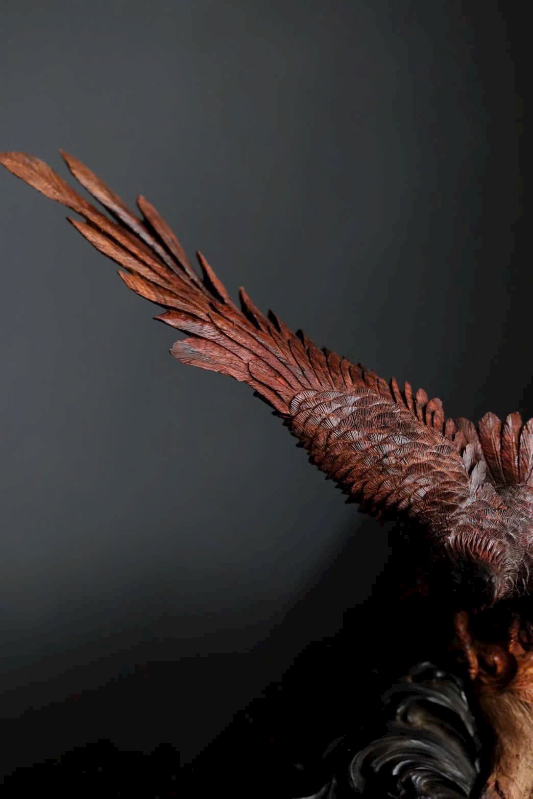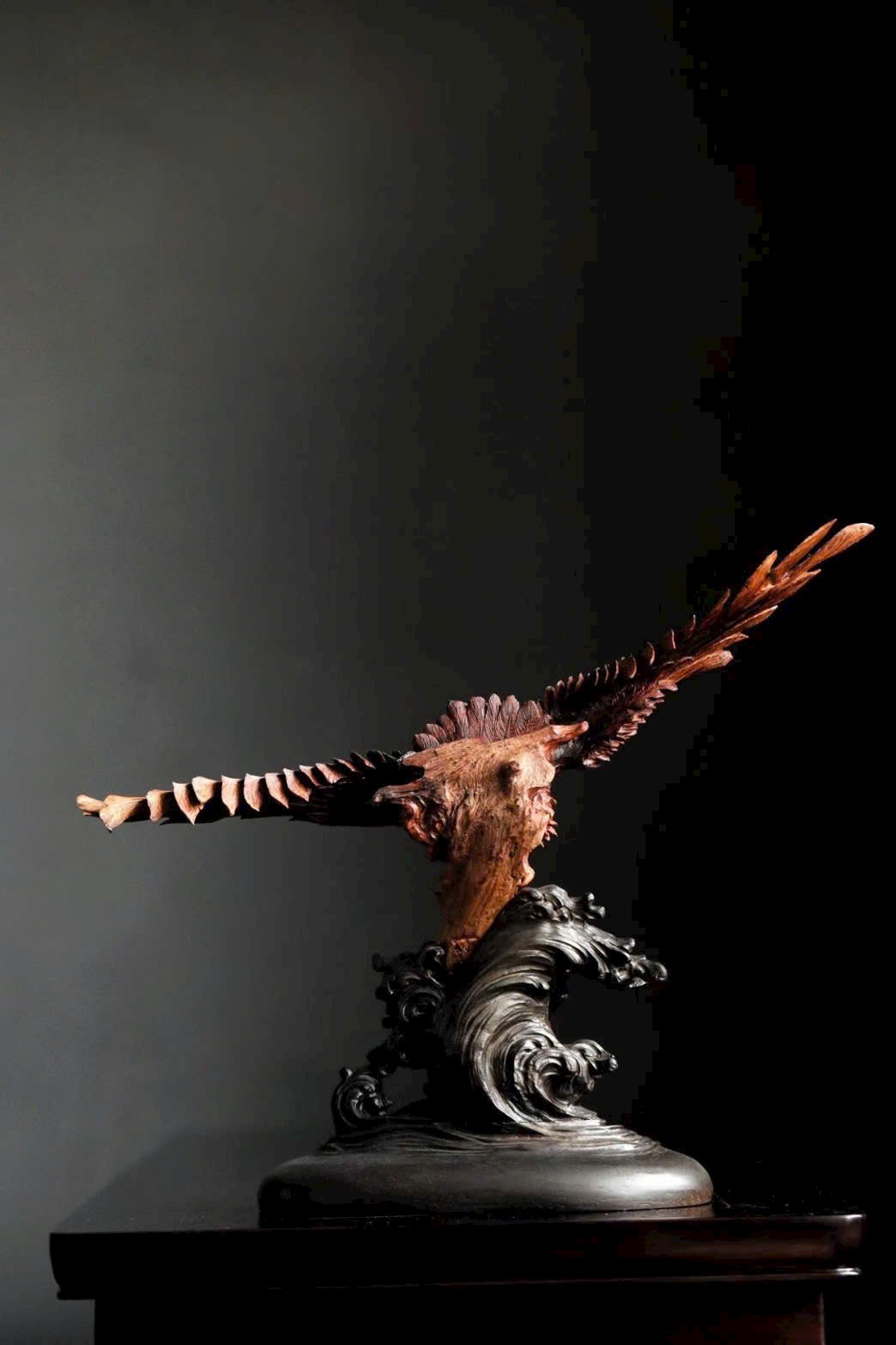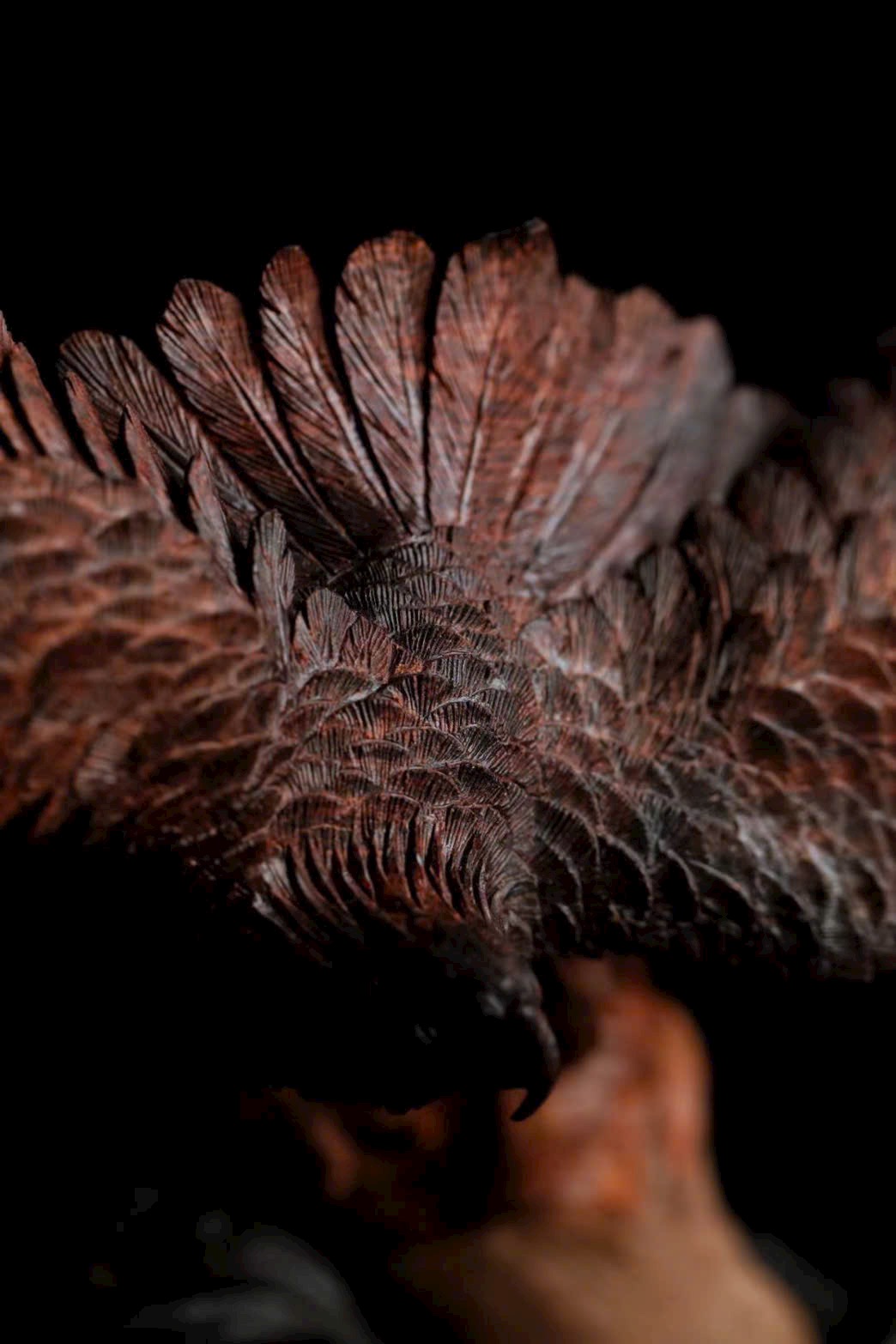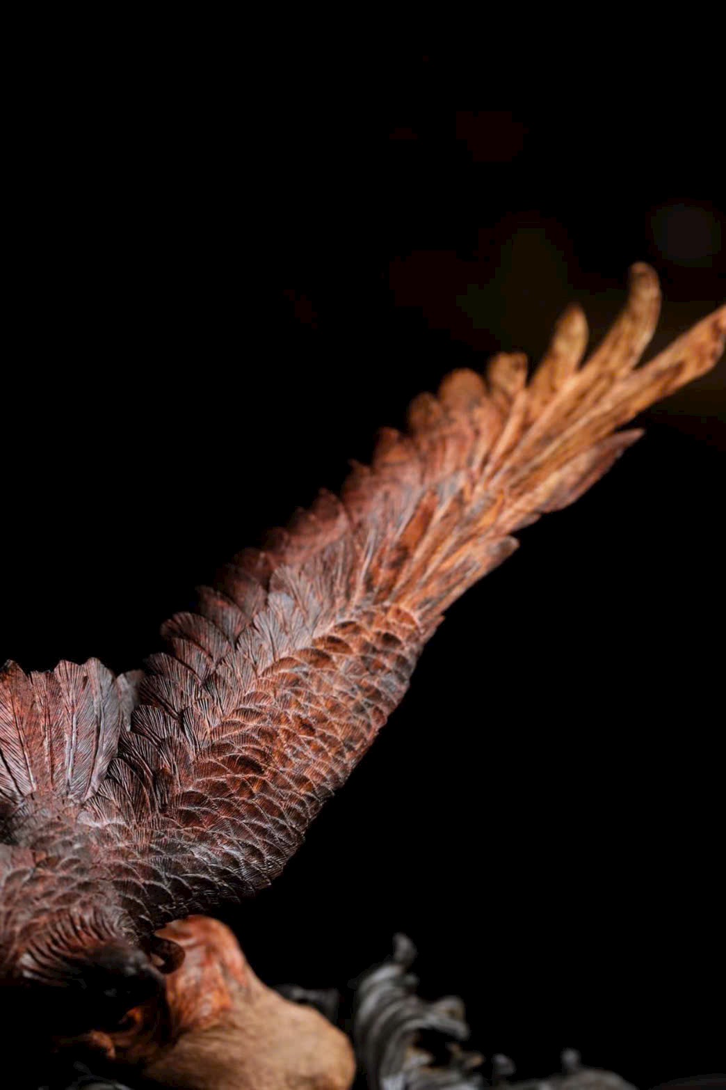 Tạc nguyên khối, chim ưng thân nghiêng về trước, ánh mắt sắc bén nhìn xuống, đôi vuốt mạnh mẽ, đôi cánh sẵn sàng tung bay – thể hiện khí thế vươn cao, bay xa, thành công rực rỡ.