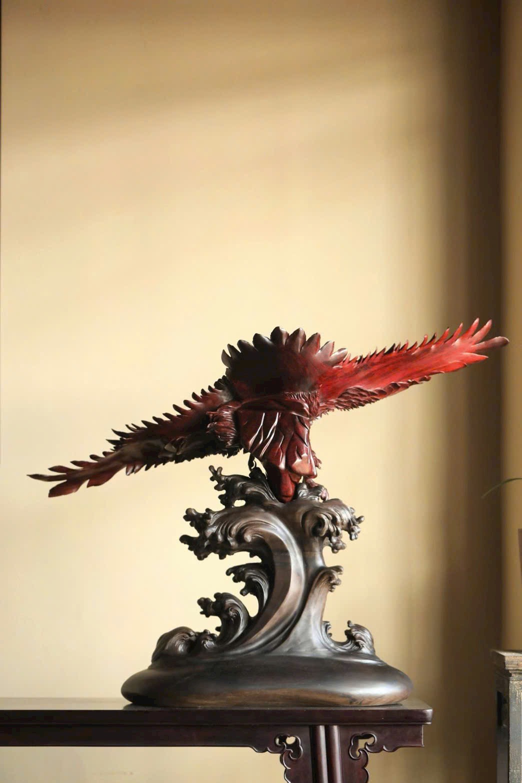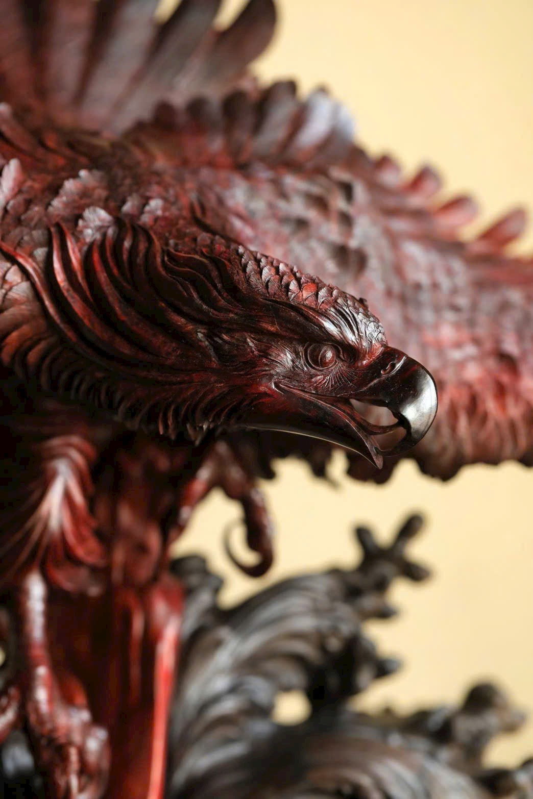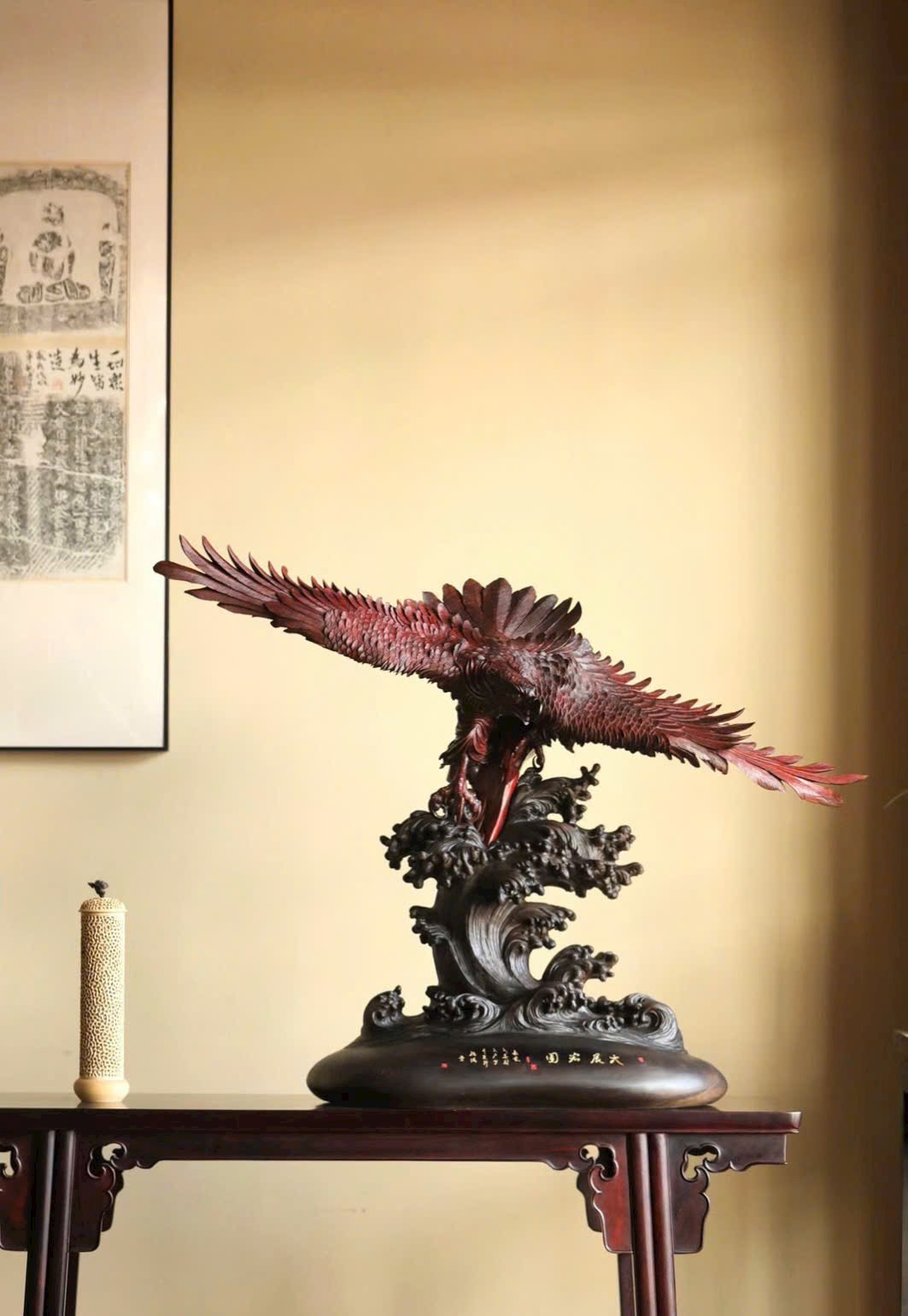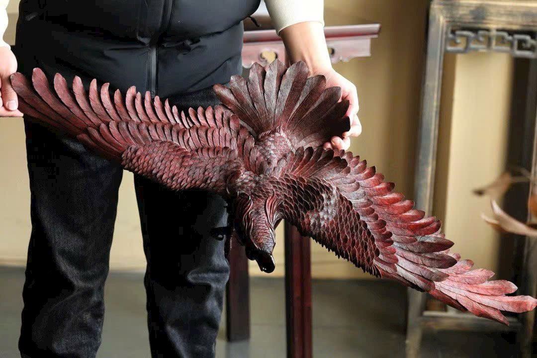 Một khối gỗ nguyên liệu, thủ công chạm khắc tinh xảo. Chim đại bàng thân mình hướng về phía trước, ánh mắt sắc bén uy nghiêm nhìn thẳng xuống dưới, thần thái vô cùng sống động. Đôi vuốt mạnh mẽ hữu lực, đôi cánh dang rộng như sẵn sàng bay vút lên không, khí thế tựa vươn thẳng lên mây xanh.