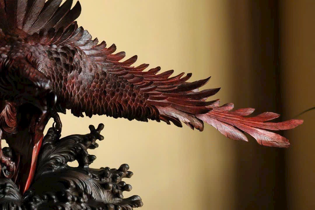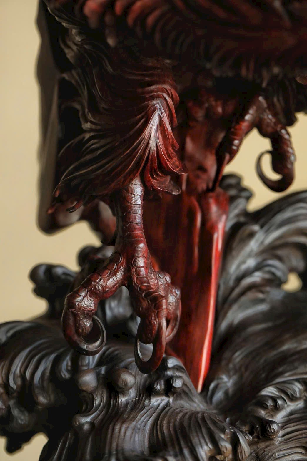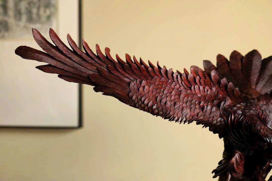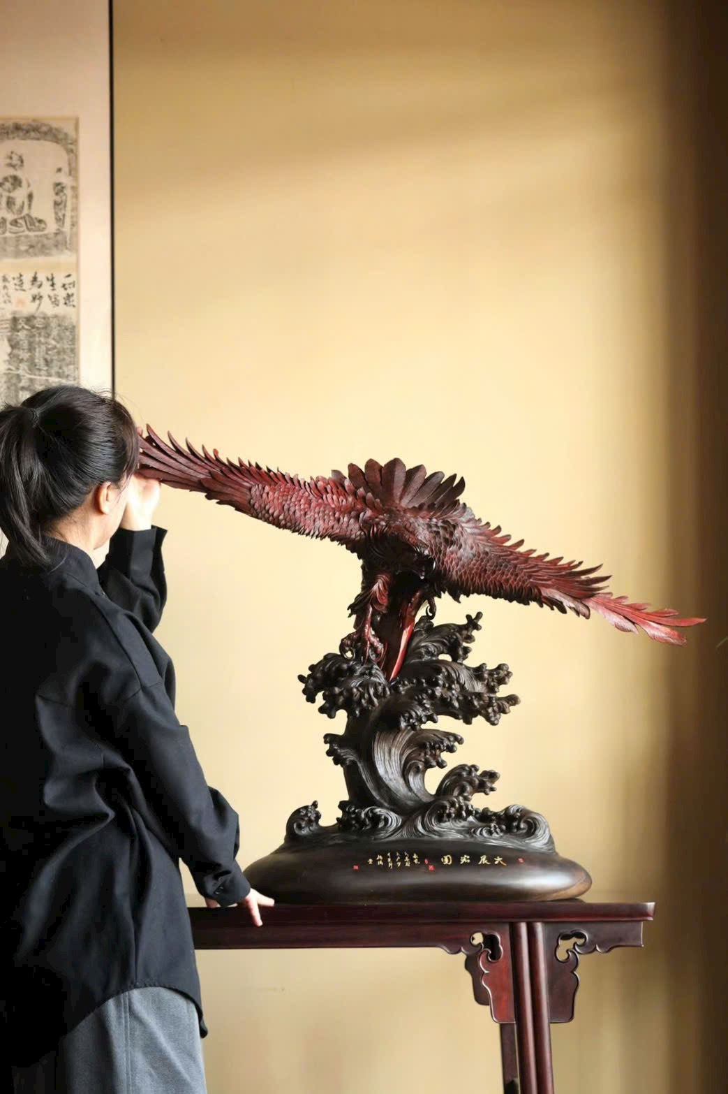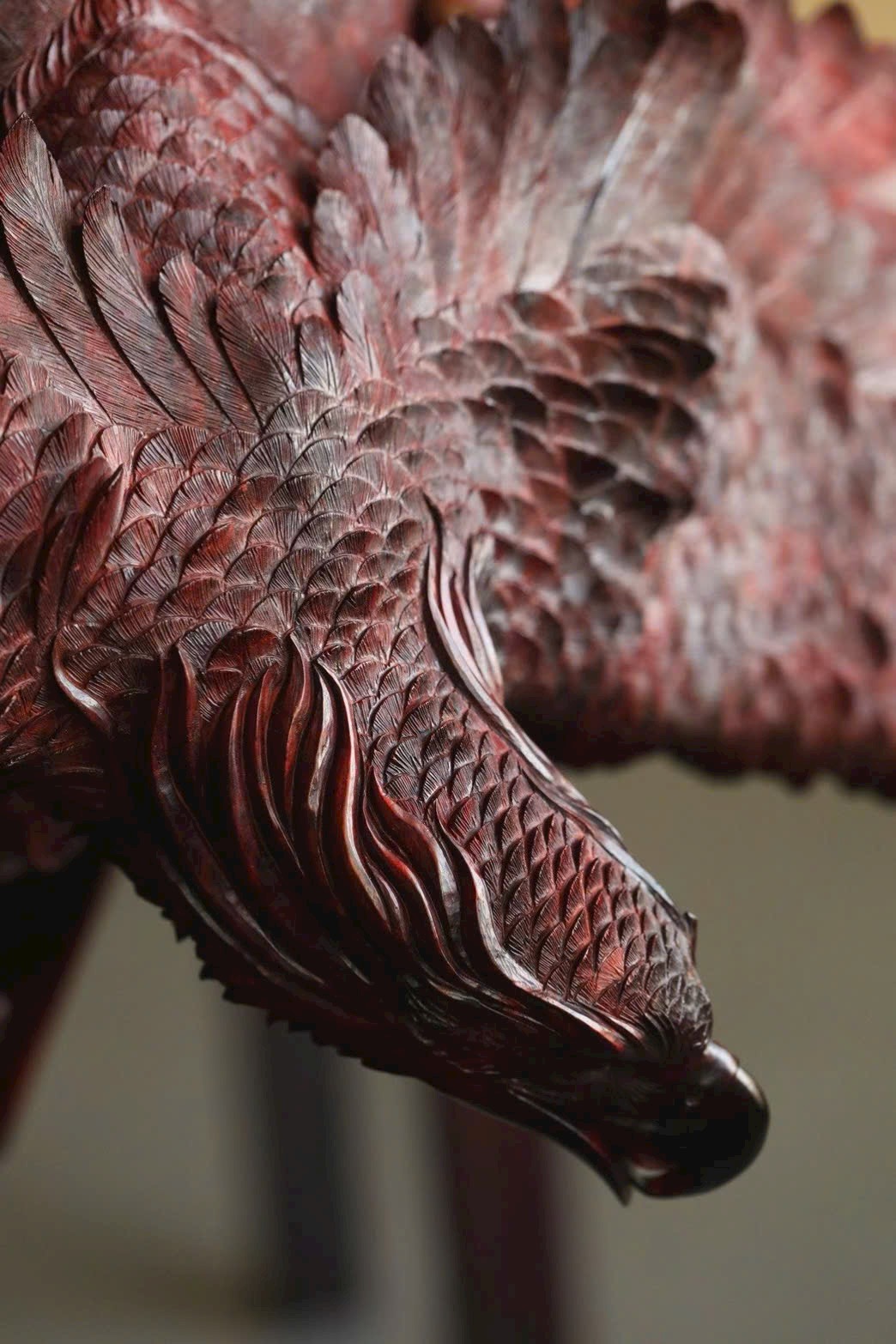 Một khối gỗ nguyên liệu, thủ công chạm khắc tinh xảo. Chim đại bàng thân mình hướng về phía trước, ánh mắt sắc bén uy nghiêm nhìn thẳng xuống dưới, thần thái vô cùng sống động. Đôi vuốt mạnh mẽ hữu lực, đôi cánh dang rộng như sẵn sàng bay vút lên không, khí thế tựa vươn thẳng lên mây xanh.