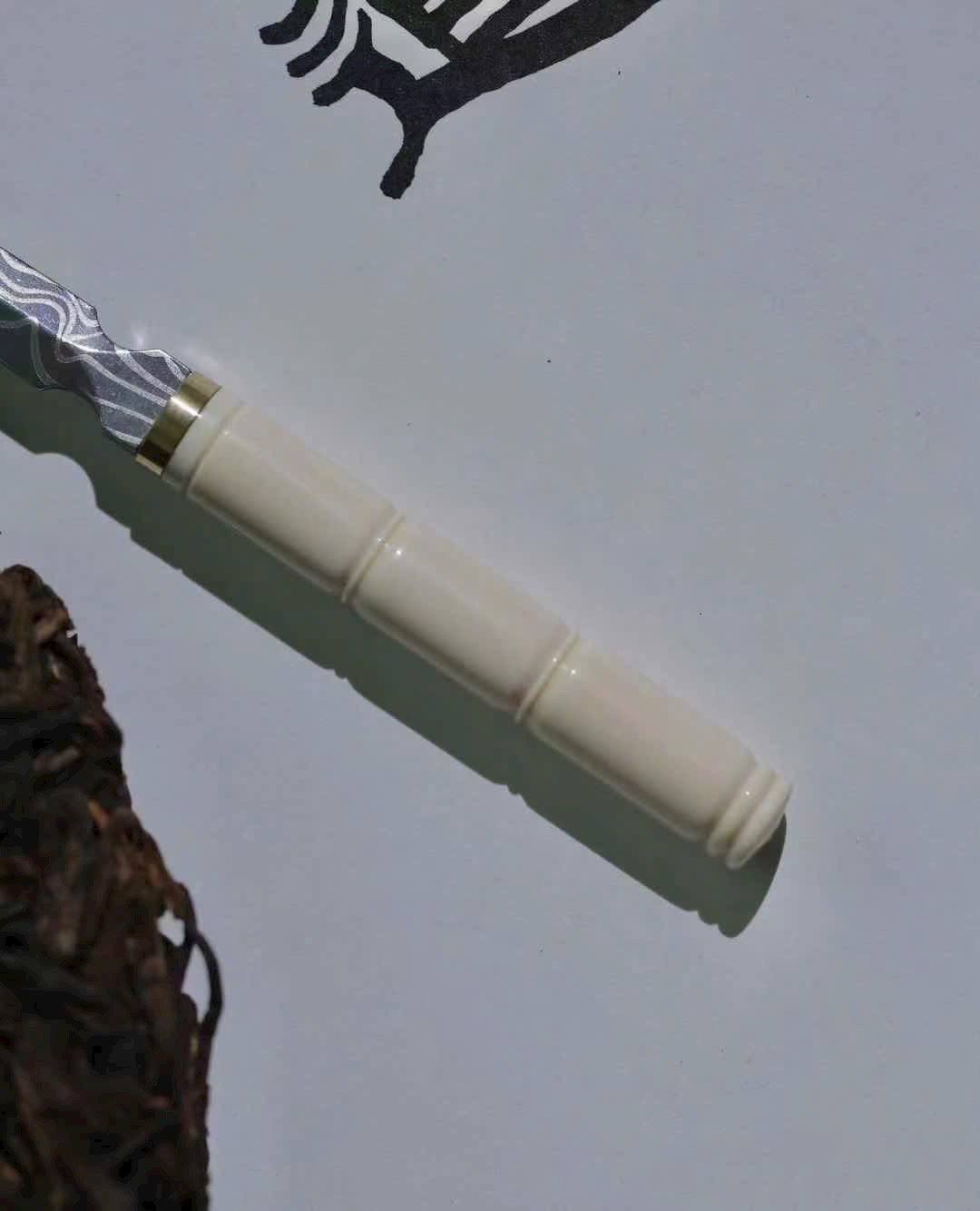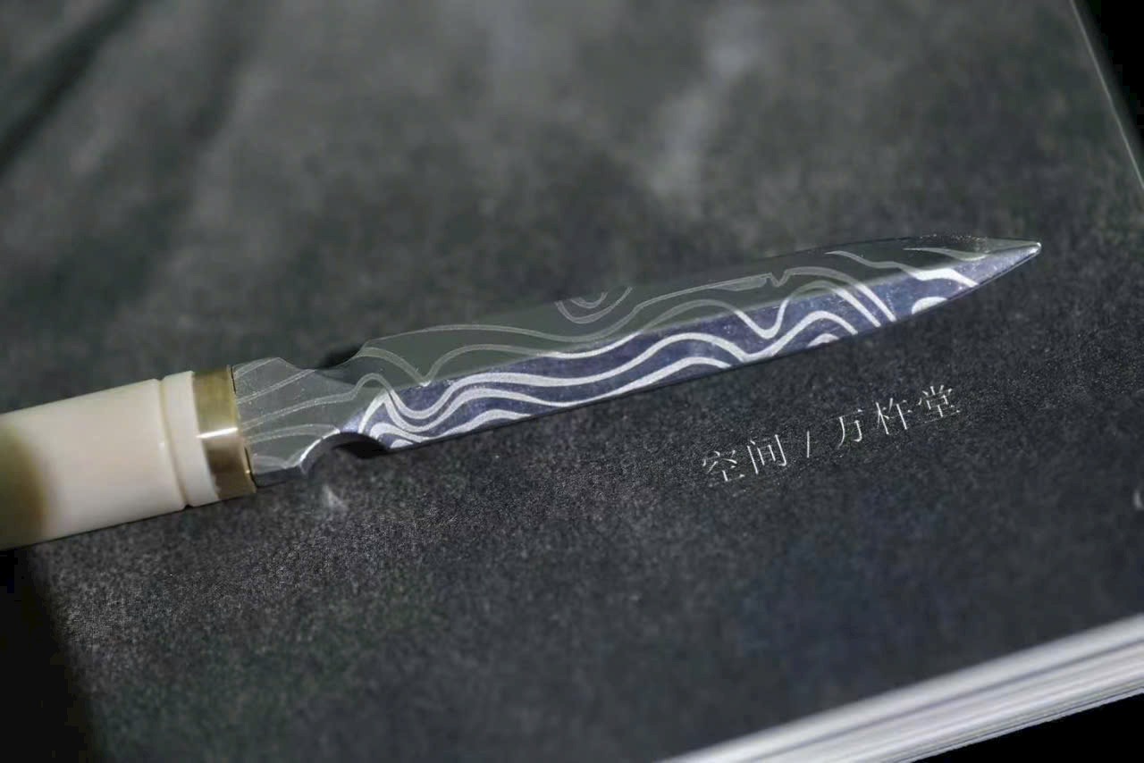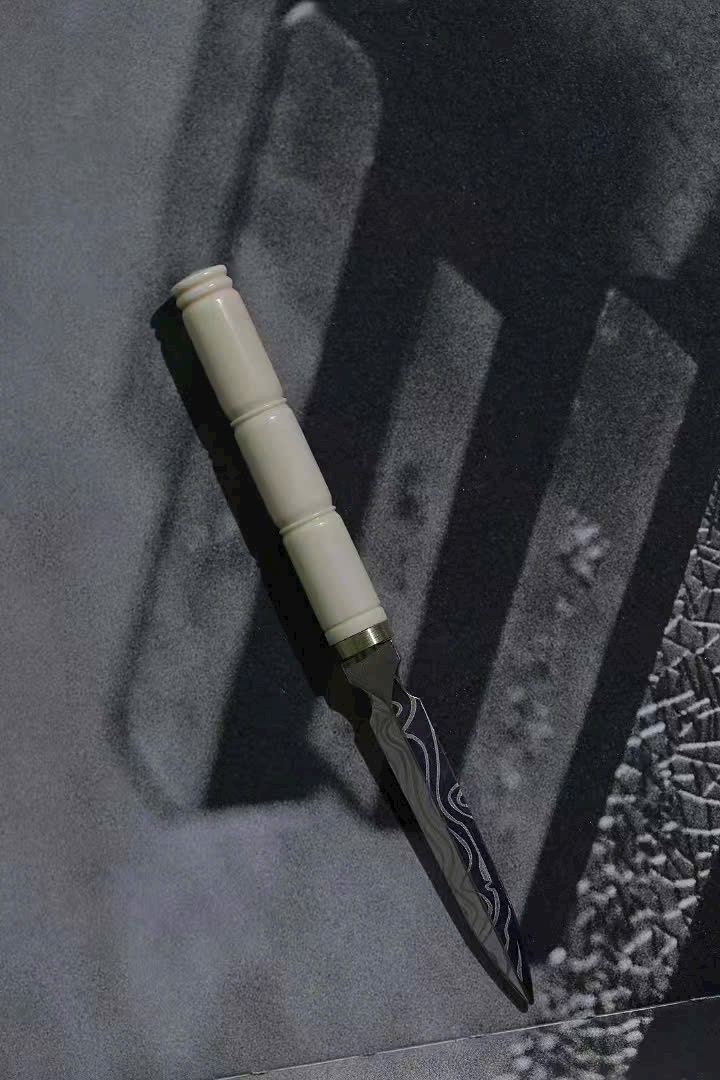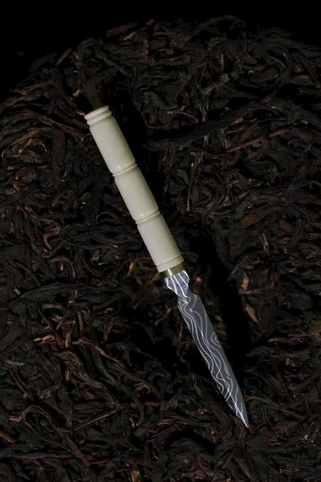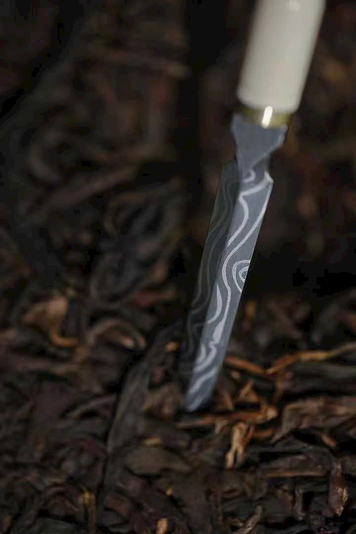 Sở hữu một dao trà n.gà ma mút, cán dao trắng n.gà ấm mịn như ngọc, lưỡi dao có hoa văn tự nhiên tinh xảo, độc đáo.