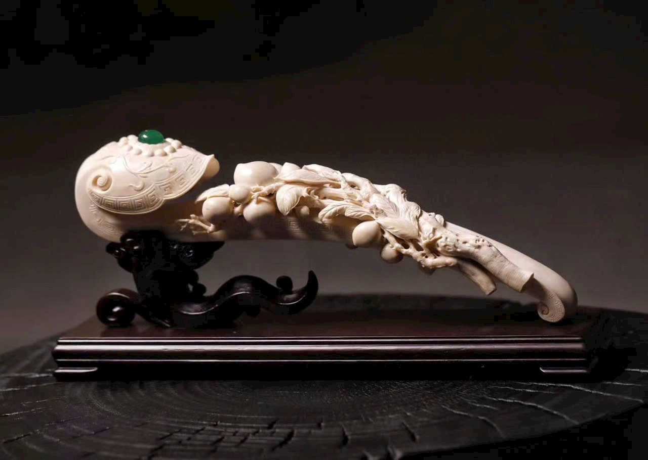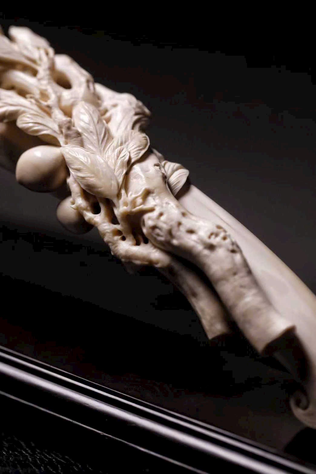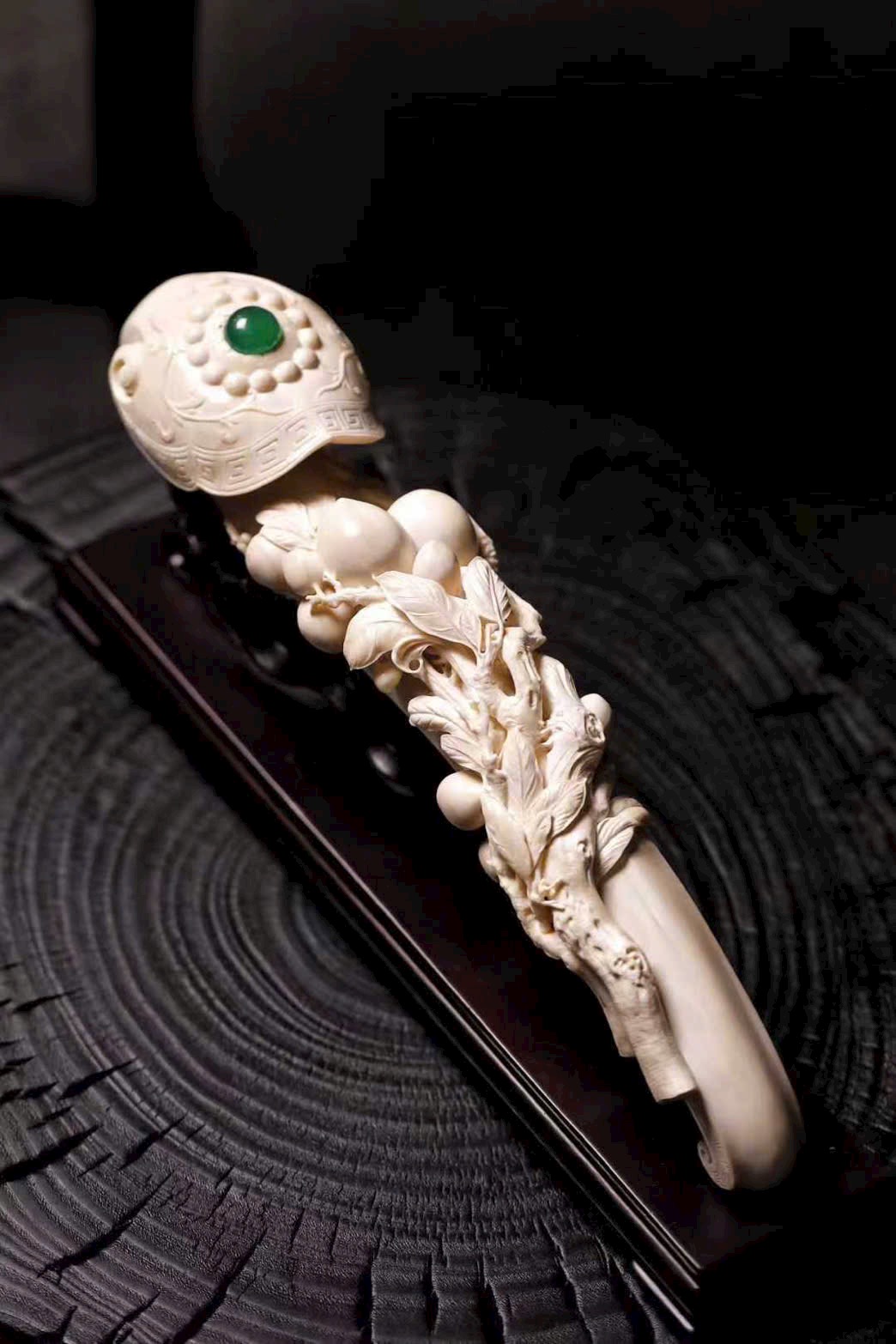 Tác phẩm được chạm khắc hoàn toàn từ n.gà voi ma mút nguyên khối, sắc chất trắng ngà ấm nhuận. Đầu trên khảm viên ngọc tròn, toàn thể khắc hình đào thọ, cành lá uốn lượn linh động, mang ý nghĩa phúc thọ dài lâu.