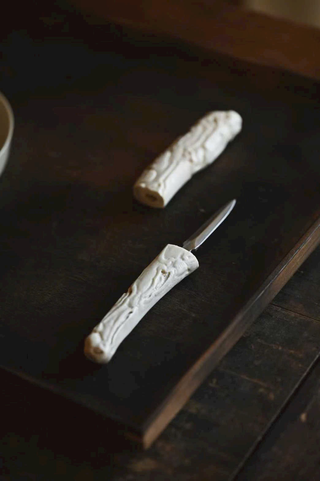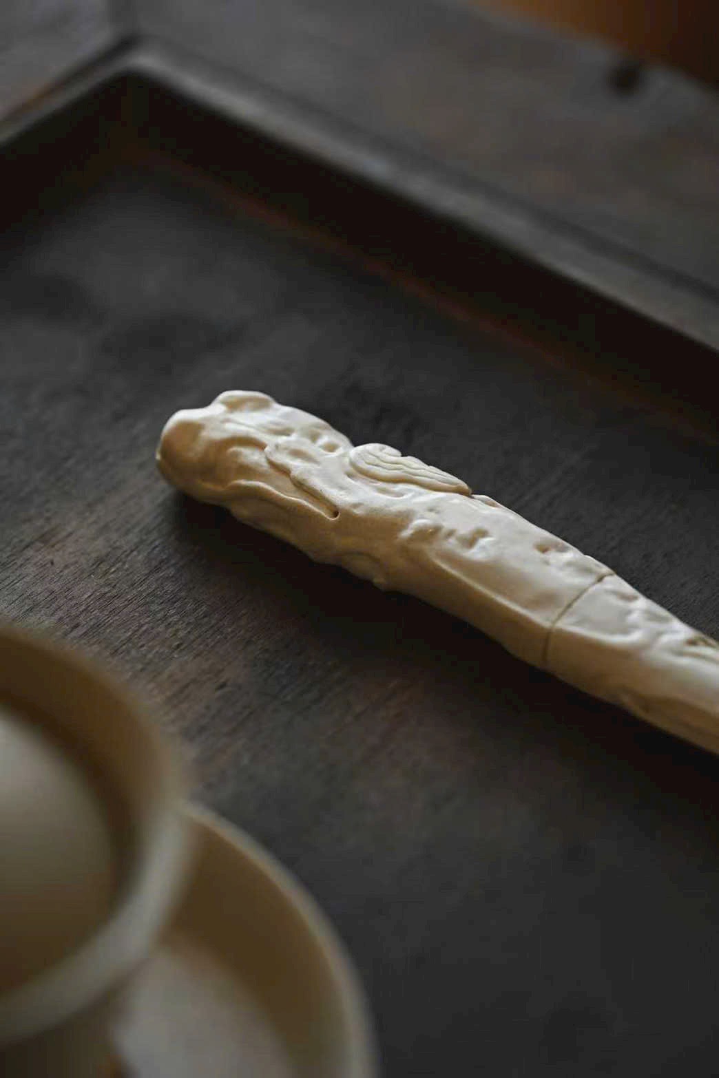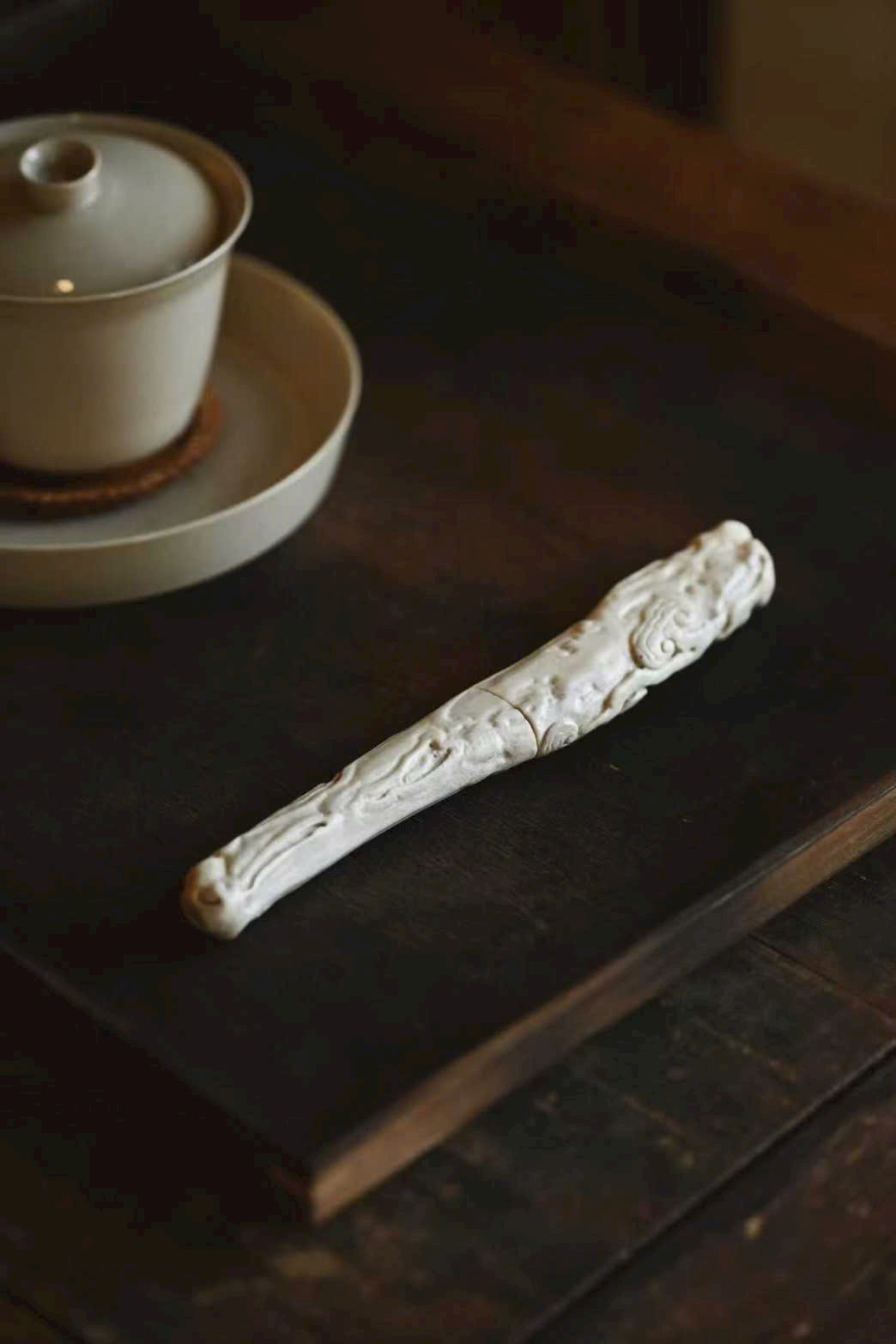 Chọn chất liệu sừng hươu mịn màng, ấm áp; trên thân dao chạm khắc linh chi quấn quanh, tầng lớp sinh động, điêu khắc tinh xảo, mang vẻ cổ mộc mà tao nhã. Đặt trên bàn trà, phong vị càng thêm thanh nhã.