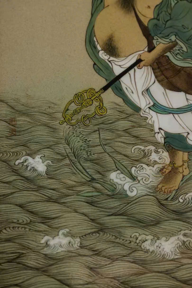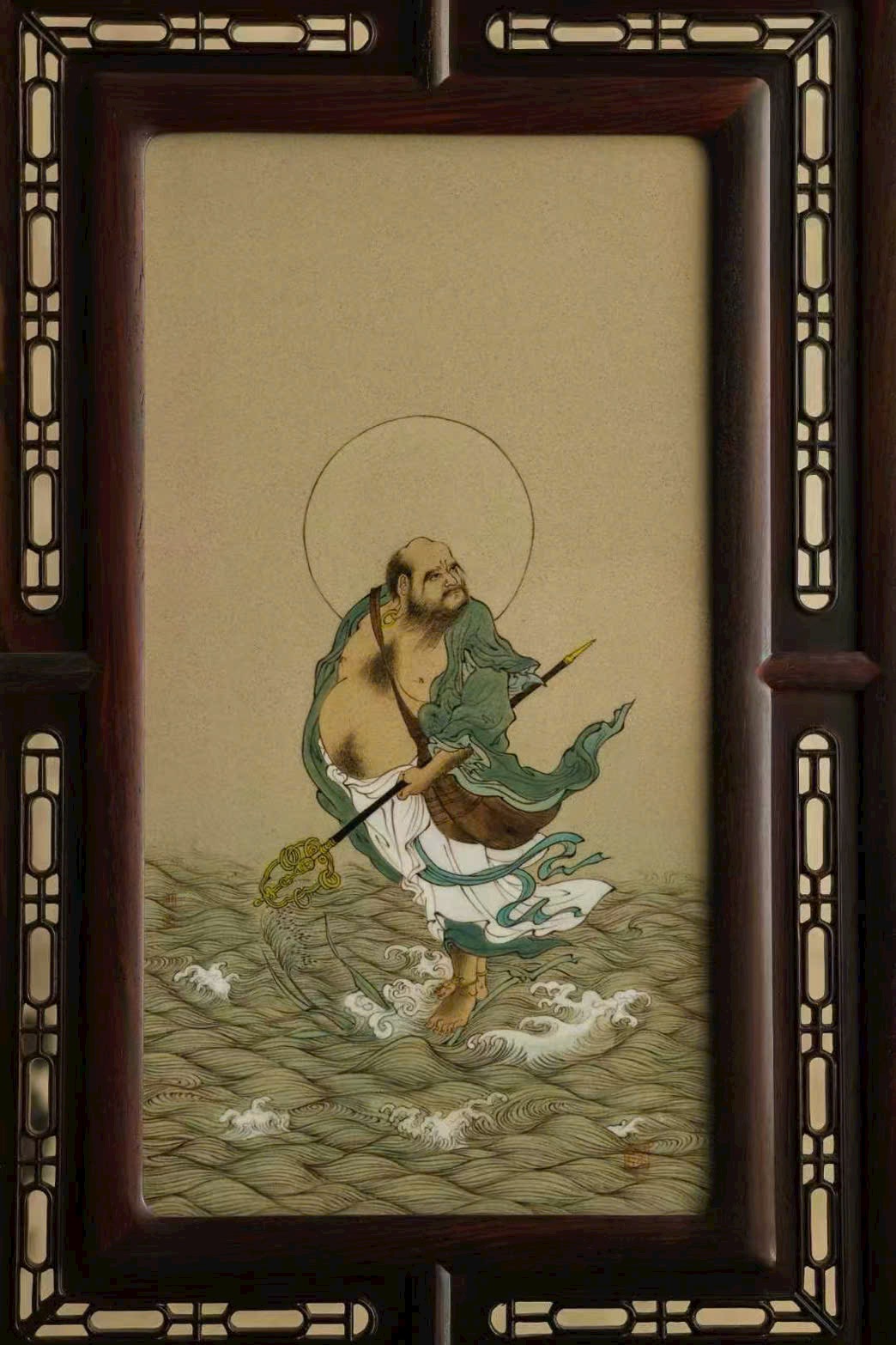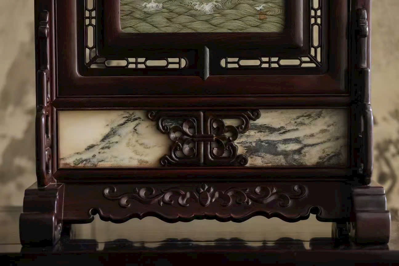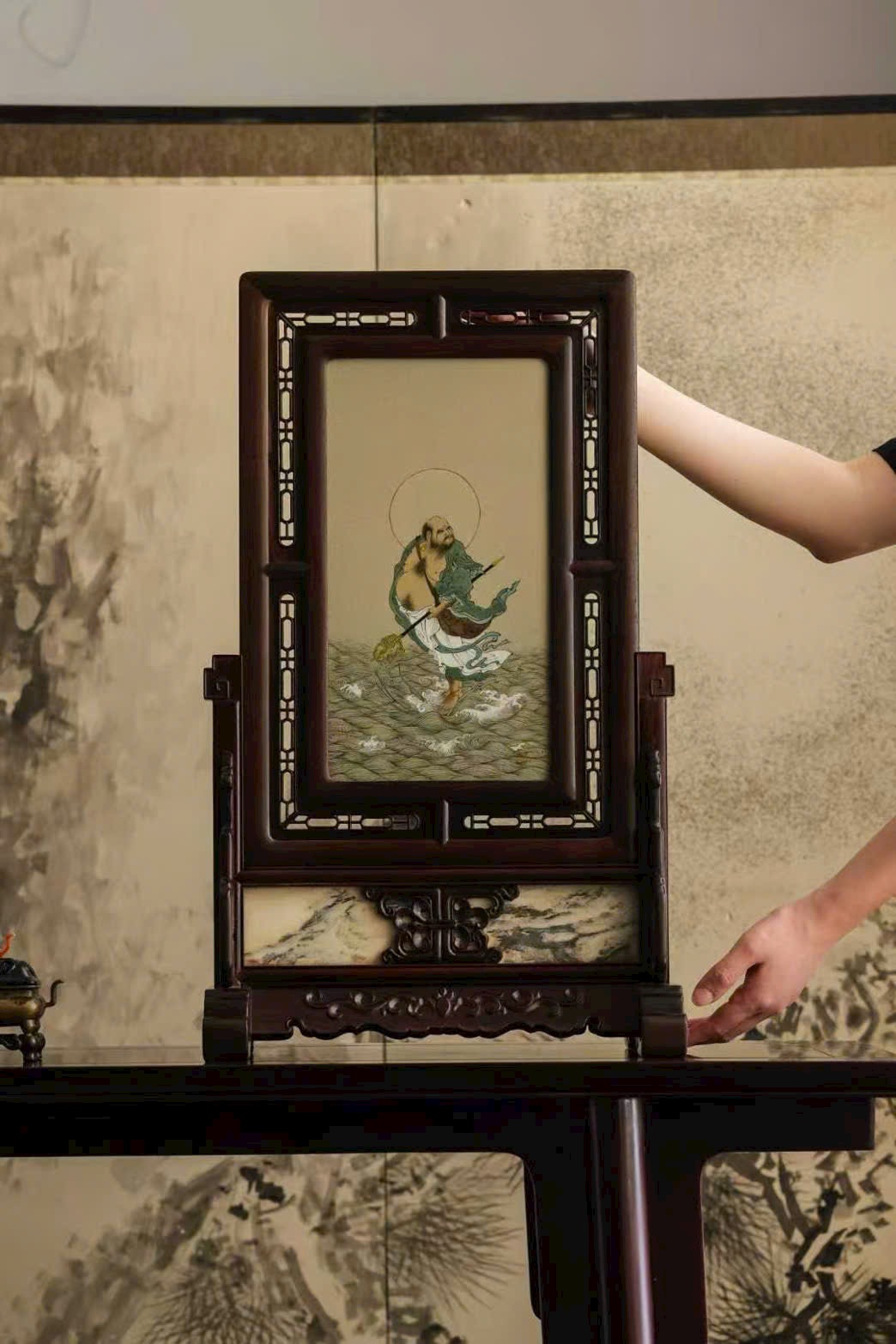 Một tấm bình phong cắm bằng gỗ trắc đỏ, kết tụ phong hoa của thời gian. Lõi là tranh sứ, vẽ cảnh Đạt Ma vượt sông, thần thái sống động, bút pháp tinh tế, thiền ý hiển hiện. Khung và đế bằng gỗ hồng toan, ấm nhuận, chắc bền; điểm xuyết vân thạch tựa mây lành. Bày trong không gian thanh nhã, mang ý nghĩa trừ tai – nạp cát, thiền vị lan tỏa, an tĩnh thưởng ngoạn vẻ đẹp Đông phương và phúc trạch lâu dài.