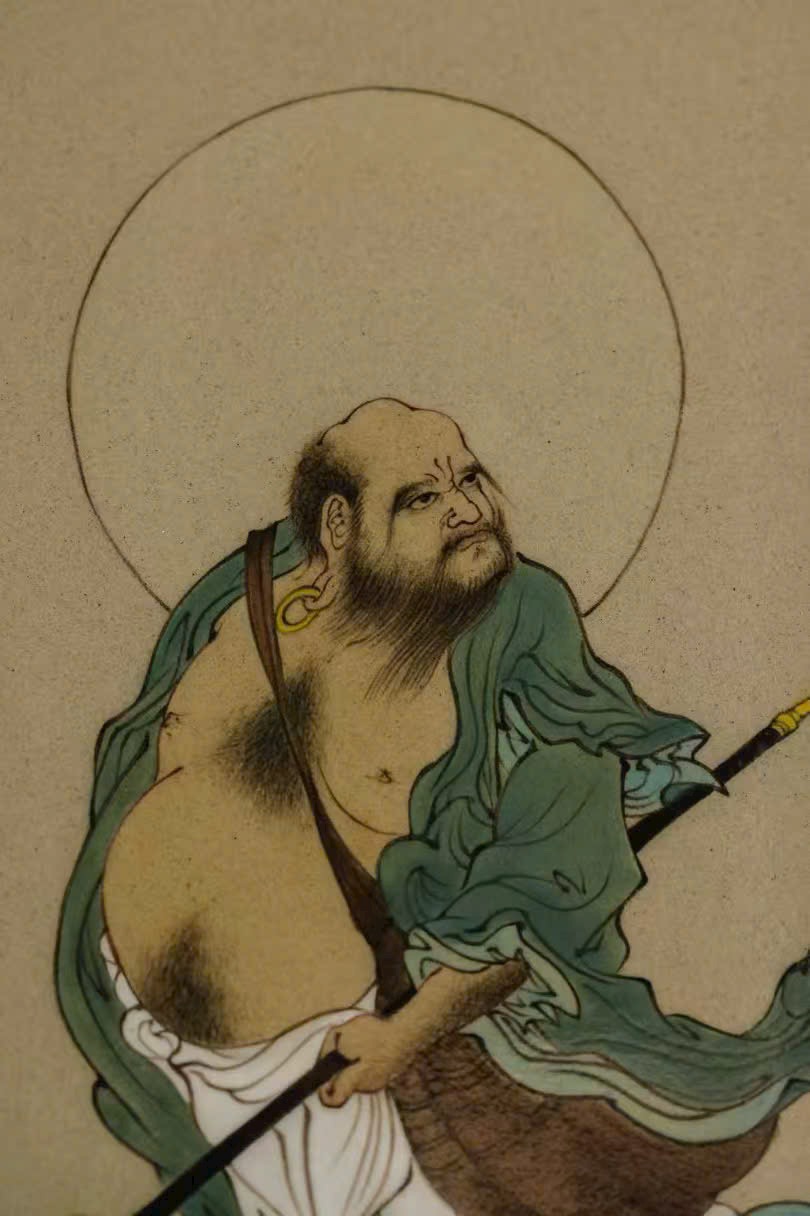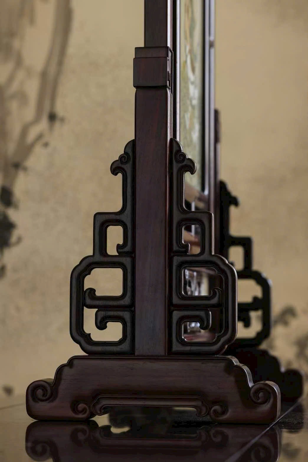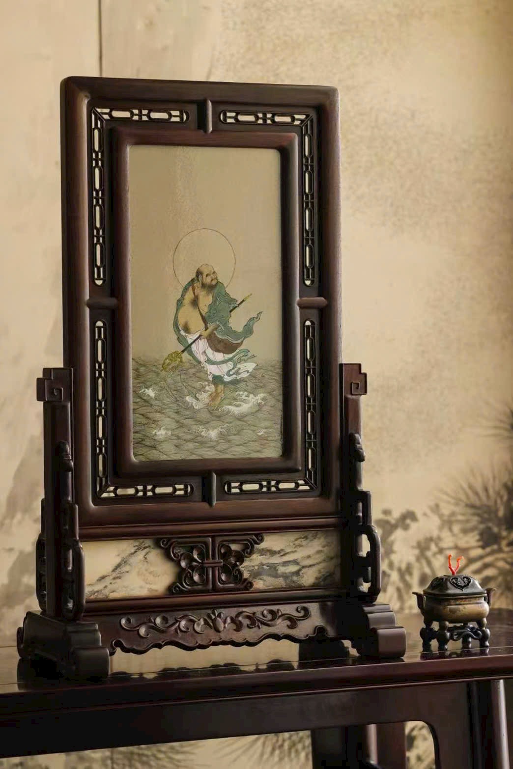 Gỗ trắc đỏ × tranh sứ | “Đạt Ma Độ Giang” – bình phong cắm
