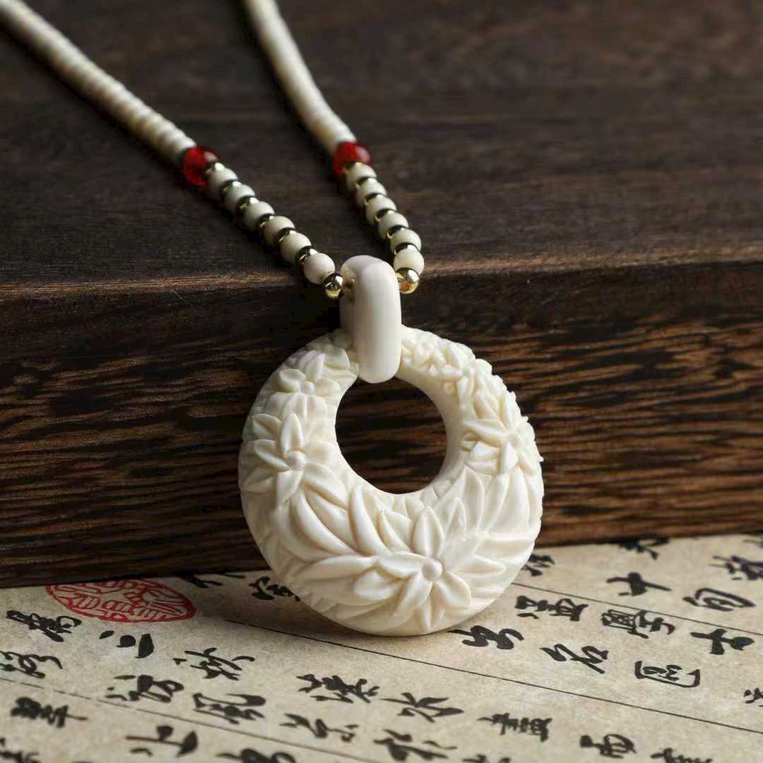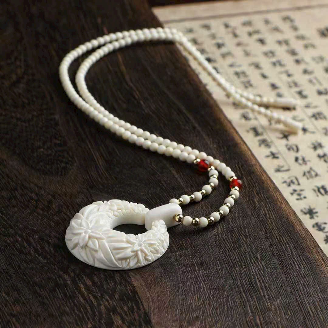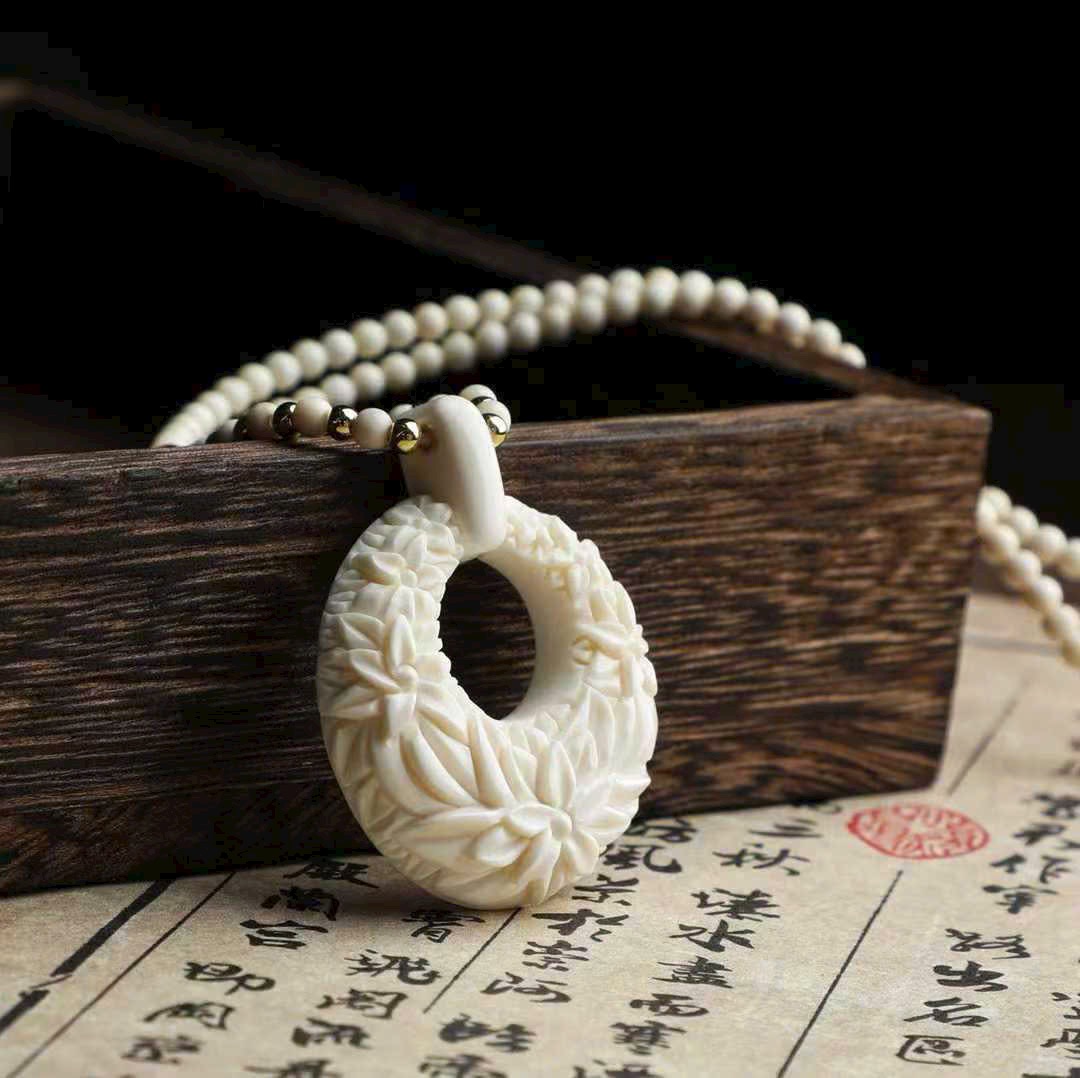 Tác phẩm thượng phẩm tinh tuyển, phối chuỗi hạt phong cách Hồng Kông đường kính 3mm cùng mặt hoa ngọc lan kích thước 42×35×8mm, kèm khóa ngà tiện lợi khi đeo. Tổng trọng lượng khoảng 14g.