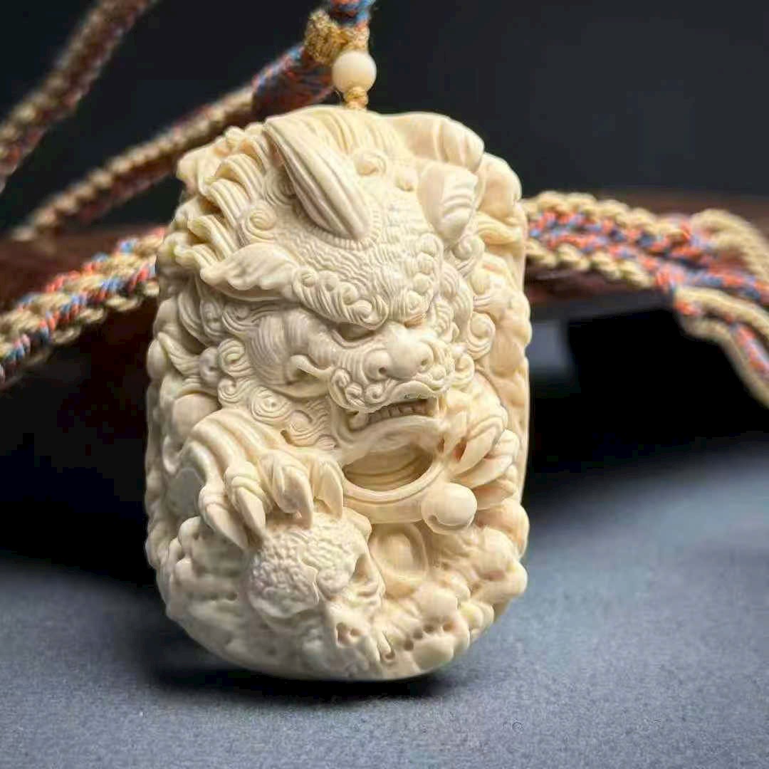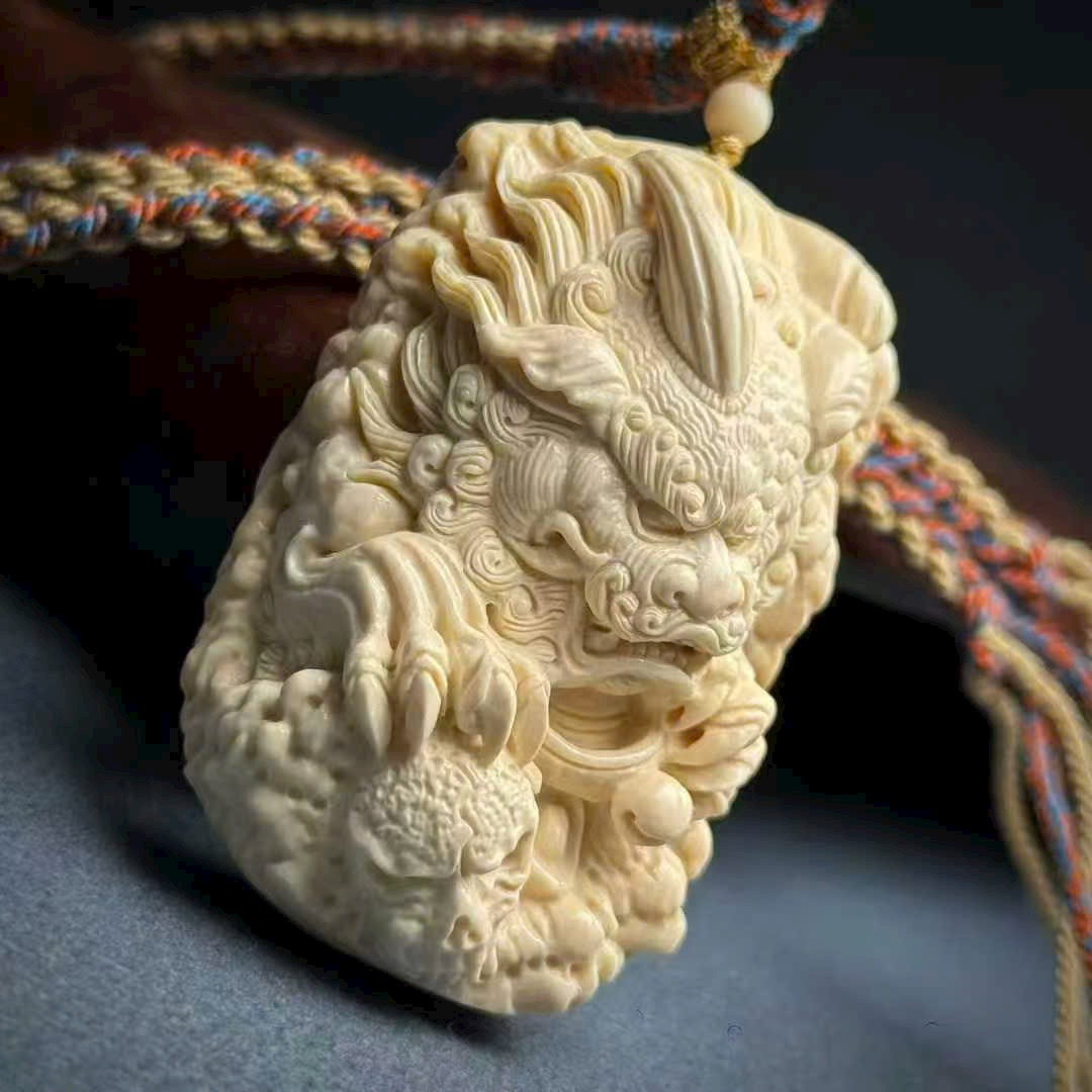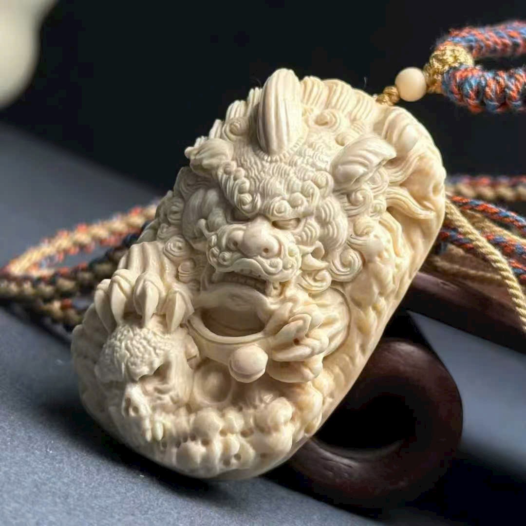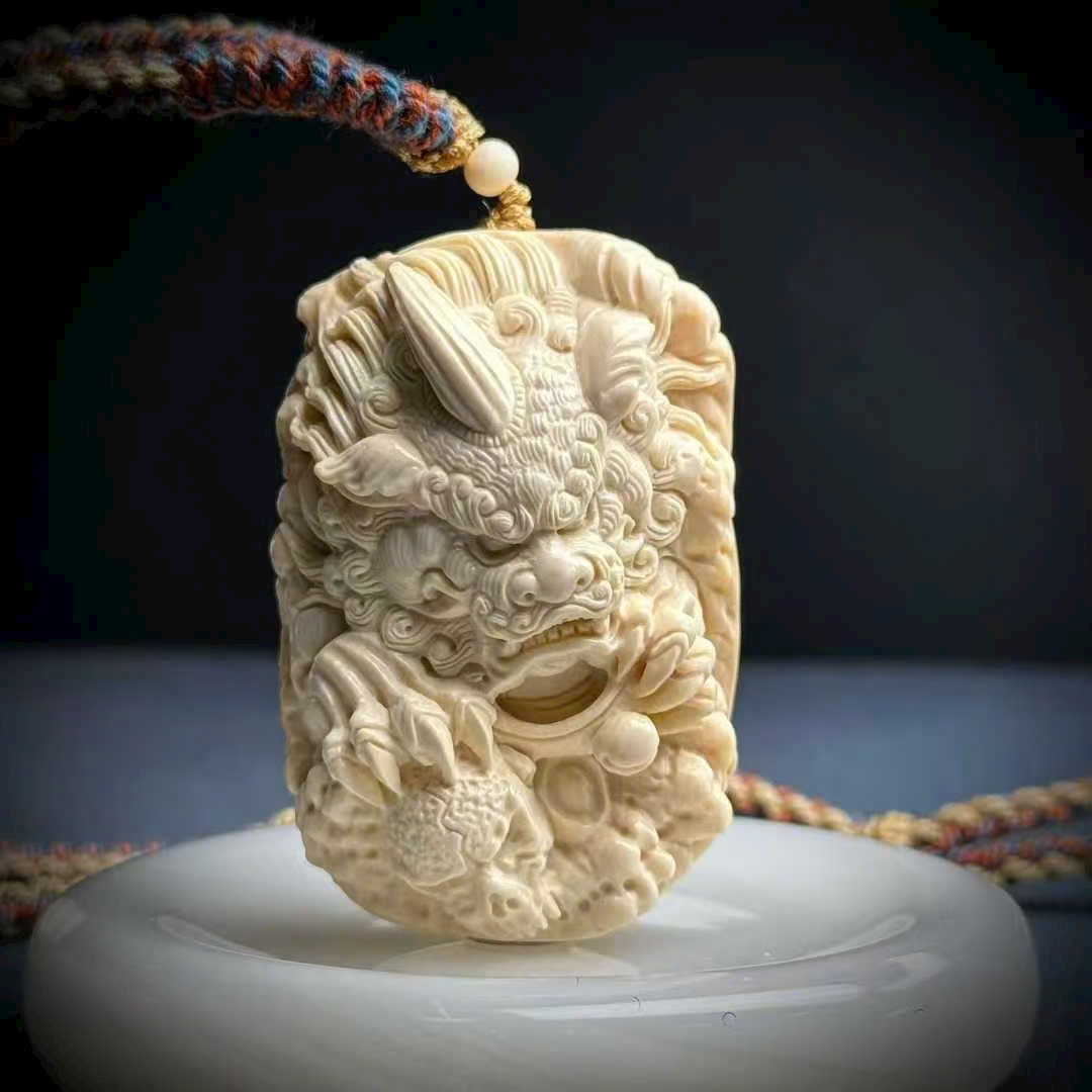 Tượng thần thú Đế Thính được chạm khắc từ n.gà ma mút, bờm cuộn xoáy như sóng, thần thái uy nghi nhưng điềm tĩnh, miệng ngậm ngọc linh, tỏa ra khí cát tường. Hoa văn trên thân tượng mang ý nghĩa phân biệt thiện ác, trấn giữ nhà cửa, chiêu tài đón lộc. Treo bên mình, đây vừa là tác phẩm tinh xảo của thời gian, vừa là vật hộ mệnh mang may mắn và bình an.