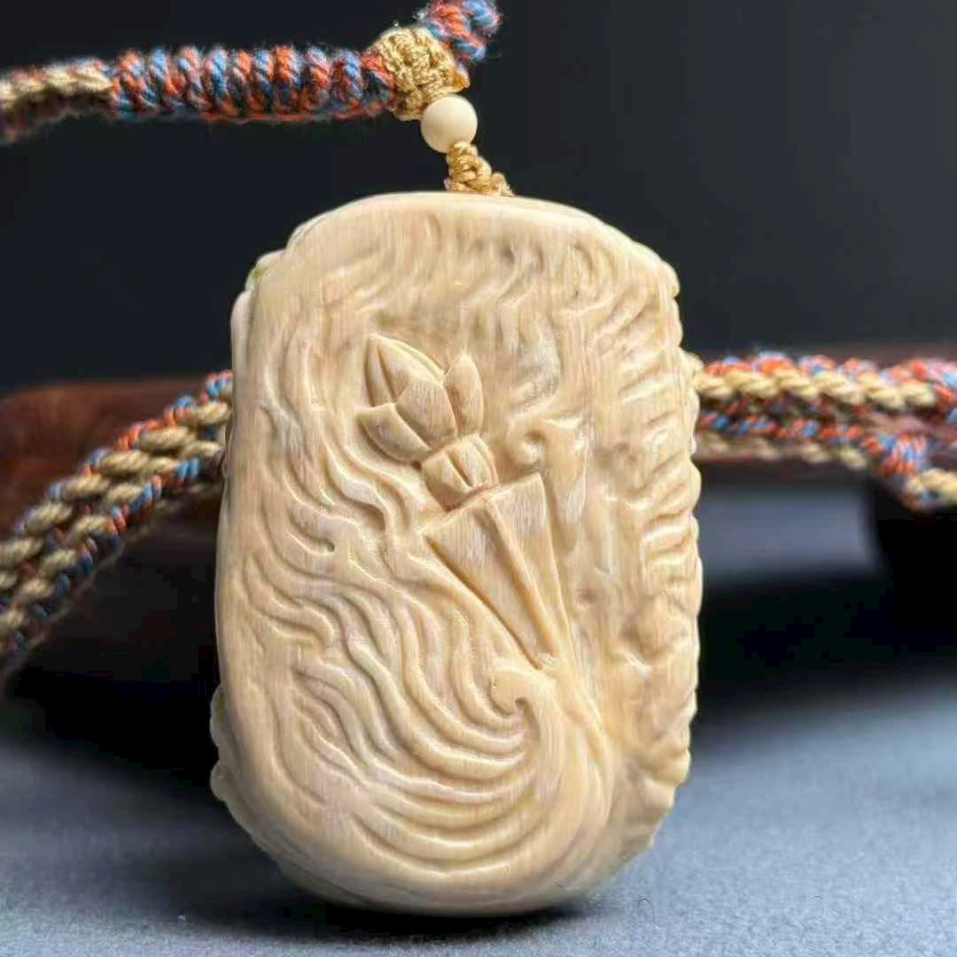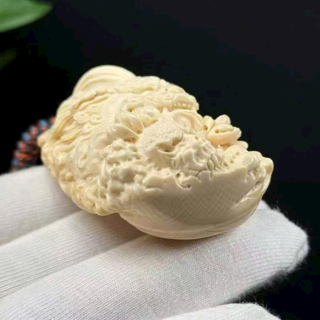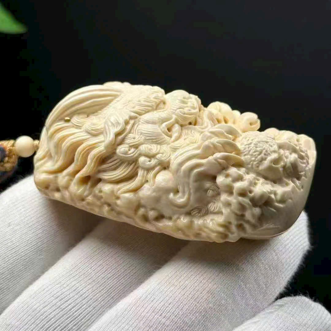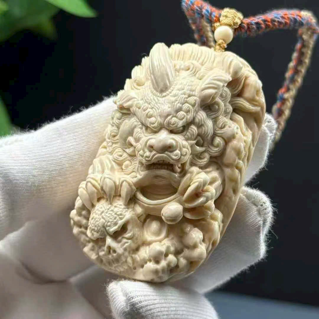 Tượng thần thú Đế Thính được chạm khắc từ n.gà ma mút, bờm cuộn xoáy như sóng, thần thái uy nghi nhưng điềm tĩnh, miệng ngậm ngọc linh, tỏa ra khí cát tường. Hoa văn trên thân tượng mang ý nghĩa phân biệt thiện ác, trấn giữ nhà cửa, chiêu tài đón lộc. Treo bên mình, đây vừa là tác phẩm tinh xảo của thời gian, vừa là vật hộ mệnh mang may mắn và bình an.