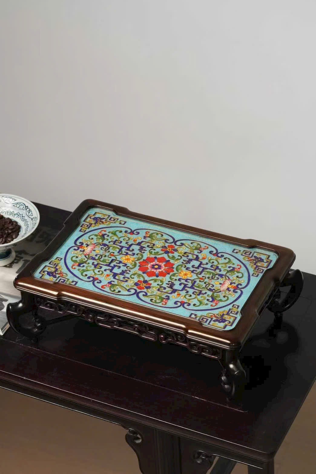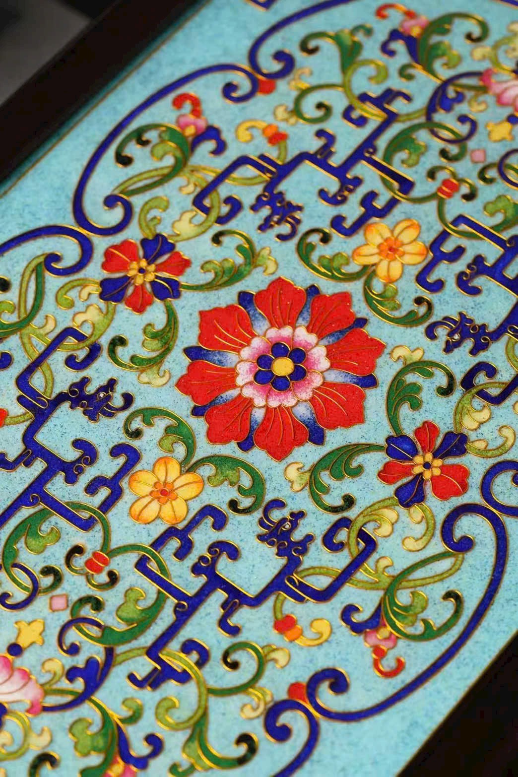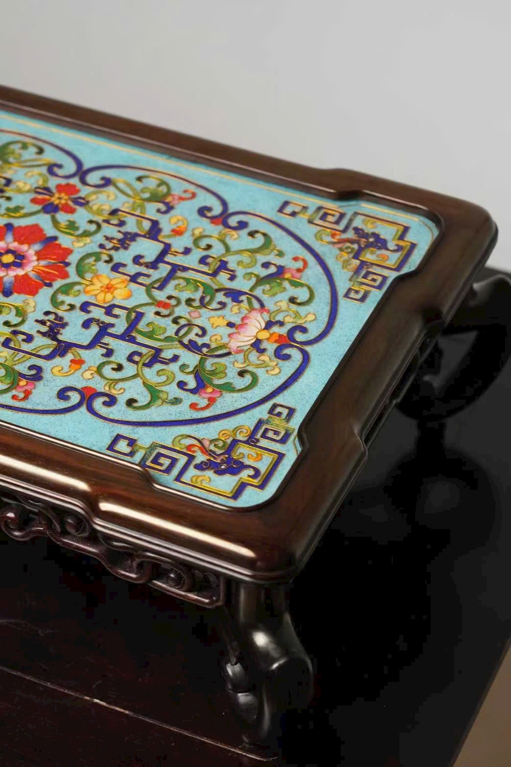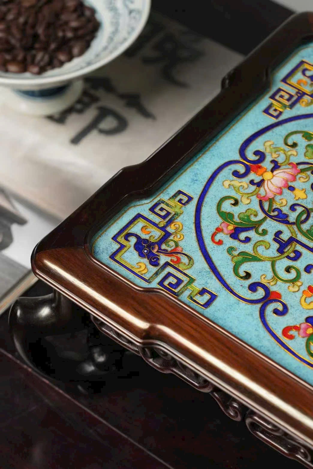 Tác phẩm được chế tác hoàn toàn thủ công từ gỗ đại hồng toan chi quý hiếm, phối hợp kỹ nghệ Cảnh Thái Lam (Cloisonné) truyền thống. Hoa văn khảm men uốn dây tinh xảo, sắc men trong sáng, đường nét uyển chuyển, thể hiện khí chất trang nhã và hoàng gia.