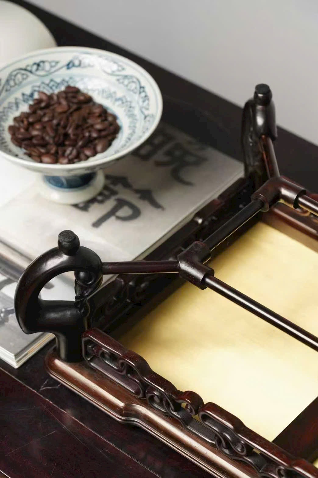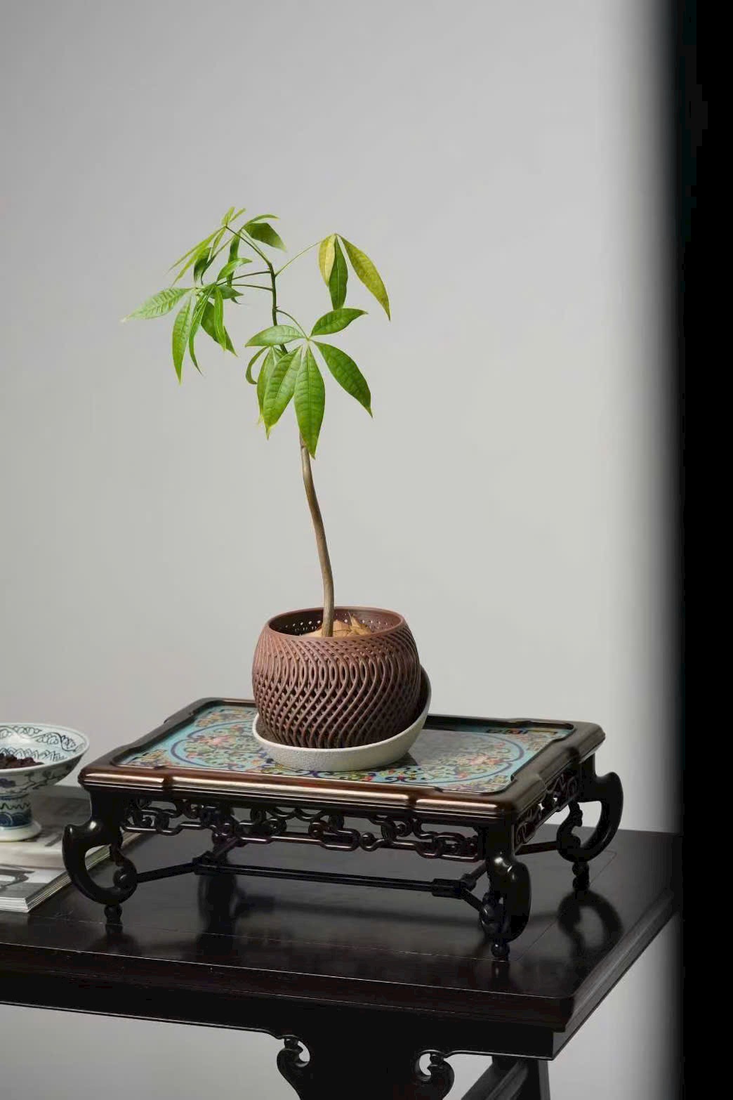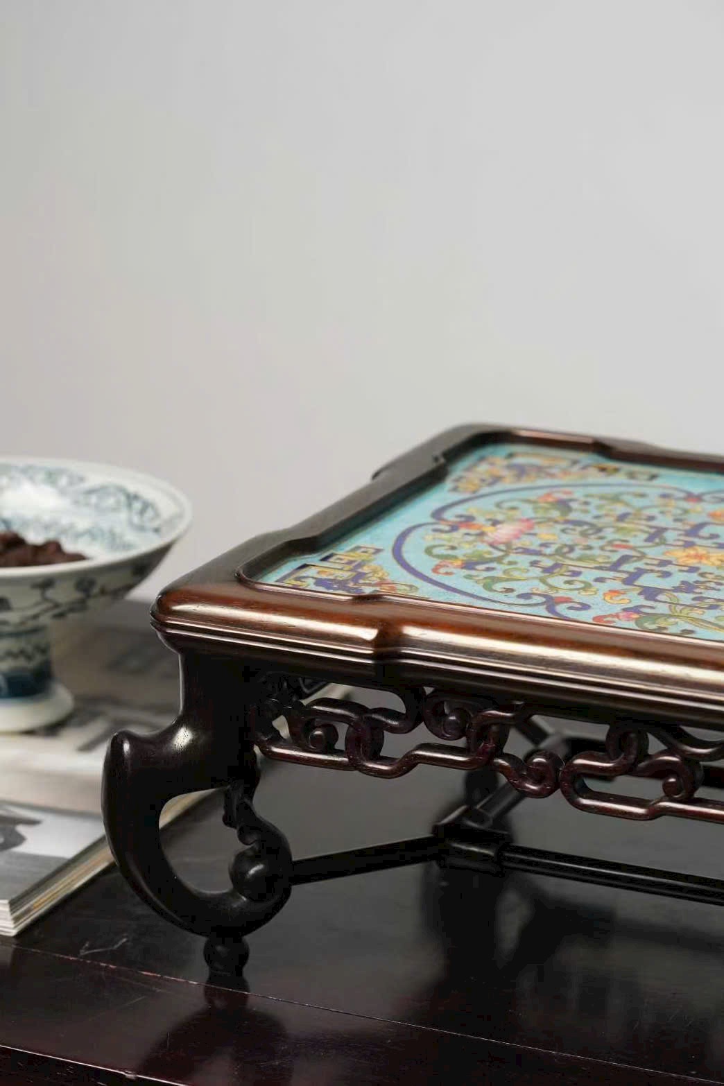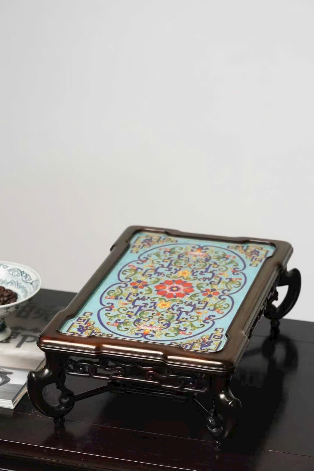 Tác phẩm được chế tác hoàn toàn thủ công từ gỗ đại hồng toan chi quý hiếm, phối hợp kỹ nghệ Cảnh Thái Lam (Cloisonné) truyền thống. Hoa văn khảm men uốn dây tinh xảo, sắc men trong sáng, đường nét uyển chuyển, thể hiện khí chất trang nhã và hoàng gia.