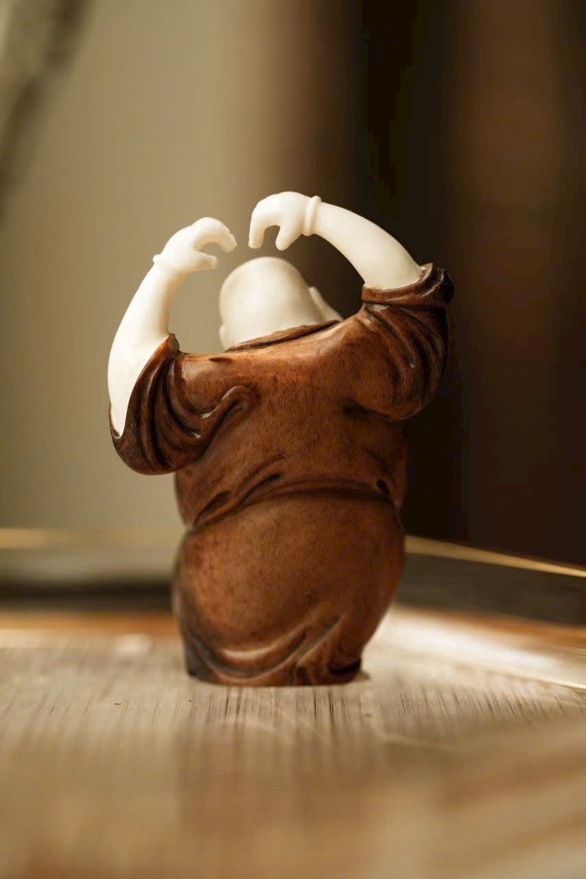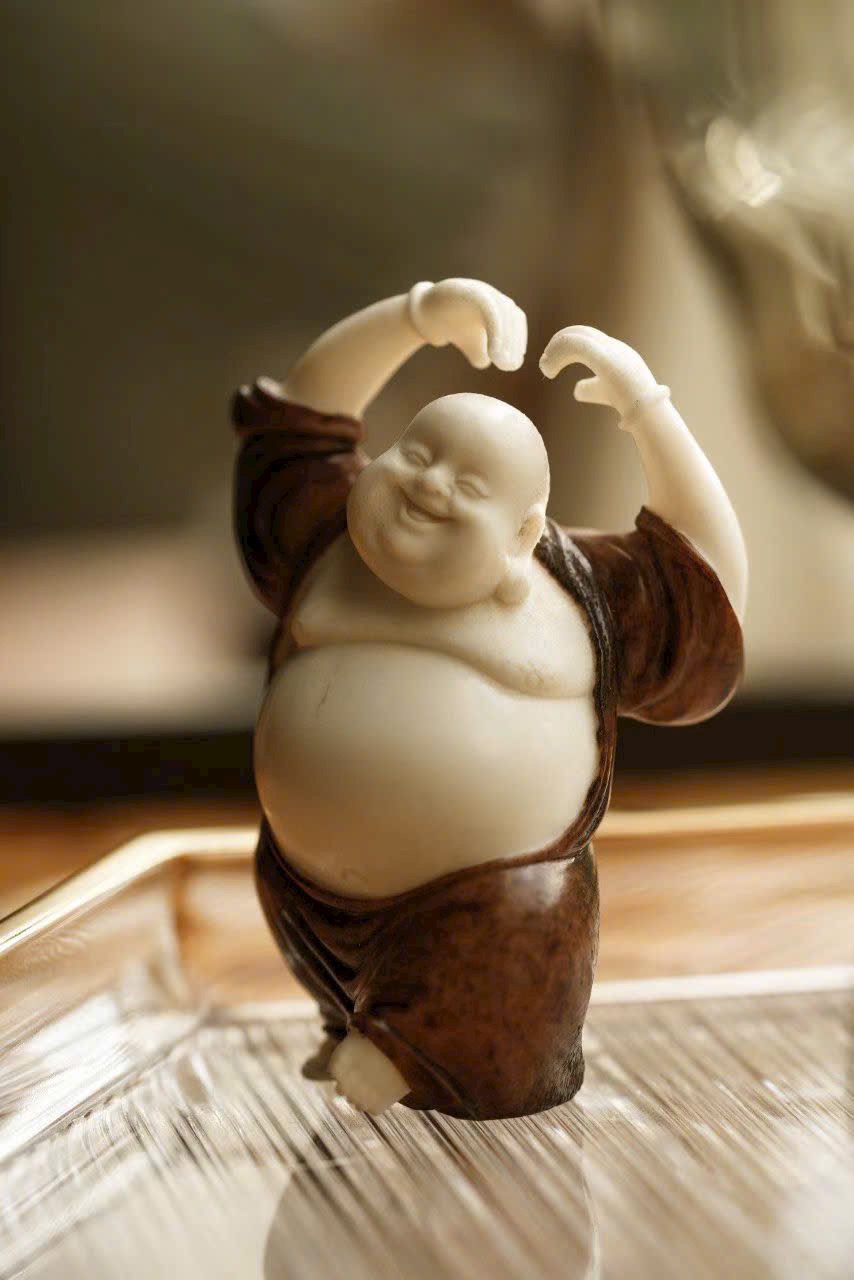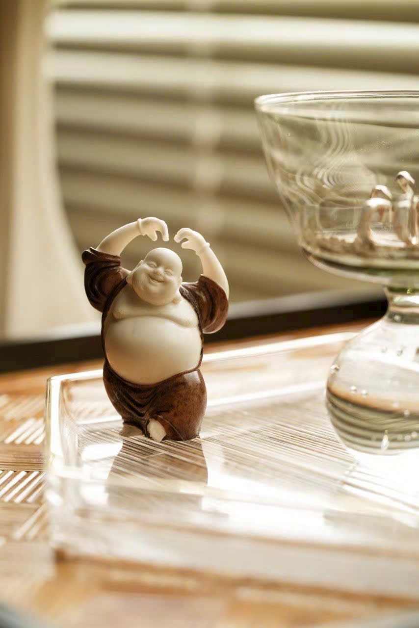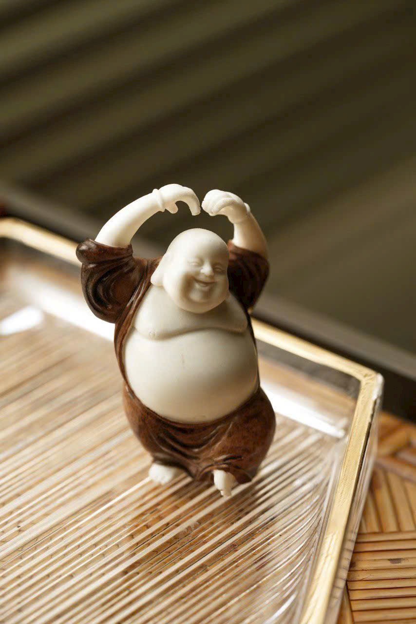 Chế tác thủ công hoàn toàn, dáng đứng sinh động, thân hình uốn lượn nhẹ với động tác phóng khoáng. Gương mặt hiền hòa, nụ cười rạng rỡ, toát lên thần thái thiền vị ấm áp. Tay áo dài mềm rủ chạm đất, tạo cảm giác bay bổng, tổng thể giản lược hoa văn nhưng đầy khí chất.