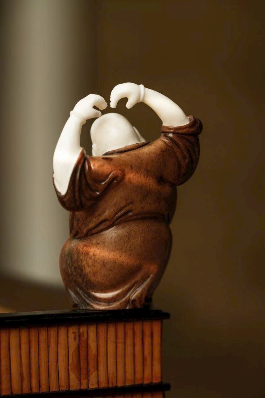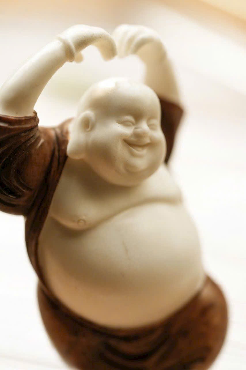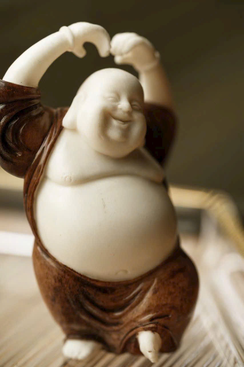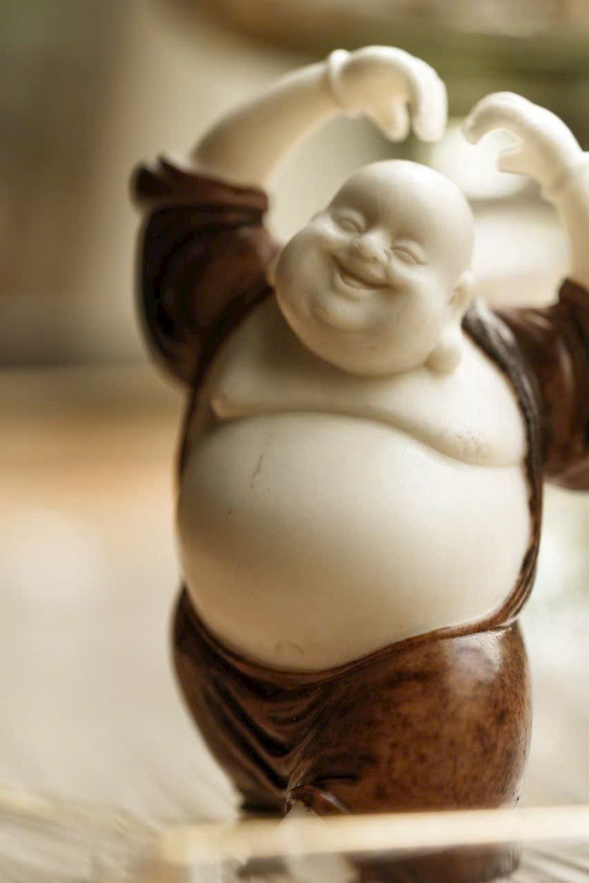 Chế tác thủ công hoàn toàn, dáng đứng sinh động, thân hình uốn lượn nhẹ với động tác phóng khoáng. Gương mặt hiền hòa, nụ cười rạng rỡ, toát lên thần thái thiền vị ấm áp. Tay áo dài mềm rủ chạm đất, tạo cảm giác bay bổng, tổng thể giản lược hoa văn nhưng đầy khí chất.