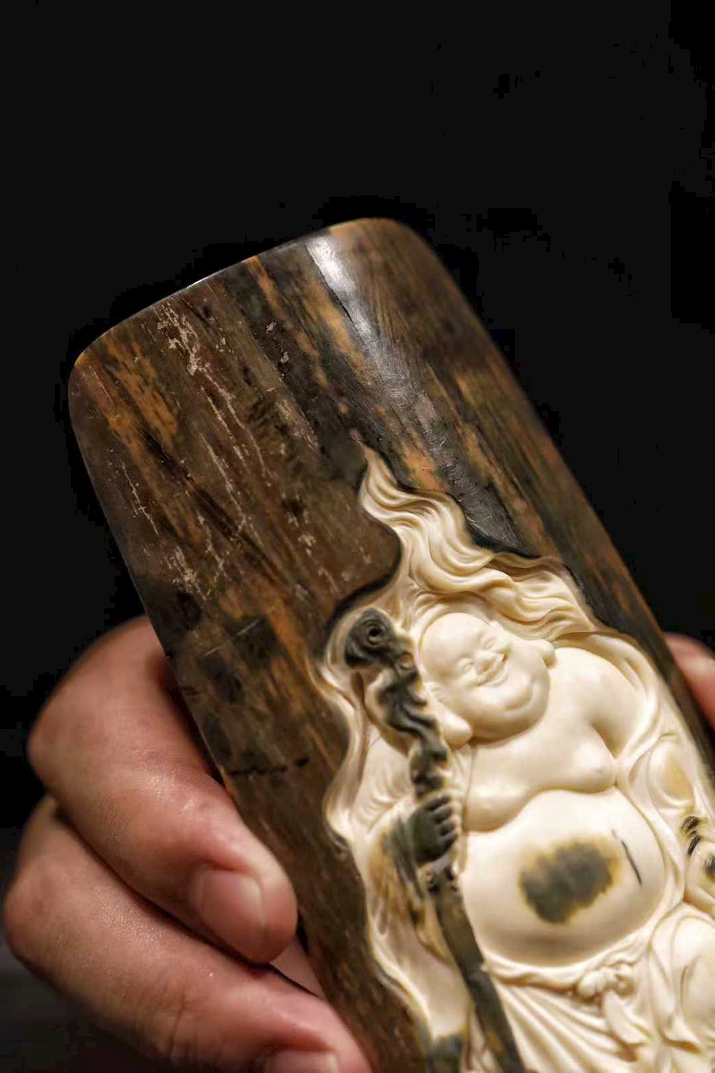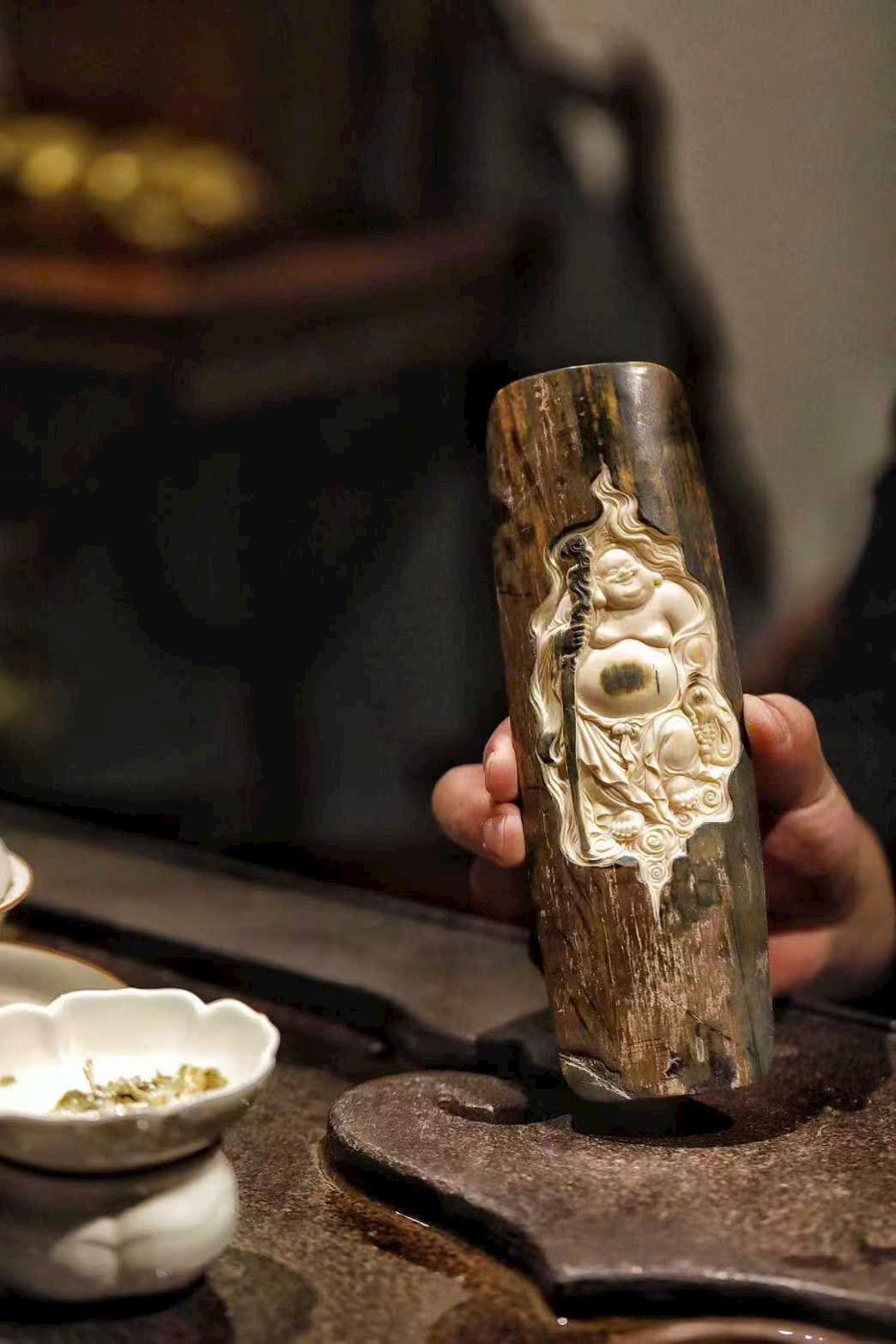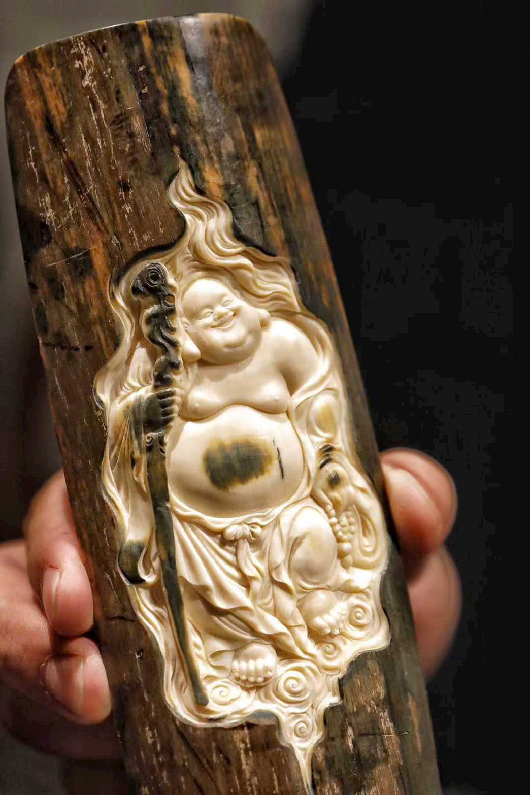 Dùng n.gà ma mút lam bì để chế tác muỗng trà: giữ nguyên vân da tự nhiên của lớp ngoài, trên đó chạm sâu hình Phật Di Lặc — bụng phệ khoan hòa, tay cầm gậy, nếp áo mềm rũ kèm mây văn.