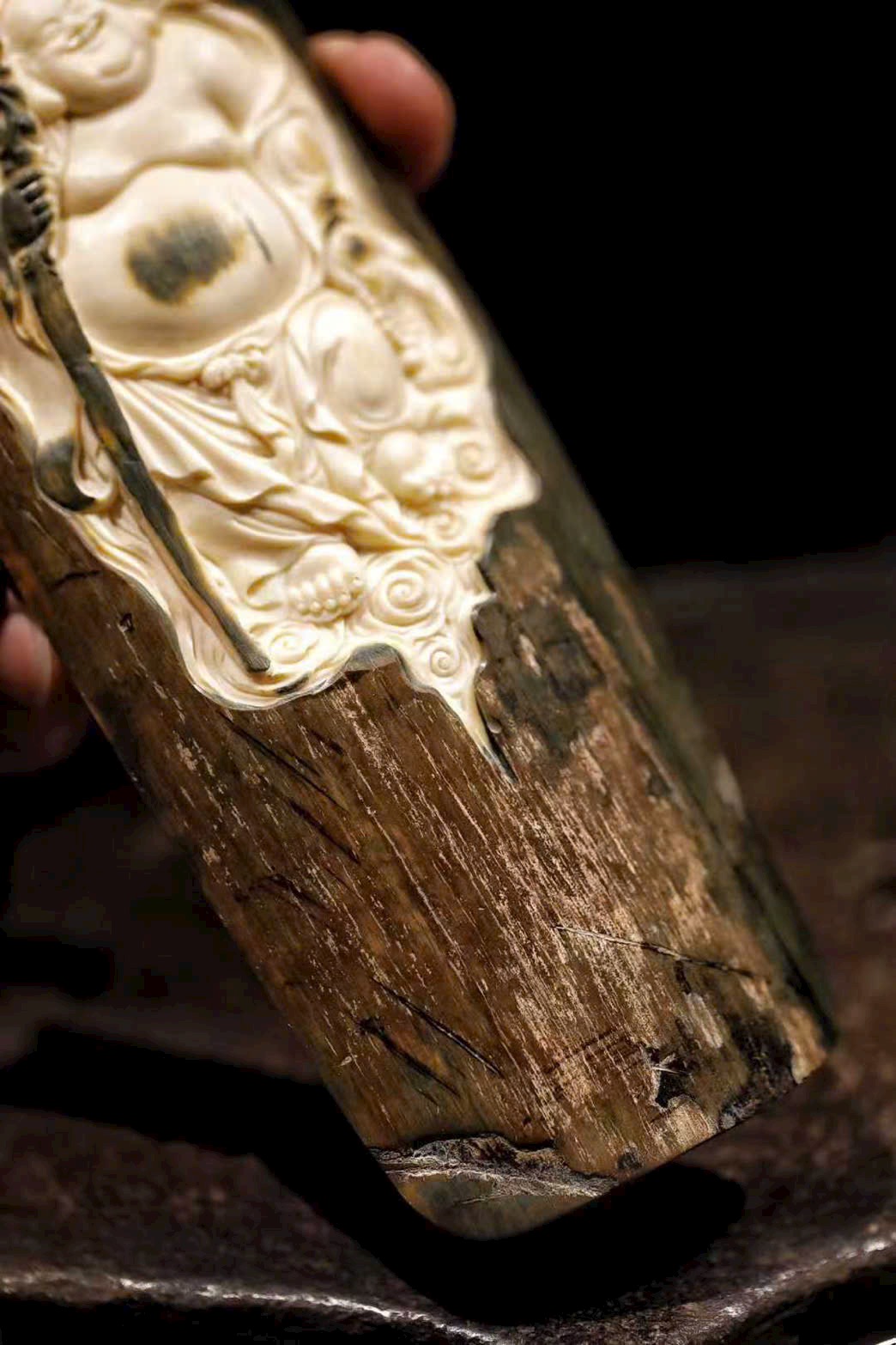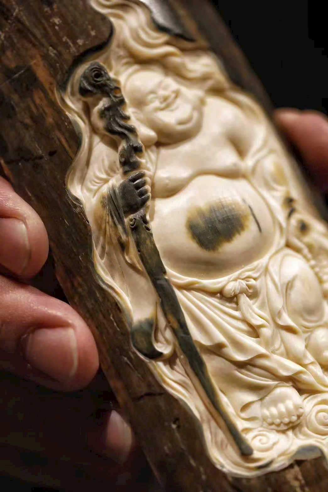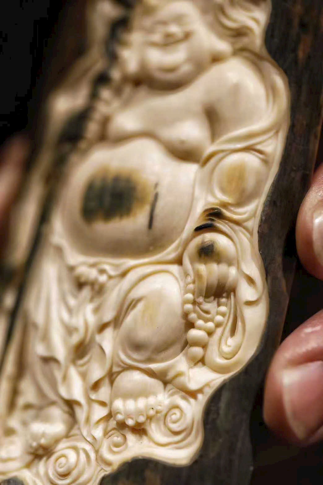 Dùng n.gà ma mút lam bì để chế tác muỗng trà: giữ nguyên vân da tự nhiên của lớp ngoài, trên đó chạm sâu hình Phật Di Lặc — bụng phệ khoan hòa, tay cầm gậy, nếp áo mềm rũ kèm mây văn.