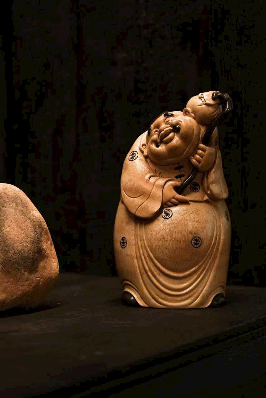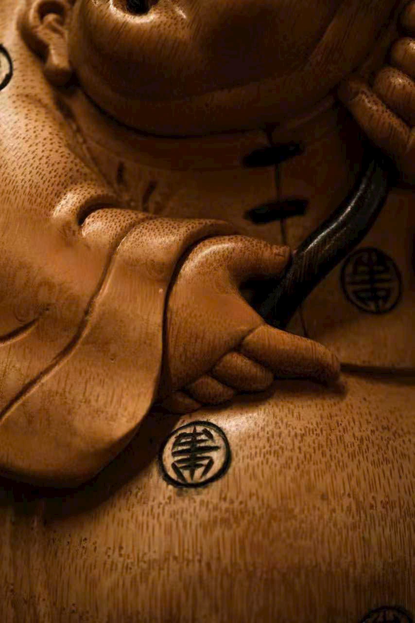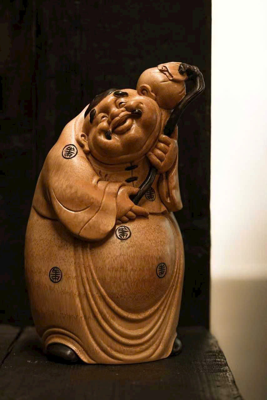 Toàn bộ được chạm khắc thủ công, hình khối tròn đầy, mượt mà, toát lên thần thái hiền hậu và phú quý viên mãn. Nhân vật tay nắm túi tiền, dáng vẻ chính trực mà vẫn mang nét tham tài, ham sắc, thể hiện sinh động tính cách đời thường. Bày trên bàn làm việc hay phòng khách đều mang ý nghĩa phú quý, an nhàn và sung túc.