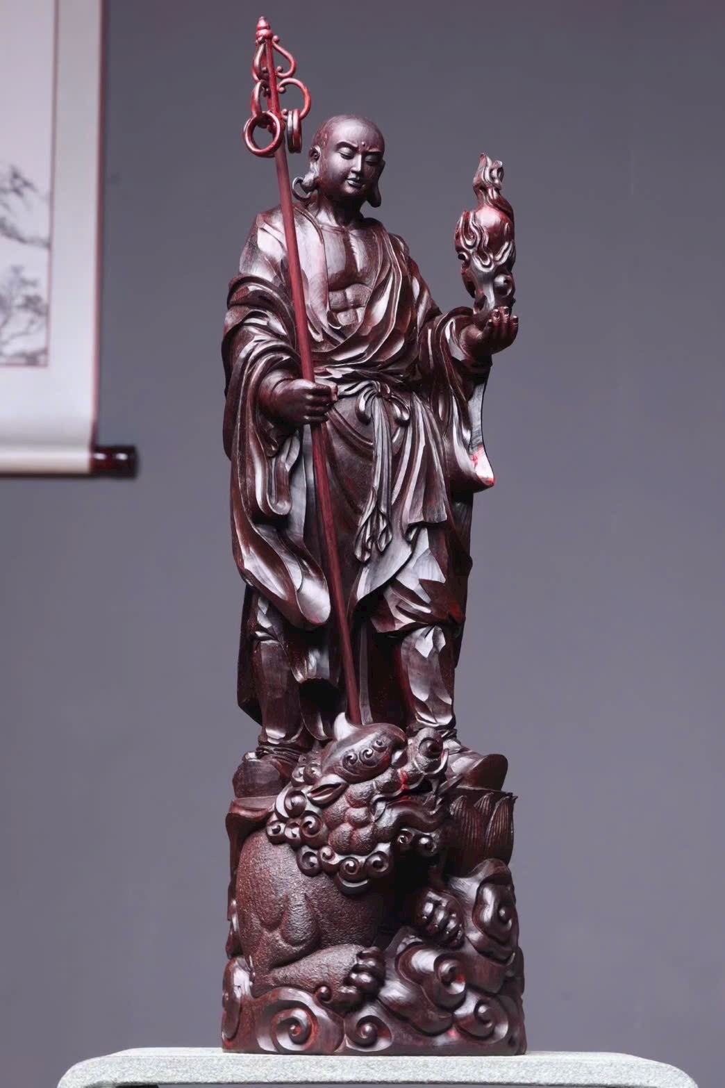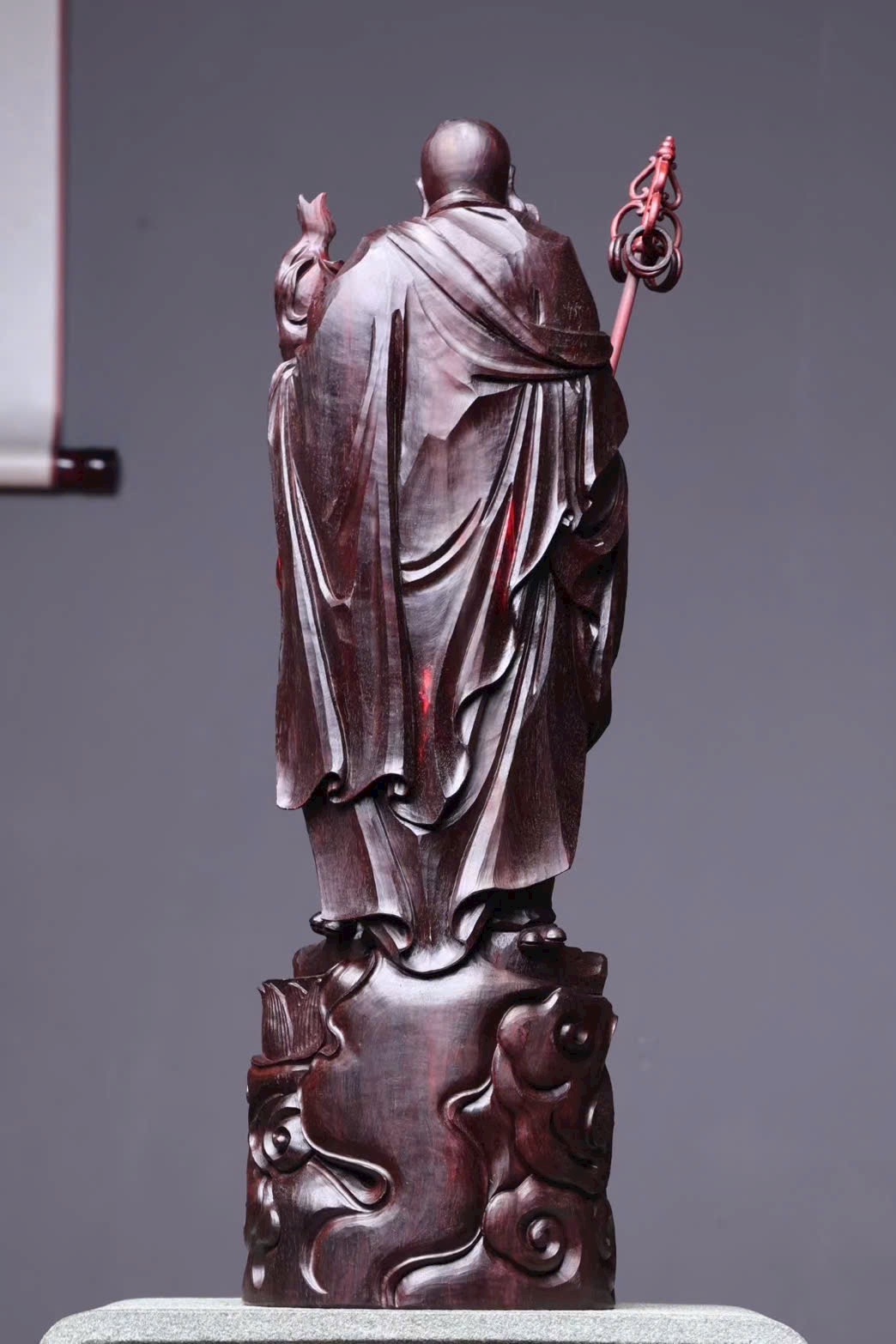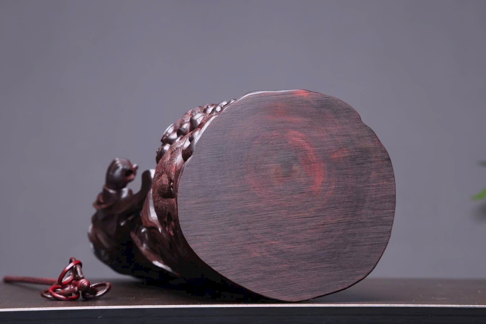Tác phẩm điêu khắc từ gỗ tử đàn Ấn Độ loại tiểu diệp, chất gỗ già lấy phôi từ phần gỗ tháo nhà, độ dầu cao và vân gỗ mịn, chế tác bằng dao tay sắc nét.