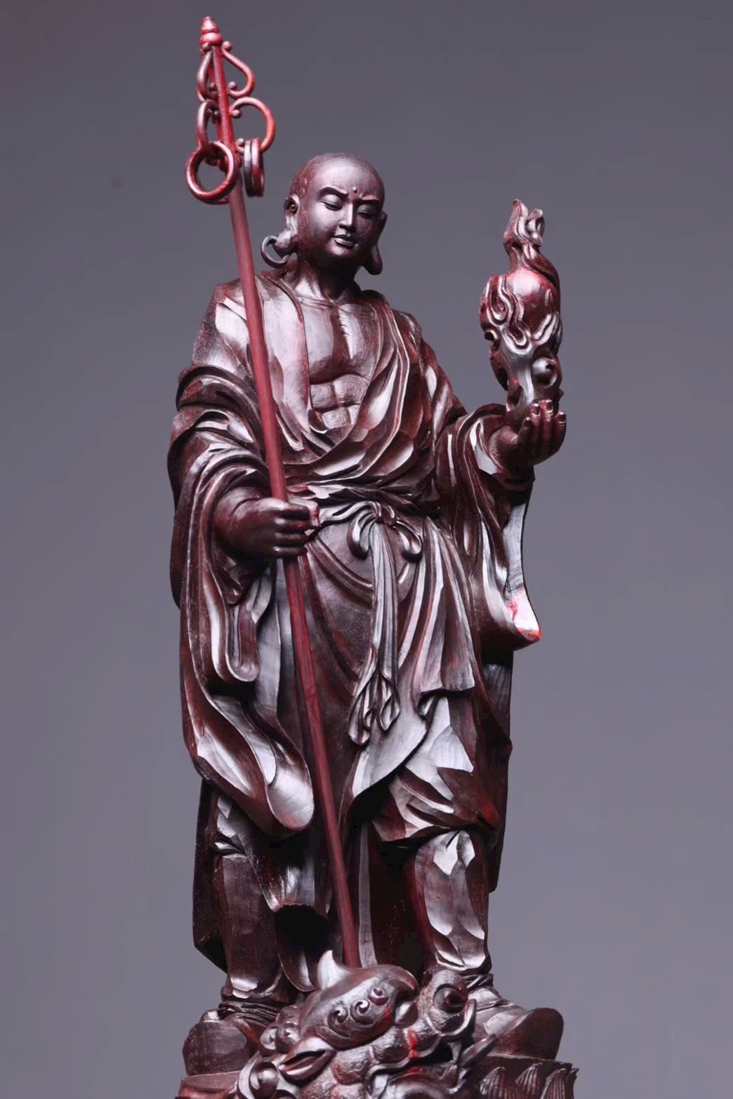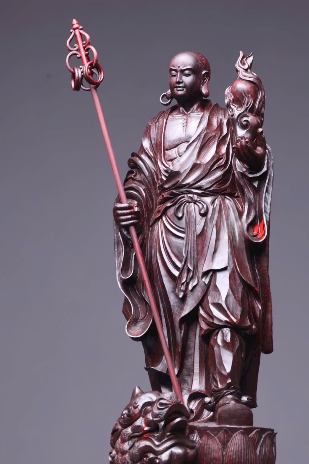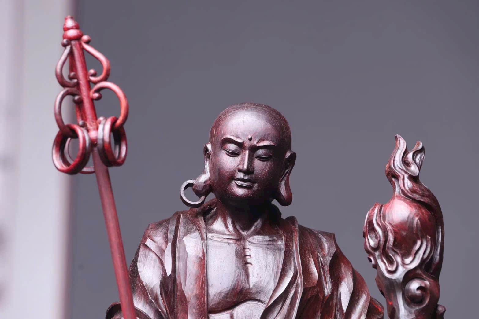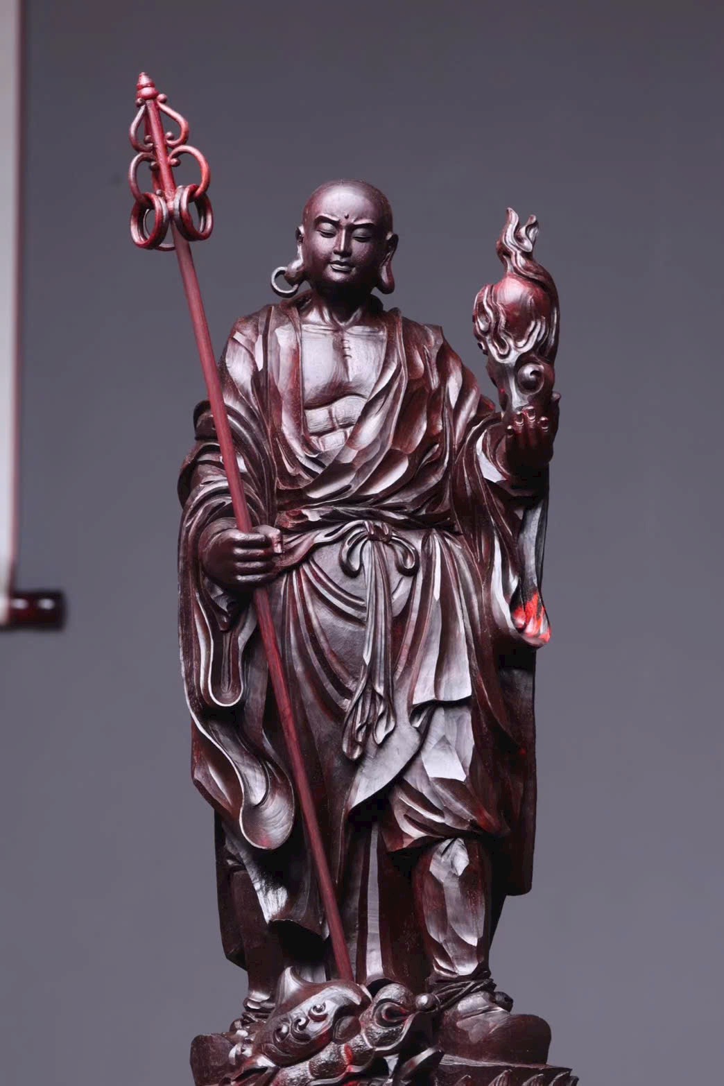 Tác phẩm điêu khắc từ gỗ tử đàn Ấn Độ loại tiểu diệp, chất gỗ già lấy phôi từ phần gỗ tháo nhà, độ dầu cao và vân gỗ mịn, chế tác bằng dao tay sắc nét.