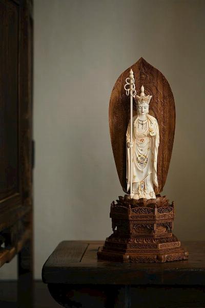 Chất liệu ấm nhuận, cổ phác tao nhã. Địa Tạng Bồ Tát đội mũ Tỳ Lô, tai dài buông xuống, mày mắt từ hòa, ngực đeo anh lạc. Tay trái nâng bảo châu, tay phải cầm pháp trượng, tĩnh tọa trên tòa sen. Sơn màu sinh động, trang nghiêm cao quý.