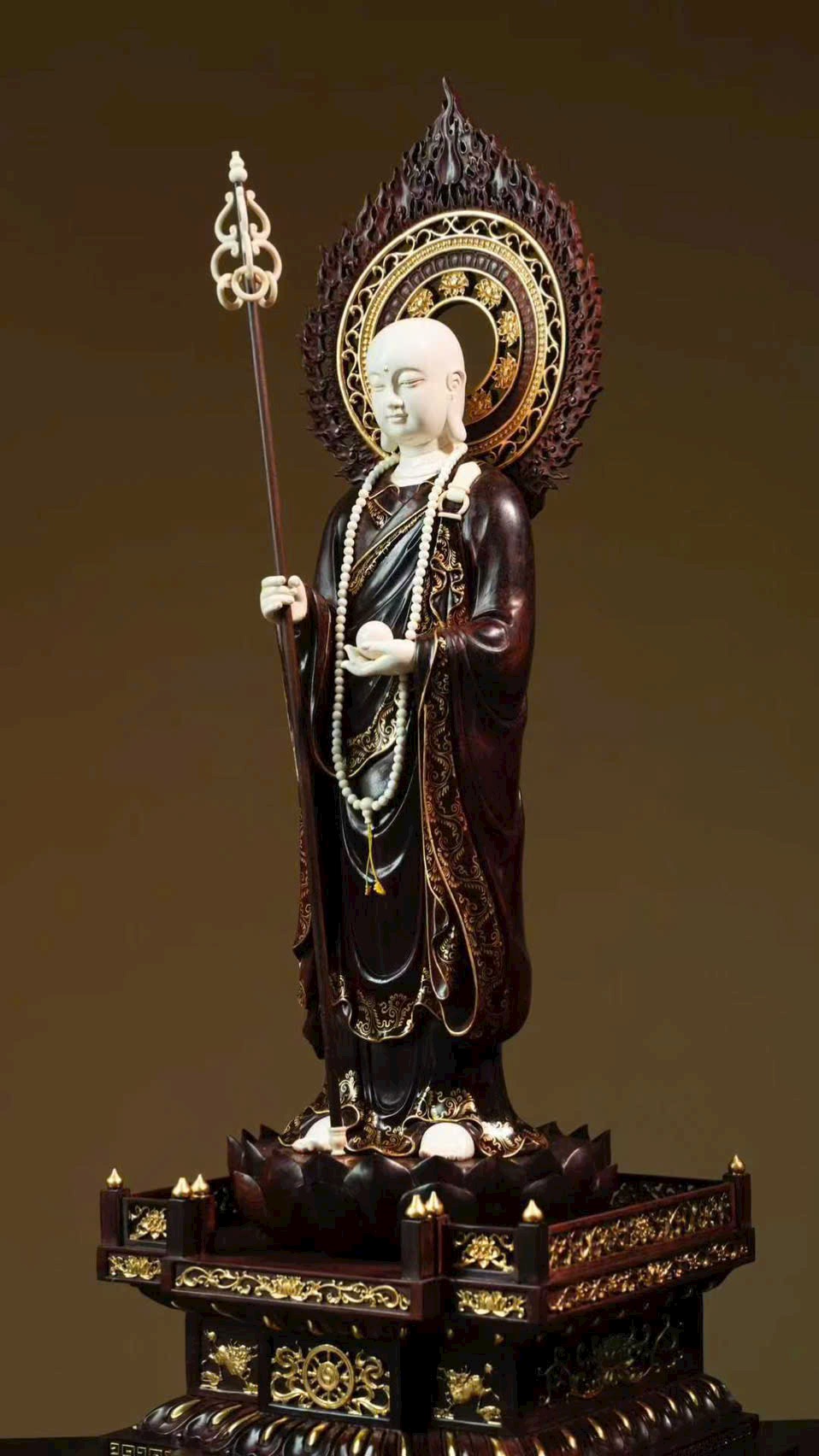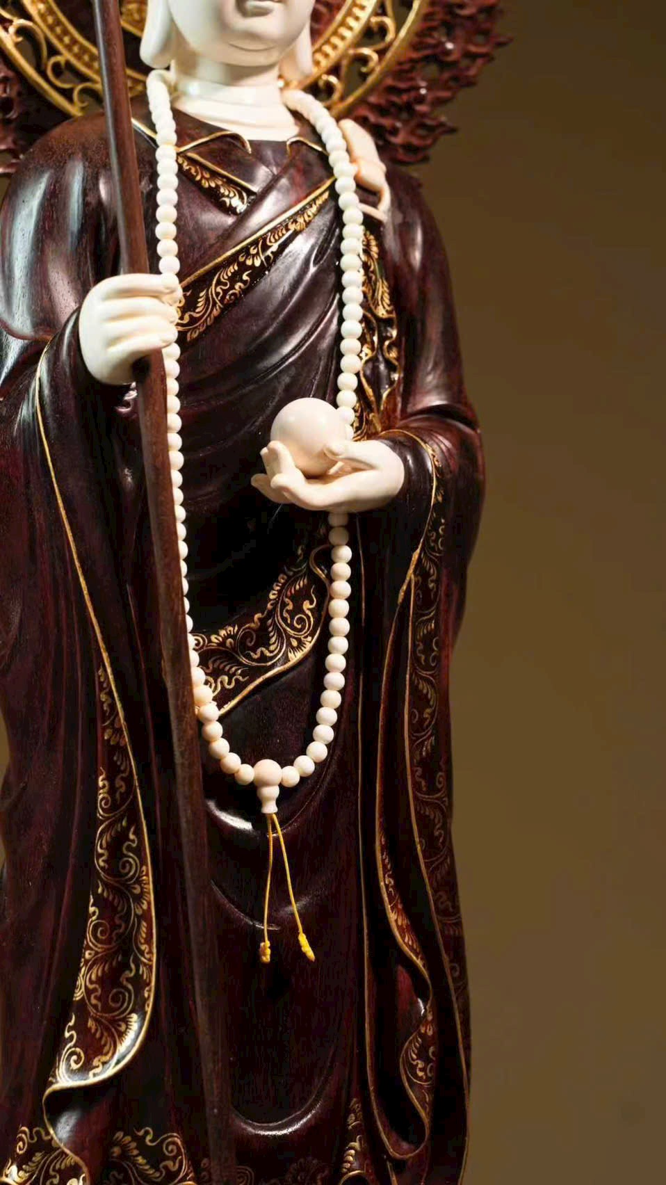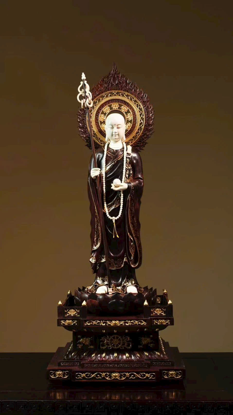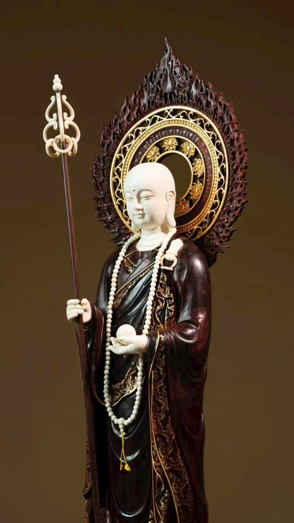 Tuyển chọn chất liệu thanh nhuận, được chạm khắc tinh tế đến từng vi vi, kỹ nghệ khảm ghép nhuần nhuyễn nhất thể. Địa Tạng Vương cúi mắt trầm tư, bảo y buông rủ tự nhiên, khí vận tĩnh sâu mà không mất vẻ phiêu dật, trong sự hòa bình toát lên ý vị an nhẫn.