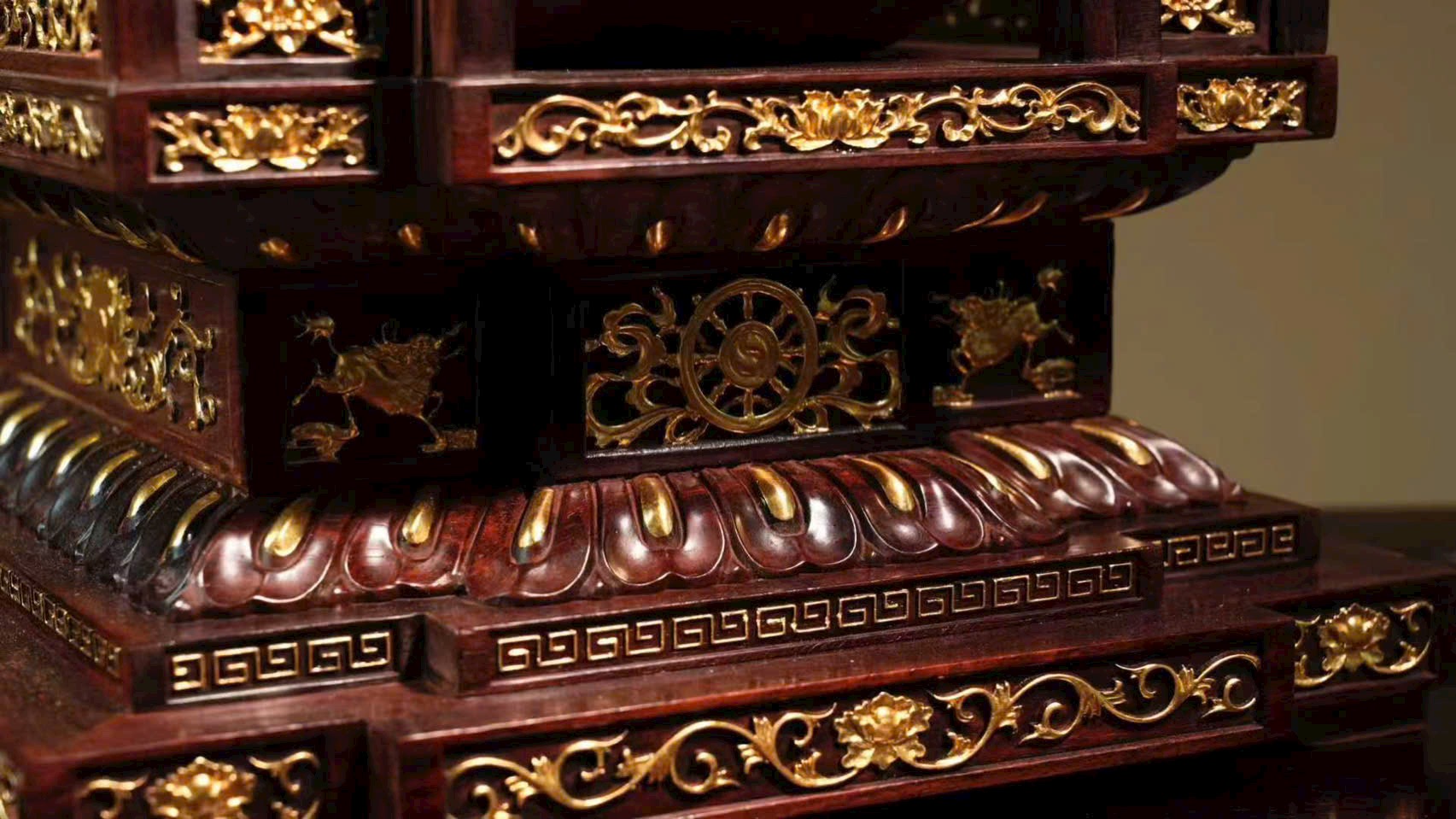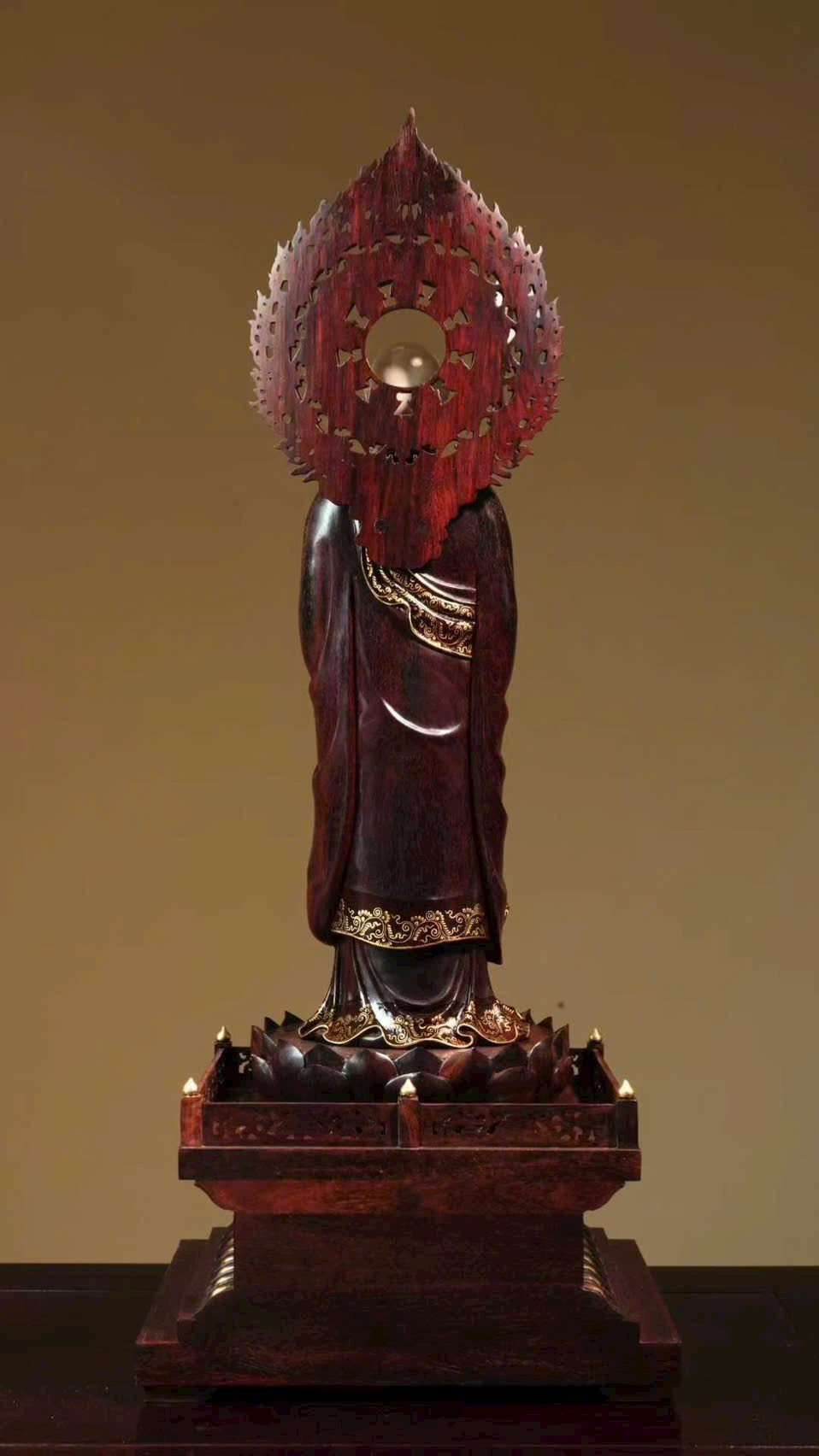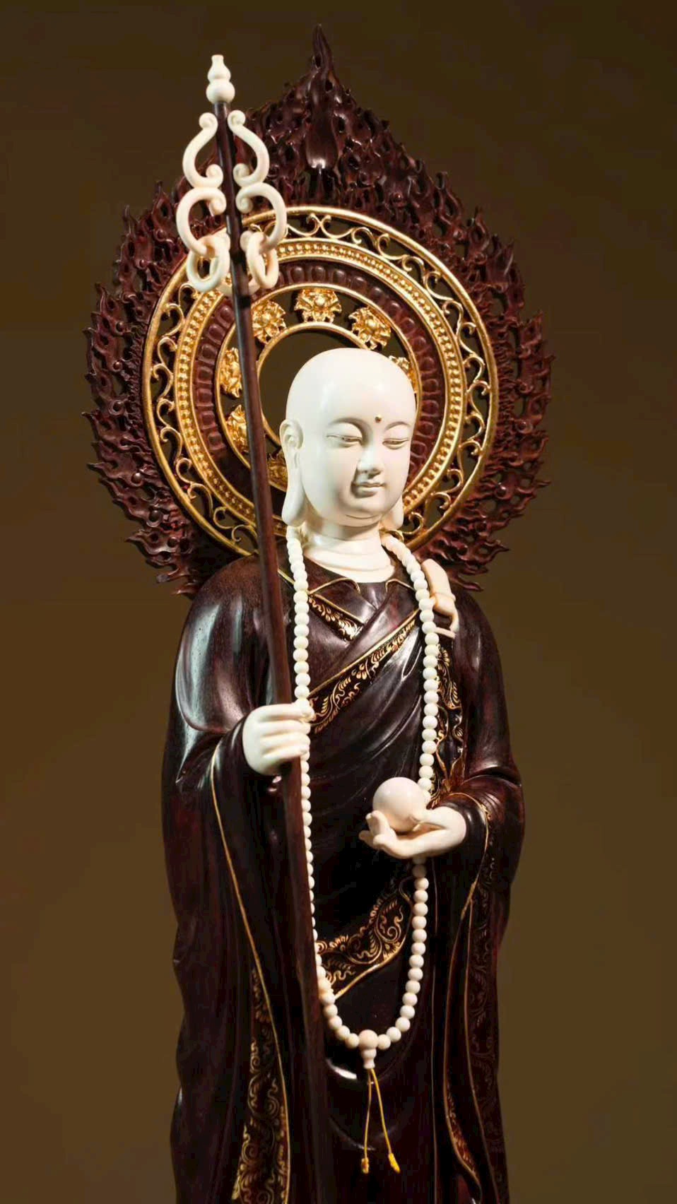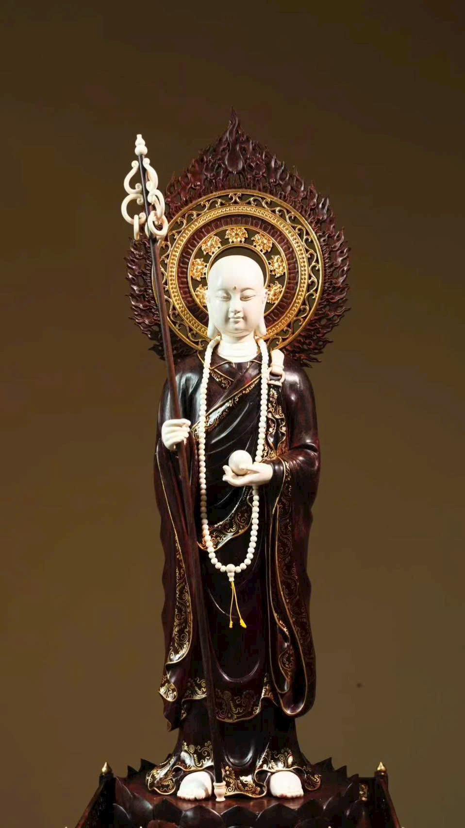 Tuyển chọn chất liệu thanh nhuận, được chạm khắc tinh tế đến từng vi vi, kỹ nghệ khảm ghép nhuần nhuyễn nhất thể. Địa Tạng Vương cúi mắt trầm tư, bảo y buông rủ tự nhiên, khí vận tĩnh sâu mà không mất vẻ phiêu dật, trong sự hòa bình toát lên ý vị an nhẫn.
