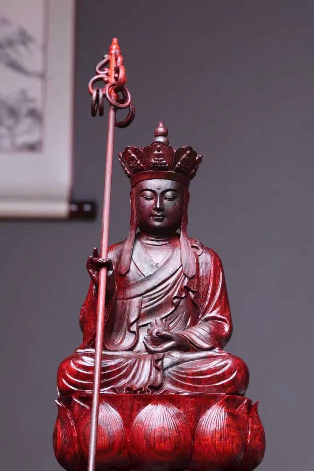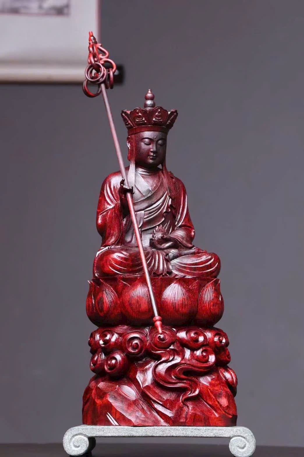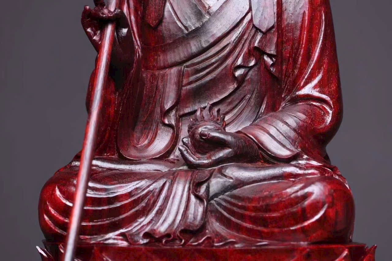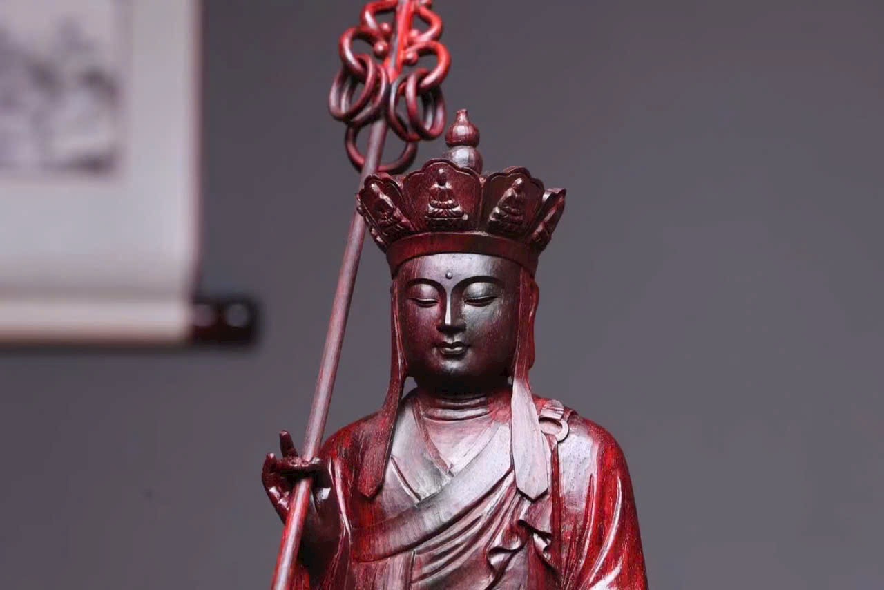 Tượng Địa Tạng Vương Bồ Tát đầu đội tỳ-lô quan, tay cầm tích trượng pháp khí, dáng ngồi an định, pháp tướng từ bi trang nghiêm, thể hiện đại nguyện “địa ngục vị không, thệ bất thành Phật”. Bày tại gia giúp hóa giải tai ương, hộ trạch an thân, tích phúc tăng thọ.