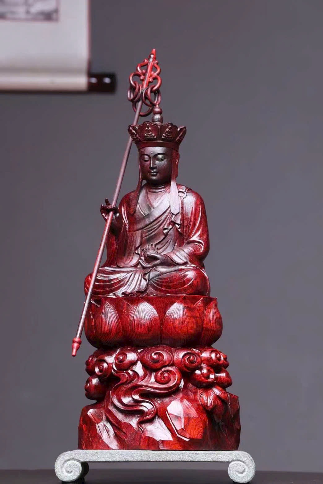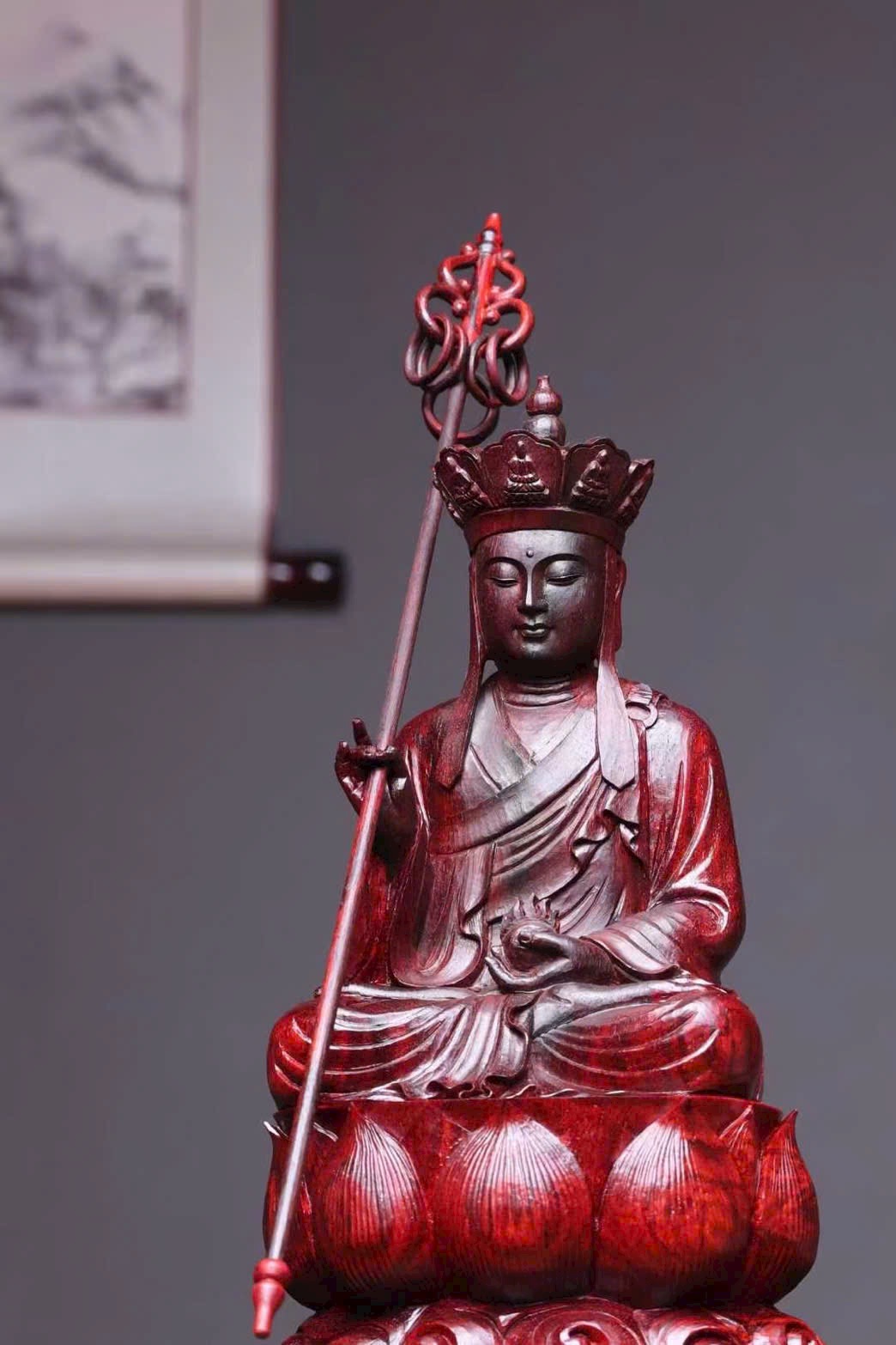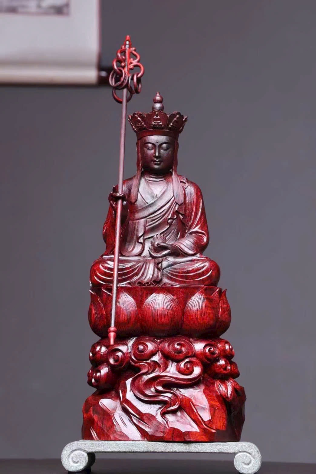 Tượng Địa Tạng Vương Bồ Tát đầu đội tỳ-lô quan, tay cầm tích trượng pháp khí, dáng ngồi an định, pháp tướng từ bi trang nghiêm, thể hiện đại nguyện “địa ngục vị không, thệ bất thành Phật”. Bày tại gia giúp hóa giải tai ương, hộ trạch an thân, tích phúc tăng thọ.