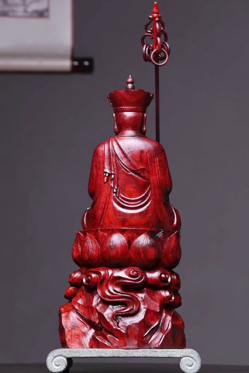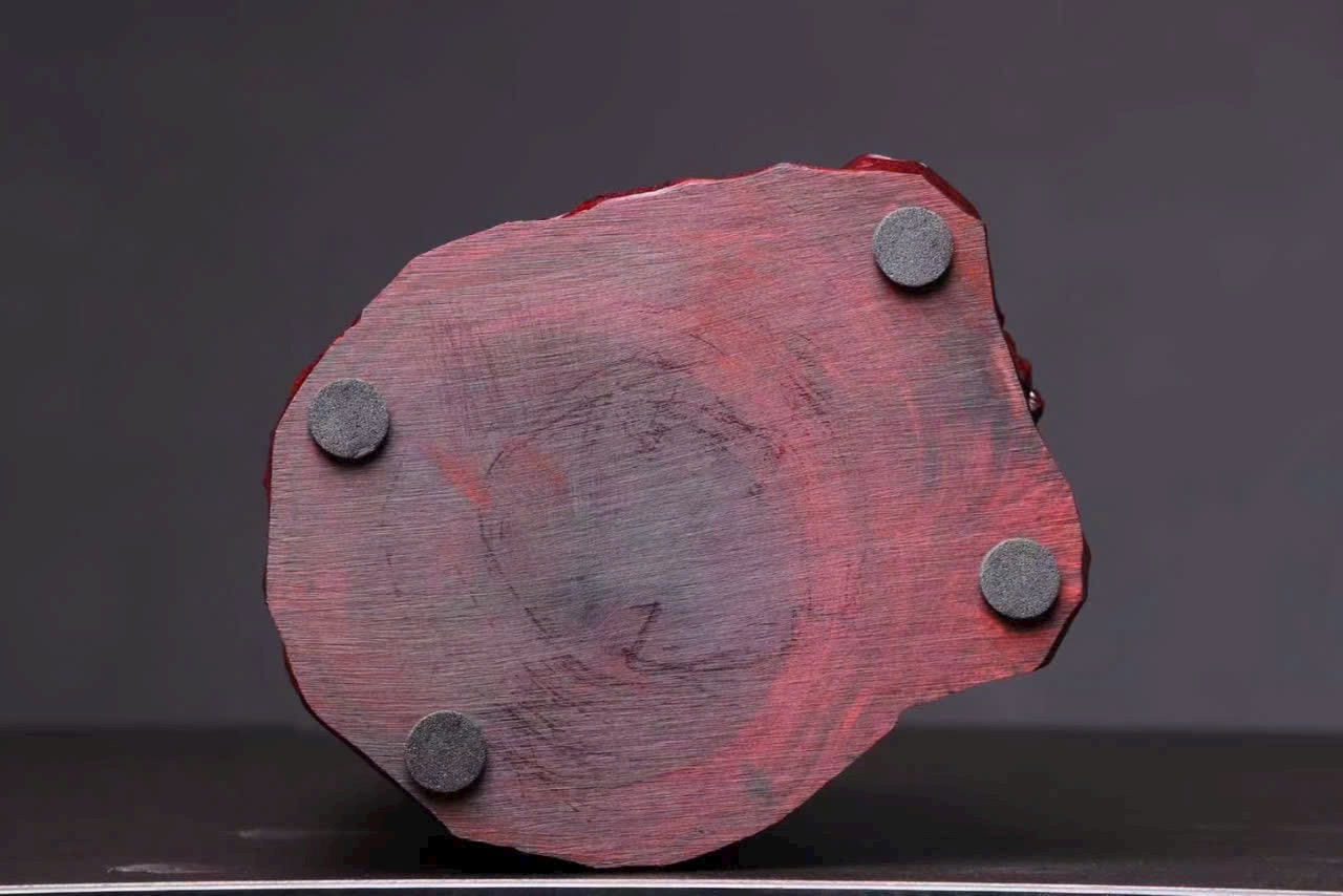 Tác phẩm được chế tác từ gỗ tử đàn Ấn Độ tiểu diệp, chọn liệu già – dầu cao – mật độ dày đặc, sắc gỗ đỏ sẫm trầm tĩnh, mang hơi thở linh mộc cổ hương. Toàn khối điêu khắc thủ công bằng dao trơn, giữ lại nét mộc mạc tự nhiên mà tinh tế.