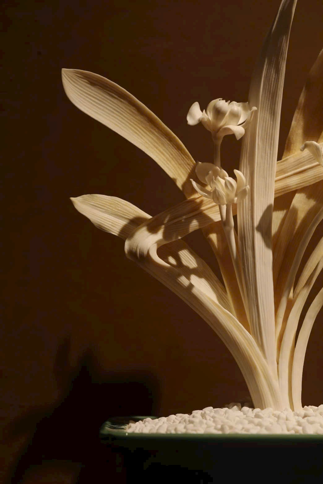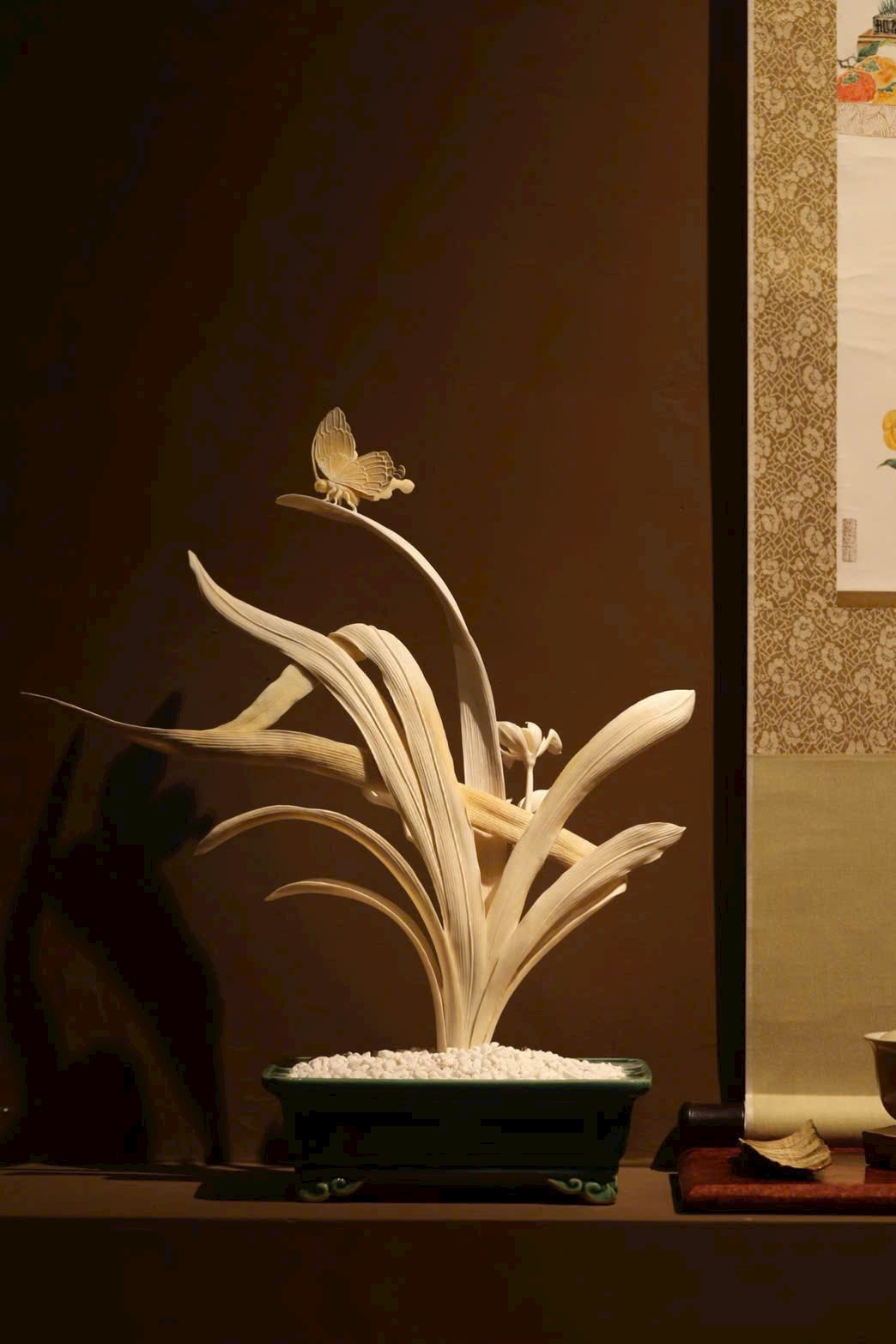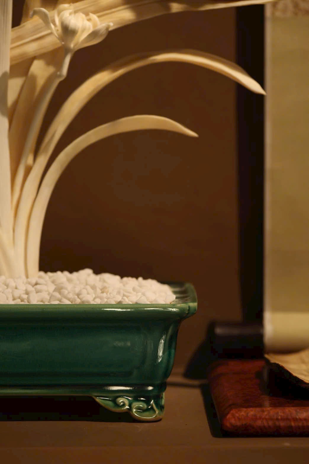 Đường dao phóng khoáng, hoa lá vươn nở thanh nhã, dáng đứng trang nhã tinh tế, động – tĩnh hài hòa, tràn đầy sinh khí. Tựa như làn gió nhẹ lướt qua, hương thơm kín đáo lan tỏa. Bày trên án thư, lặng lẽ tỏa hương, bốn mùa như hoa nở không tàn. Kết hợp chậu đế gốm sứ.